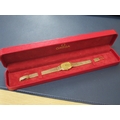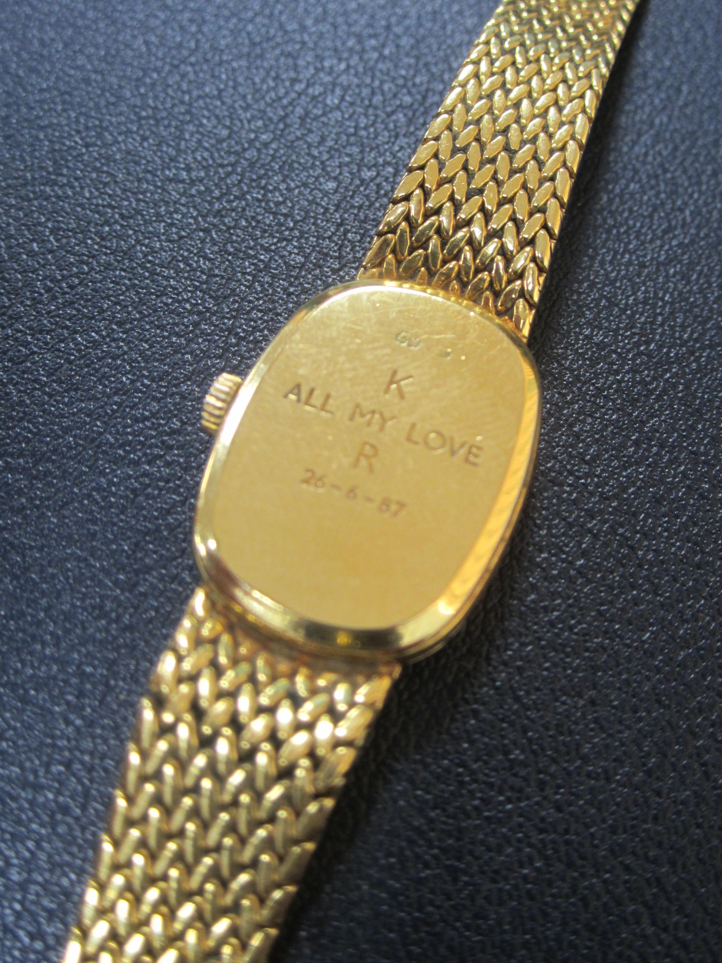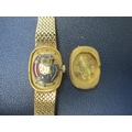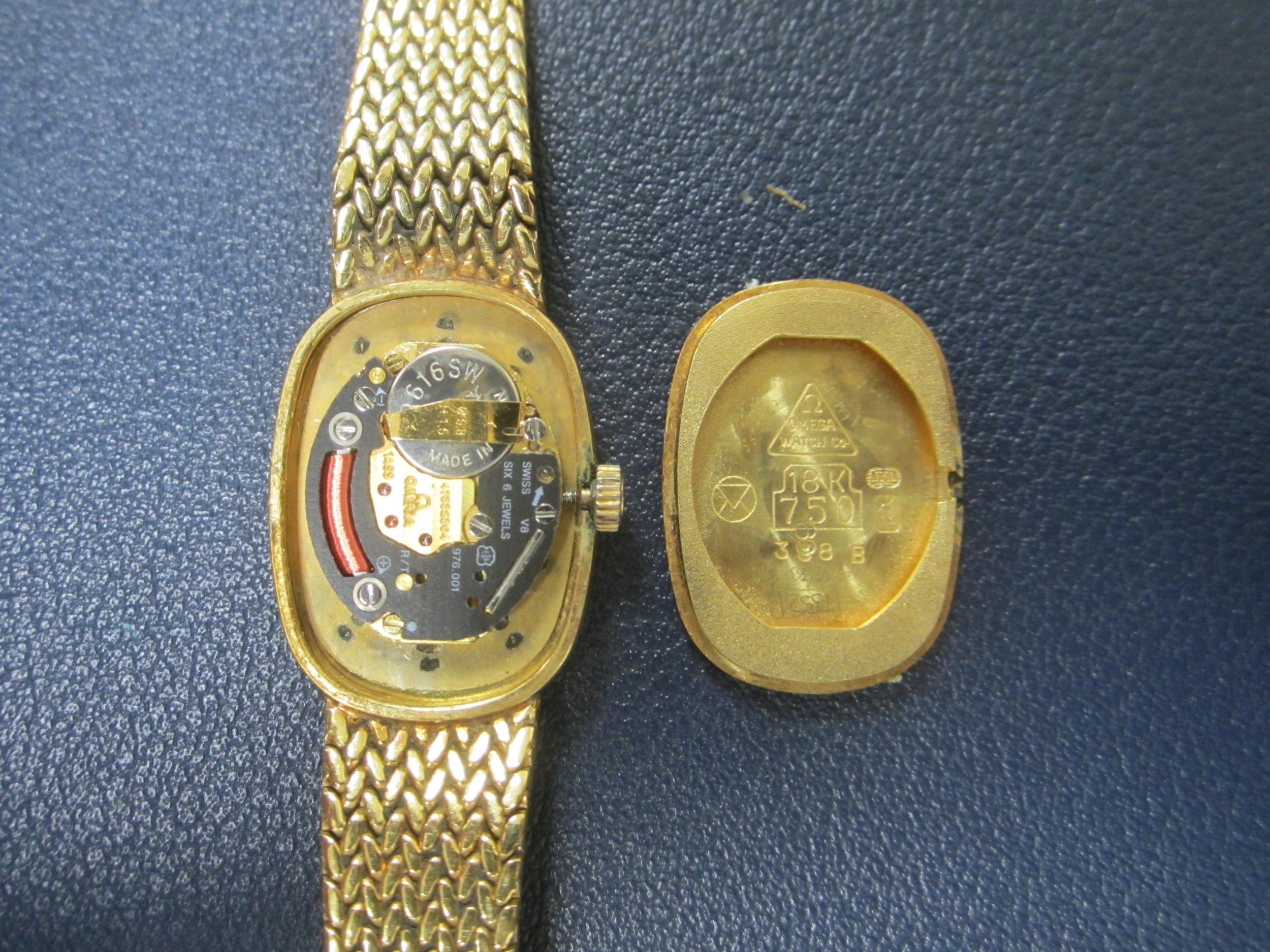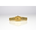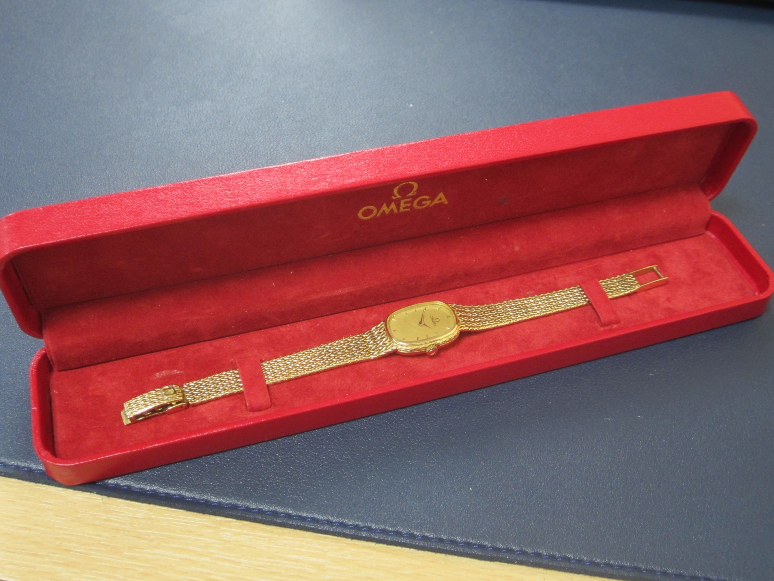 Omega: A lady's 18ct gold bracelet watch Reference: 791.338 Date: Circa 1982 Movement: Omega Cal.1455, 6 jewel, quartz Dial: Gold matt, applied baton hour markers, faceted gold hands Case: Textured and polished oval form, snap-on back, pull-out logo crown, stamped 18ct inside case back Strap/Bracelet: Integral mesh bracelet Buckle/Clasp: Textured logo jewellery clasp, stamped 18ct Size: 17mm Weight: 31g gross Accompaniments: Omega box Condition:• Case and back: Minor abrasions consistent with age and use. Some wear to plating on crown. • Crystal: Some visible scratches at 7 and a tiny chip to the edge also at 7. • Dial: Good. • Hands: Good. • Strap: Good. • Movement: Requires new battery. Not tested. Unless otherwise stated, all watches are likely to have been serviced and/or repaired in their lifetime and may have had parts replaced. While a watch may be described as 'working' at the time of the report, they are not guaranteed for timekeeping - it is advised that all watches are inspected and serviced by a qualified jeweller or horologist before full use.