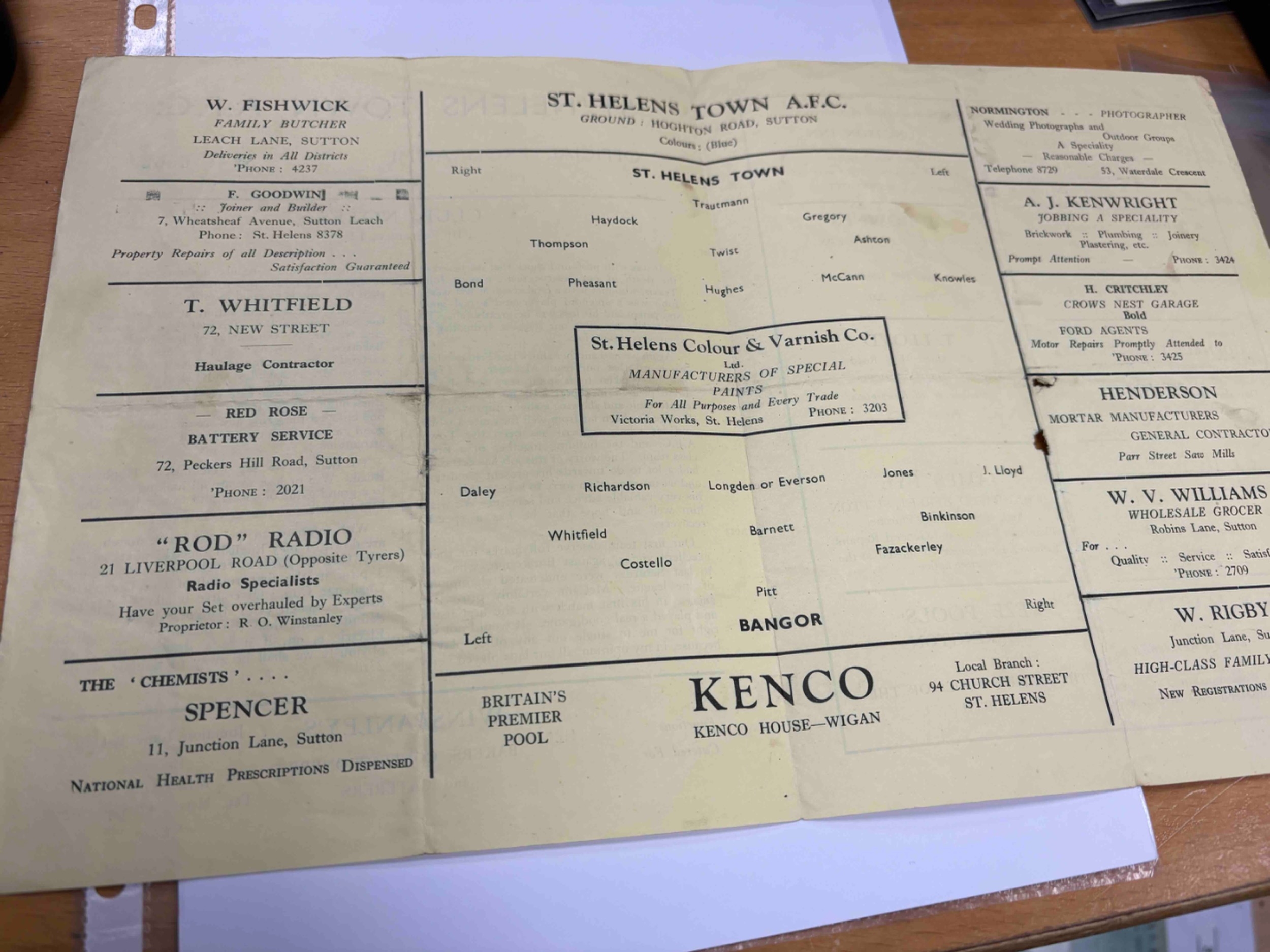 1948/9 St Helens v Bangor FAC folds small holes worn on the back includes Bert Trautmann