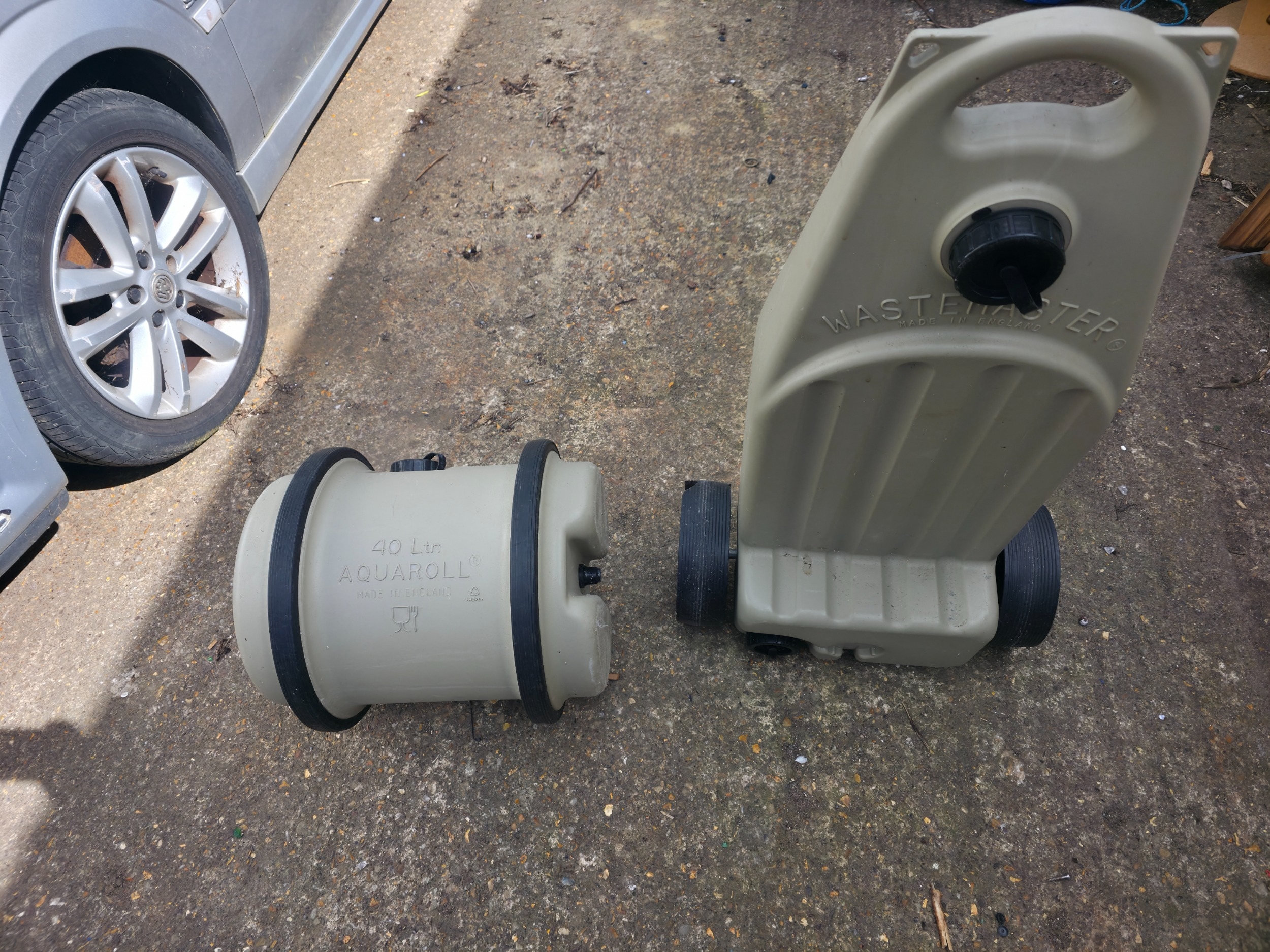 A pair of caravan/motorhome water accessories comprising a Wastemaster portable waste tank on wheels and an Aquaroll 40-litre fresh water carrier. Both in used condition with signs of outdoor use. Ideal for camping, caravanning or off-grid setups.