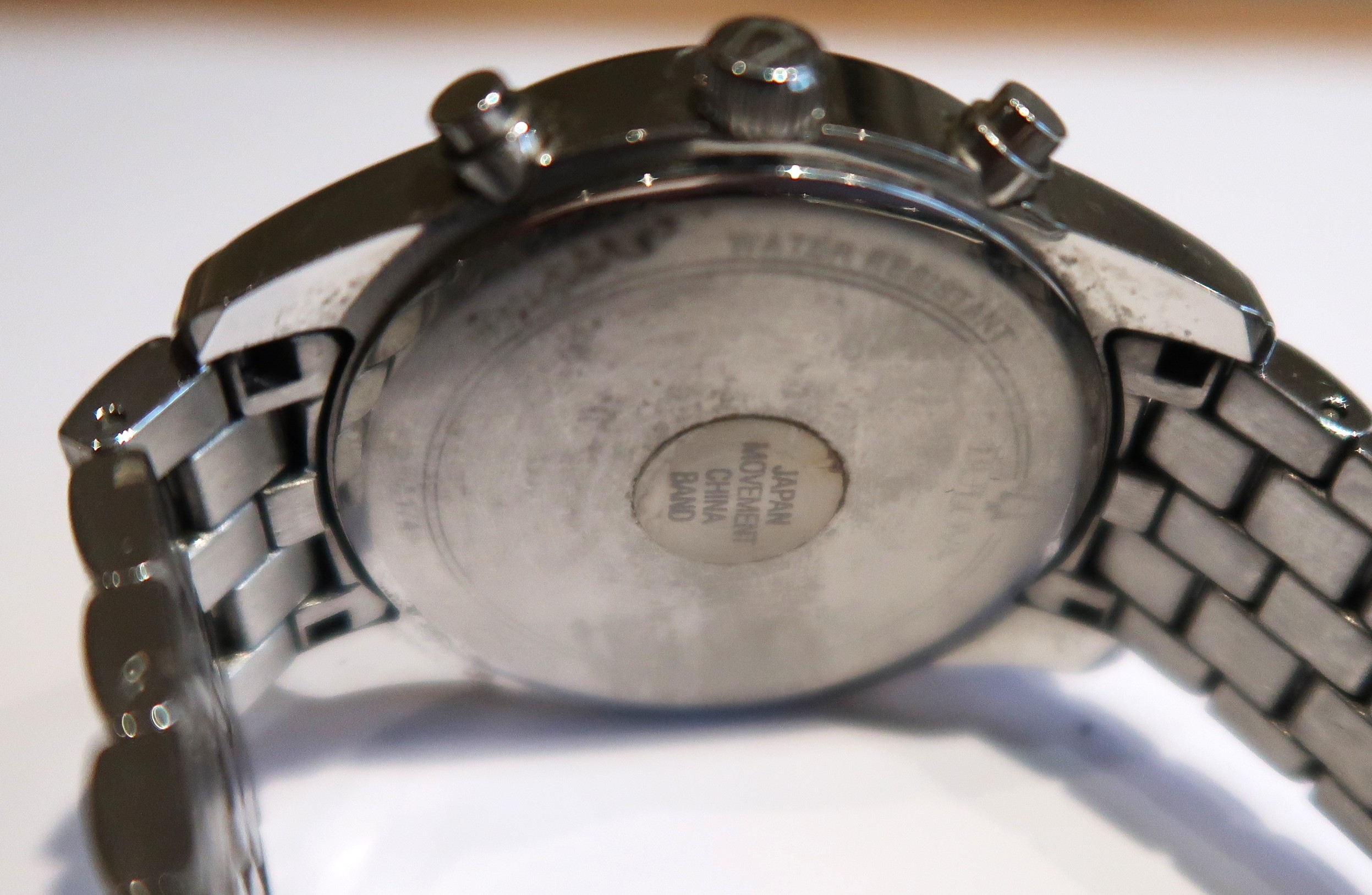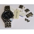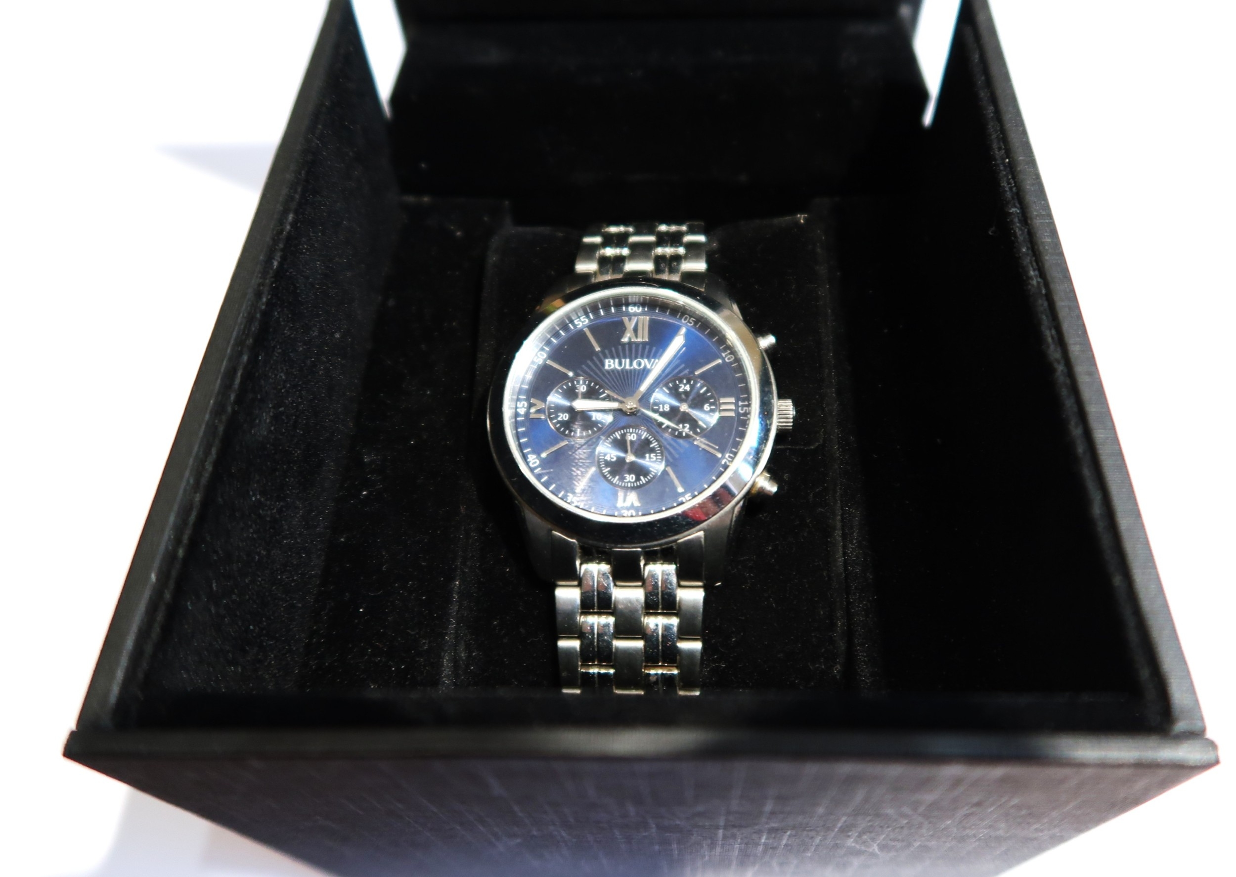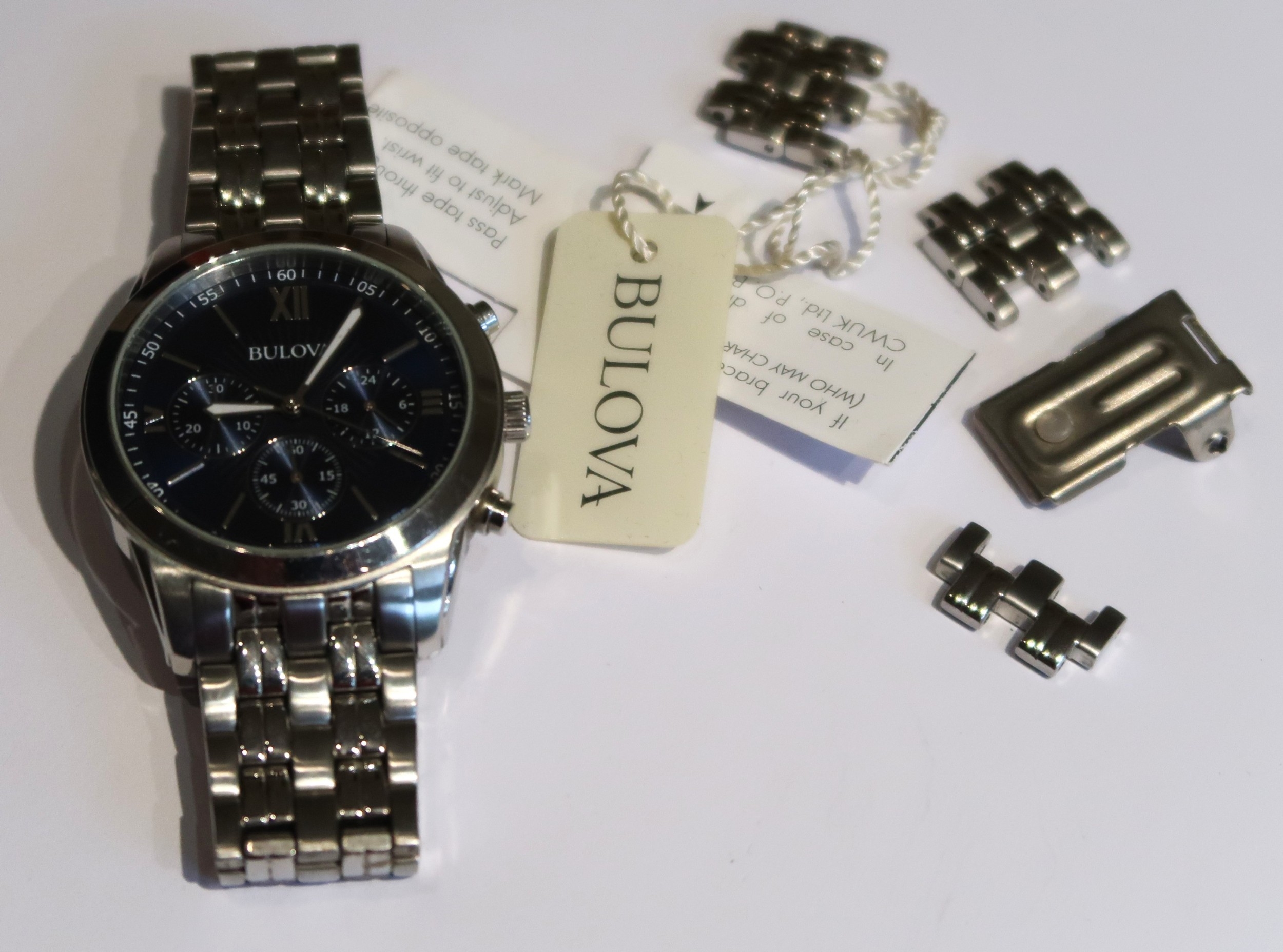 Bulova gentleman's steel cased quartz wristwatch with blue dial having three subsidiary dials in original box (including spare strap parts)
