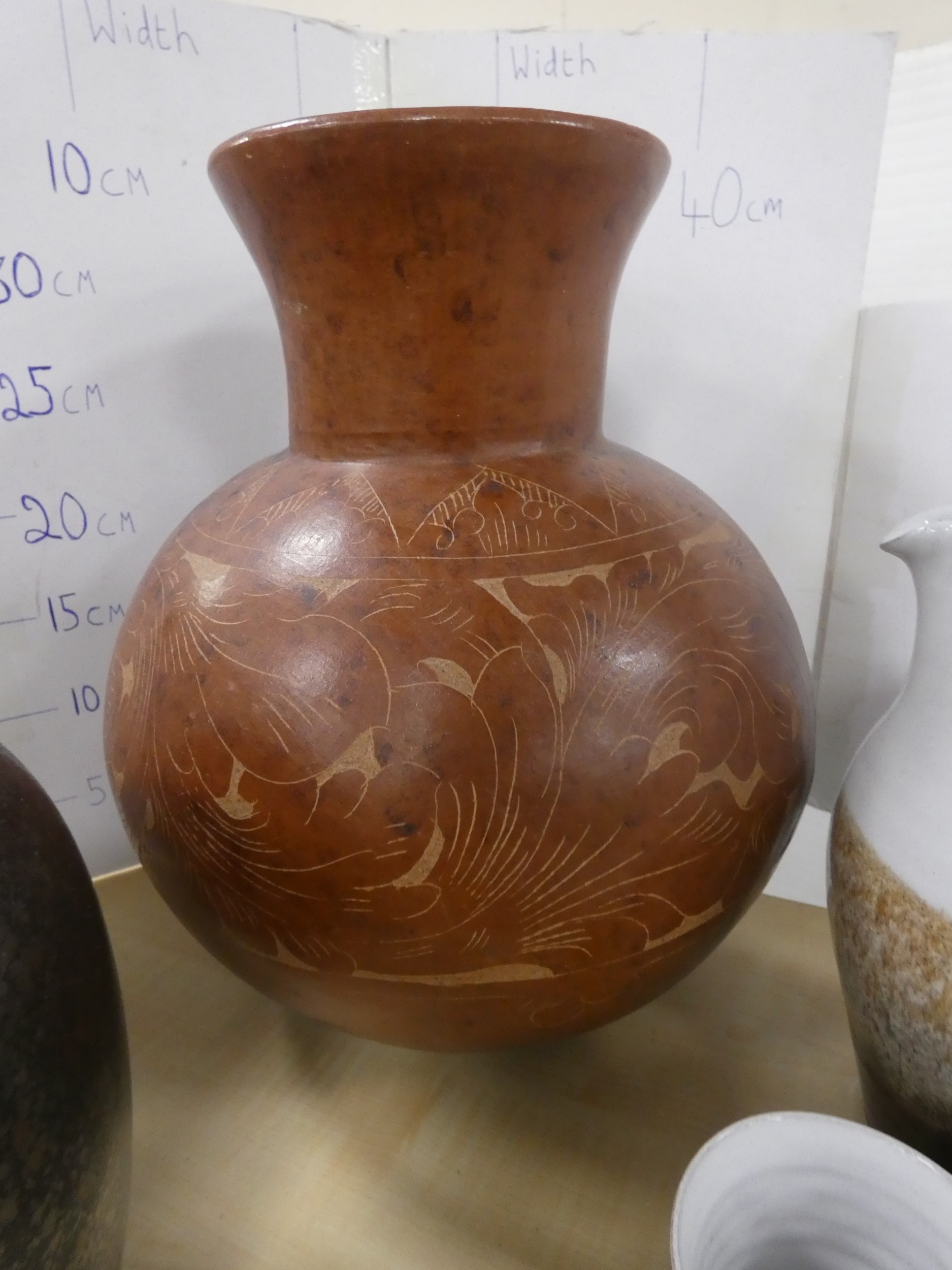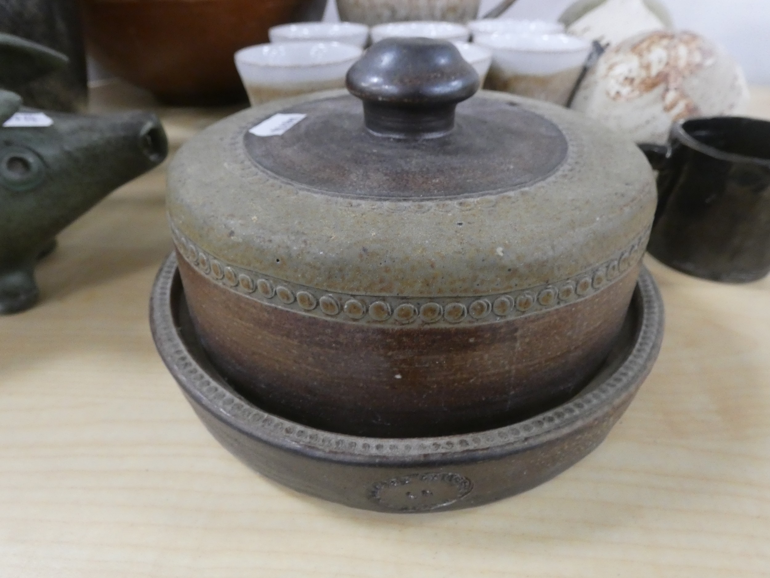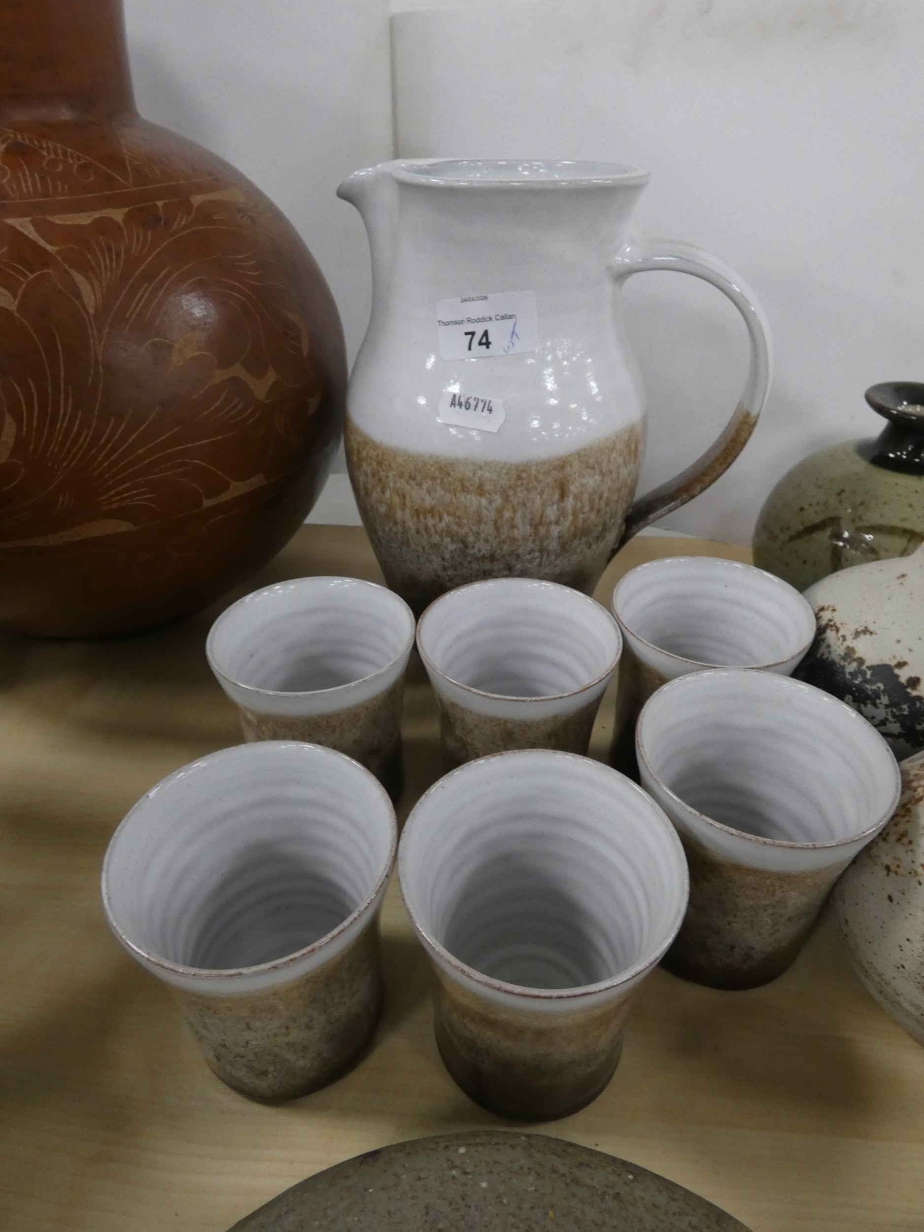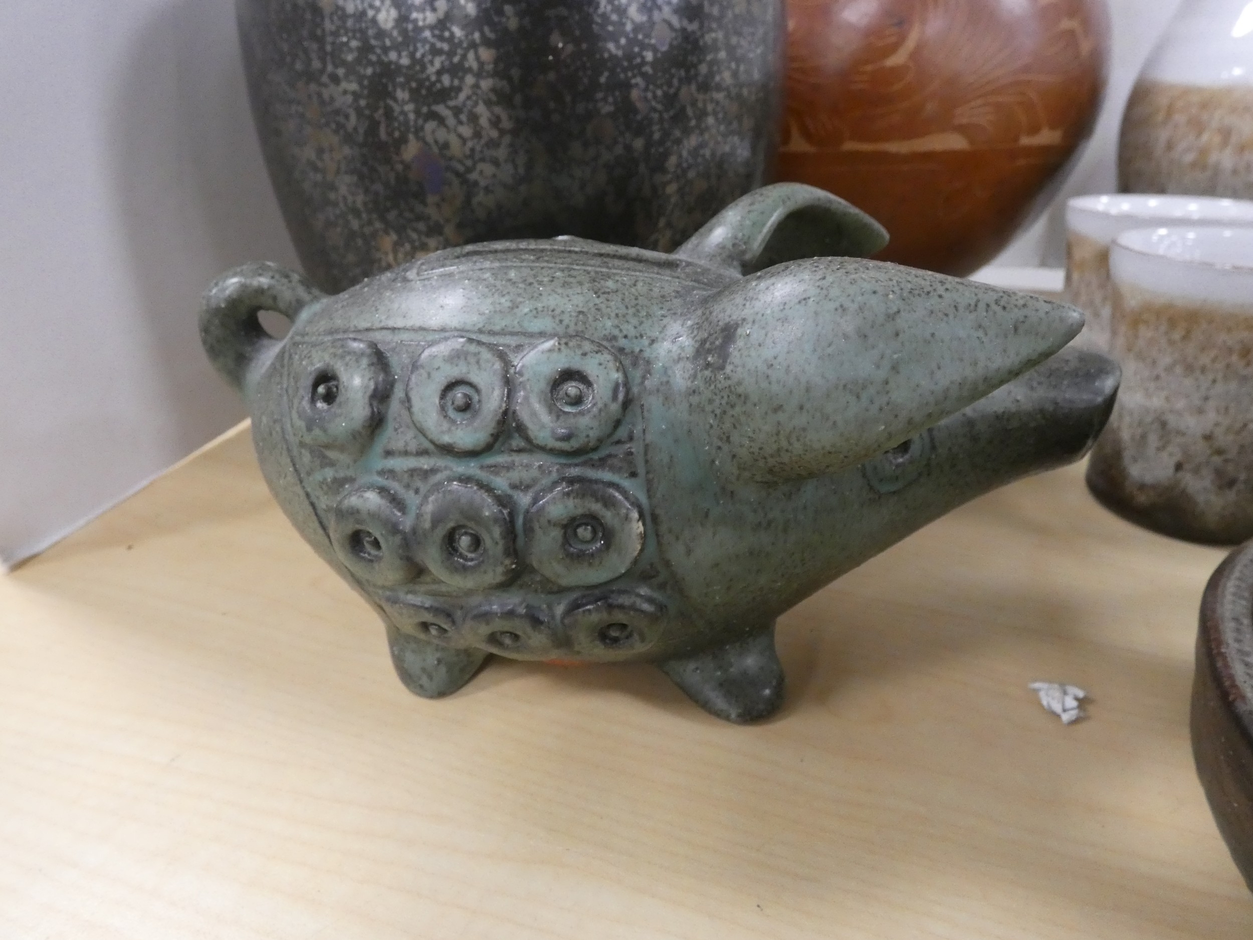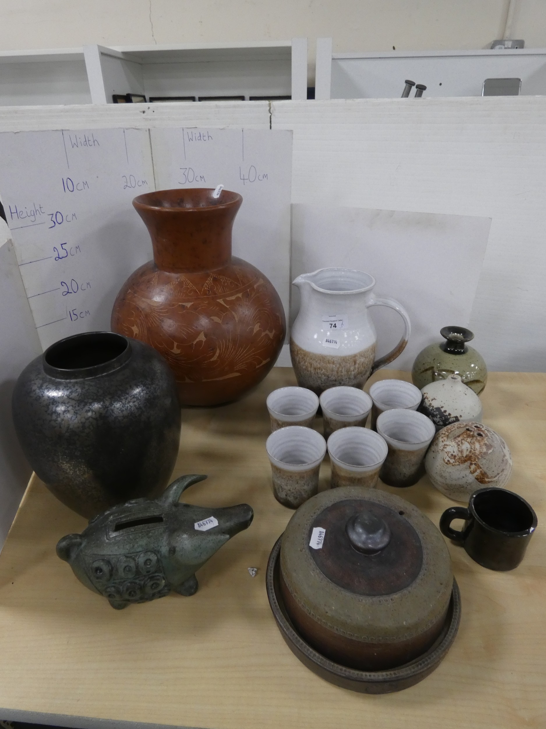 Collection of studio pottery to include a water set, Tremar style bean pot with cover, coin bank in the form of a pig, large terracotta vase etc.