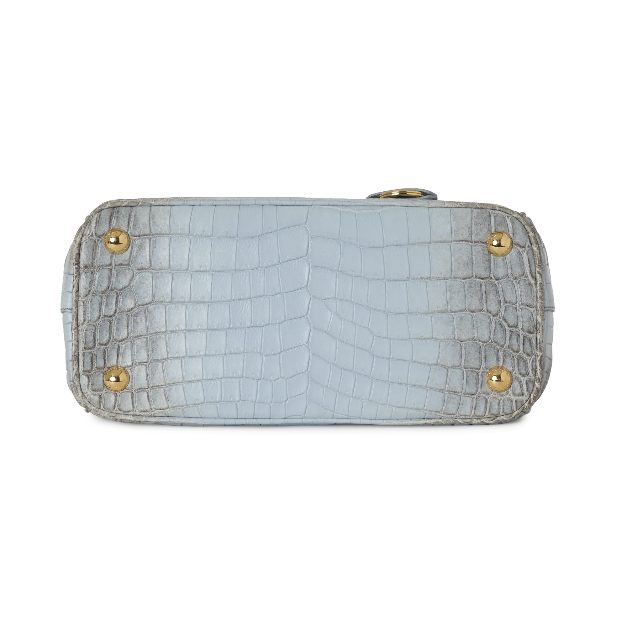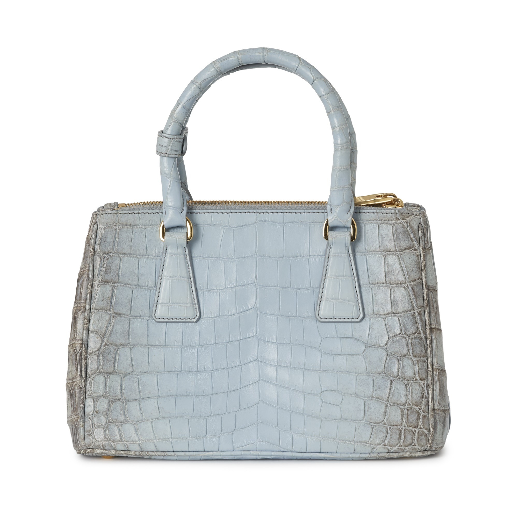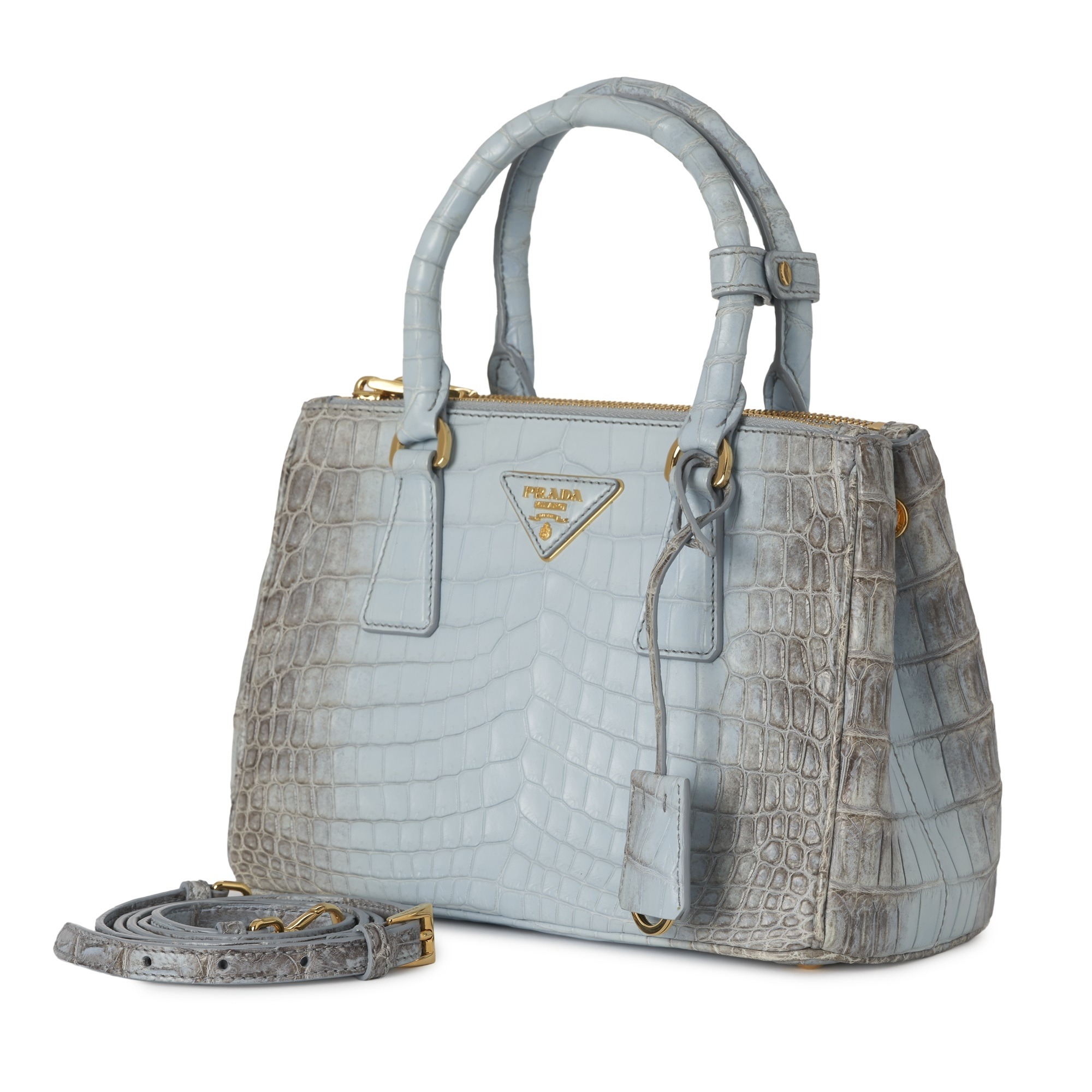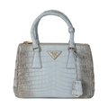 Prada, a small crocodile Galleria handbag, crafted from luxurious matte crocodile leather, with gold-tone hardware accents, front triangular logo plaque, rolled top handles, detachable crossbody strap, and a smooth pale blue leather-lined interior, measuring 11.5 by 16.5 by 25cm, with maker's dust bag and product card