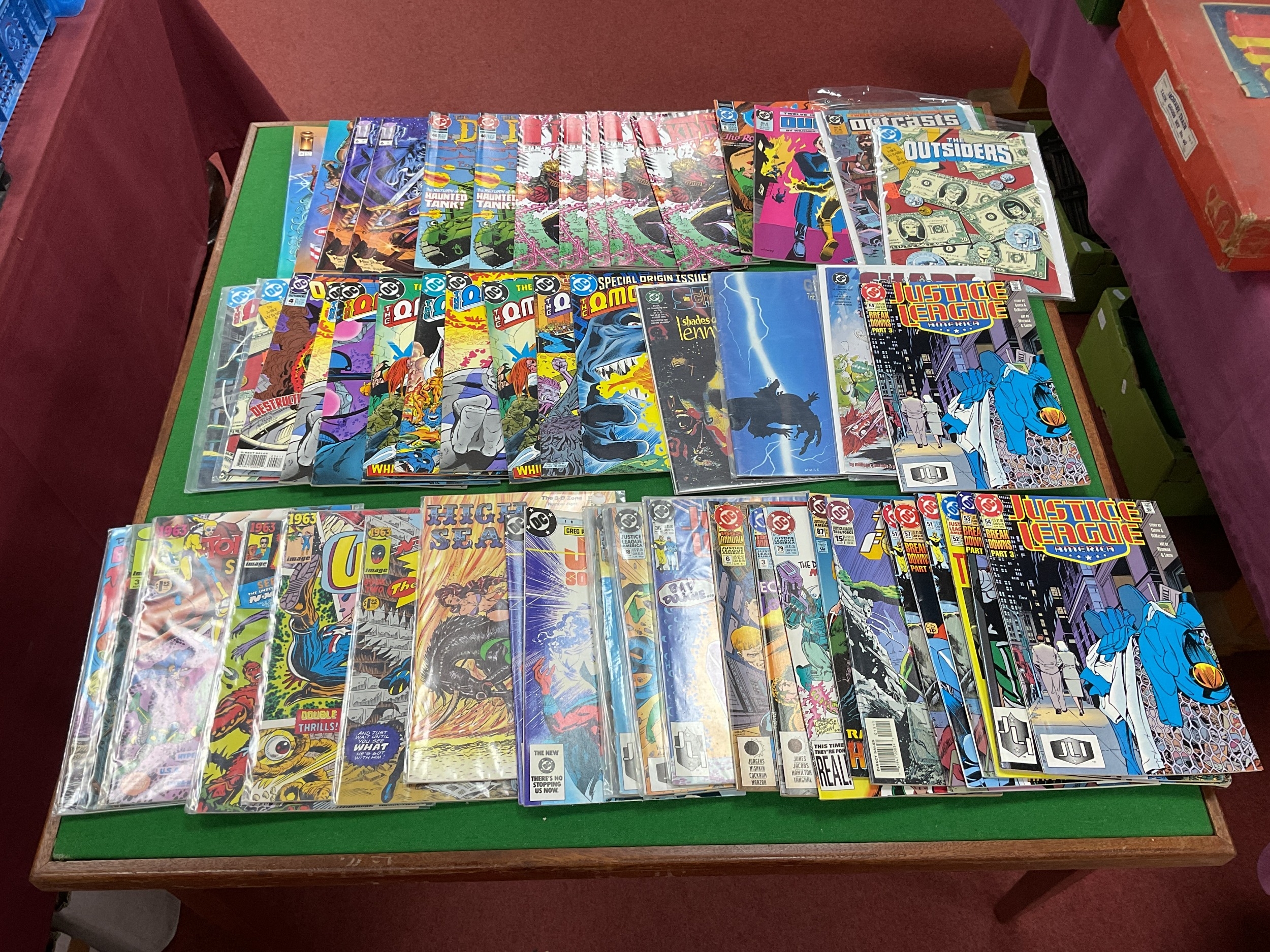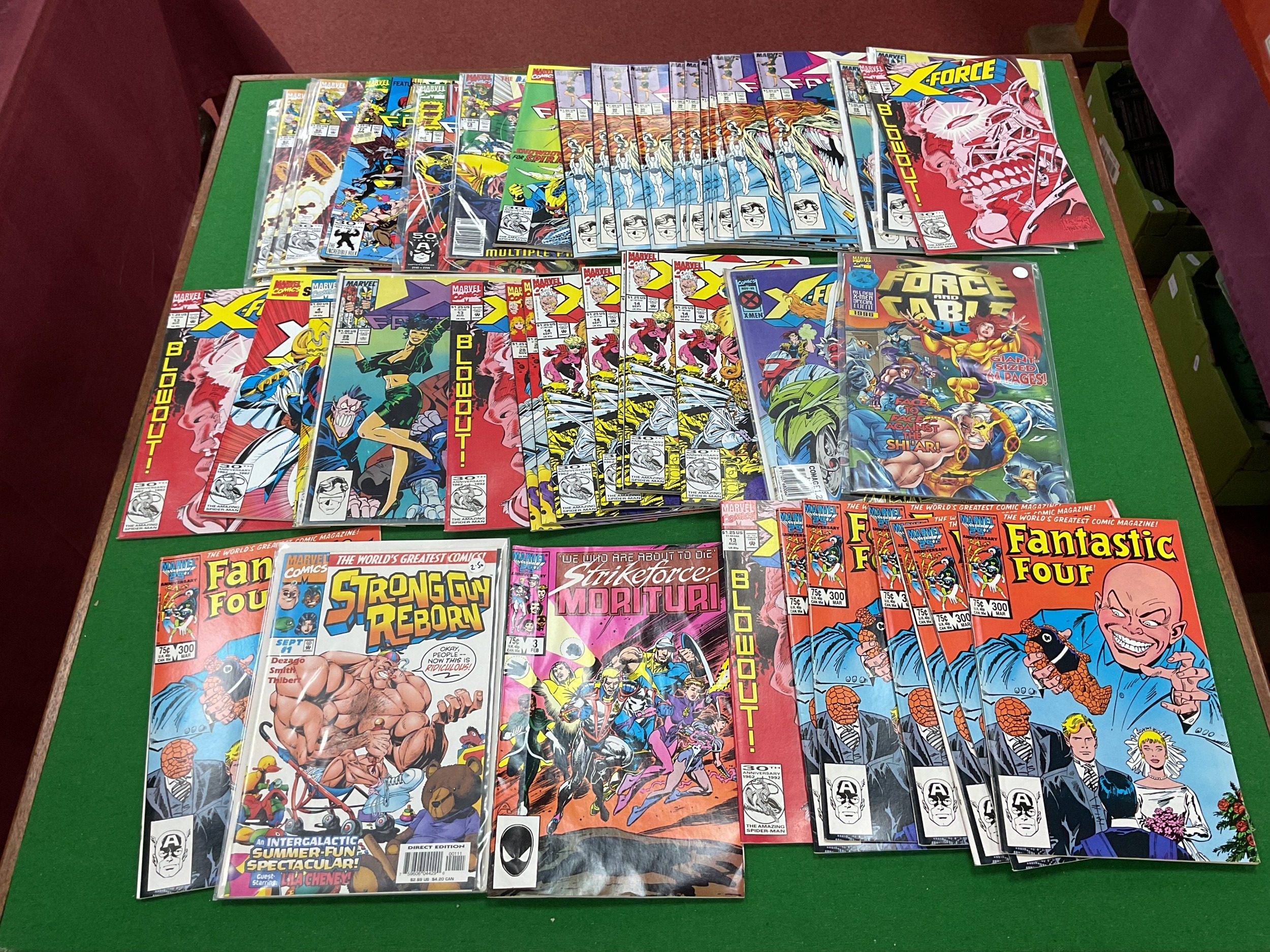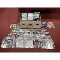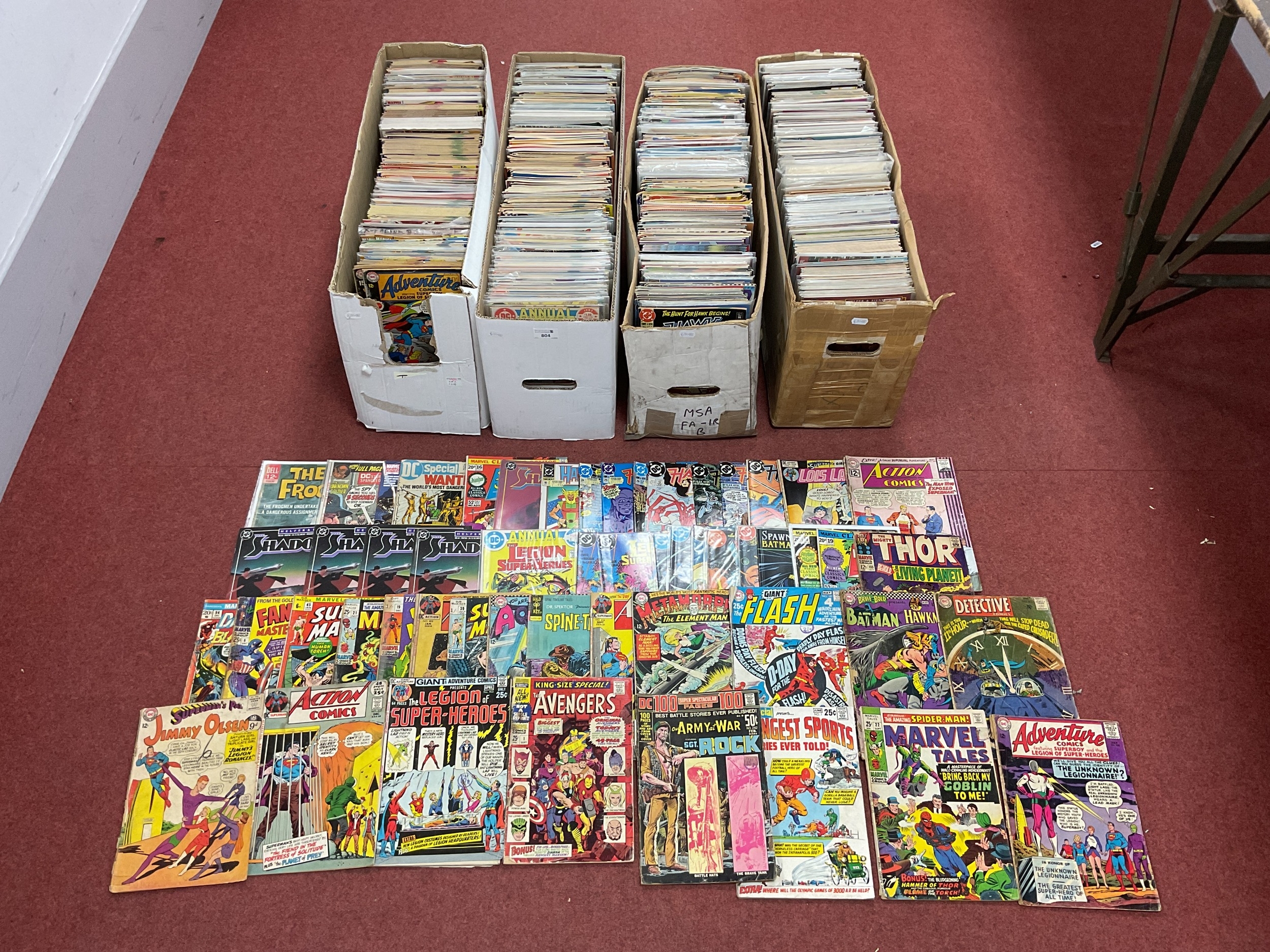 Approximately one thousand (1,000), 1960s - modern (mostly modern), comics by DC, Marvel, Gold Key, Image, Comico, First Comics and others. To include Dr. Spektor Spine Tingling Tales #2, Sub Mariner #39, #45, Action Comics #288, #407, The Avengers King Size Special #1 (poor condition), Marvel Tales #22, 100 page Super Spectacular #DC-9, The Legion of Super-Heroes #304, #334, #339, Supreme #1, Silver Star #1, Hawkworld #7, #8, Terror Tales #1, The Shadow Strikes #2, #3, #7, High Seas 3D, TSR Worlds annual #1, Blood & Water #1, Code Name Danger #1, The Hard Corps #23, Lobo #1, X Factor #15, #42, #76, X Force #4, #13, Fantastic Four #300, etc. Duplicates noted. Conditions vary. Faults noted. (Four boxes).