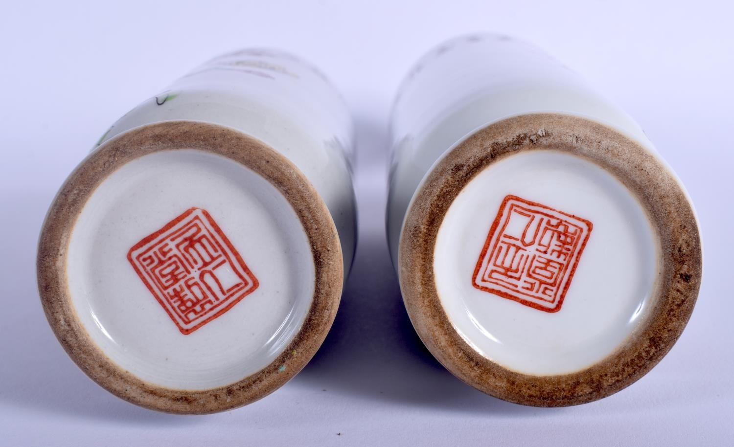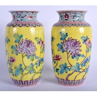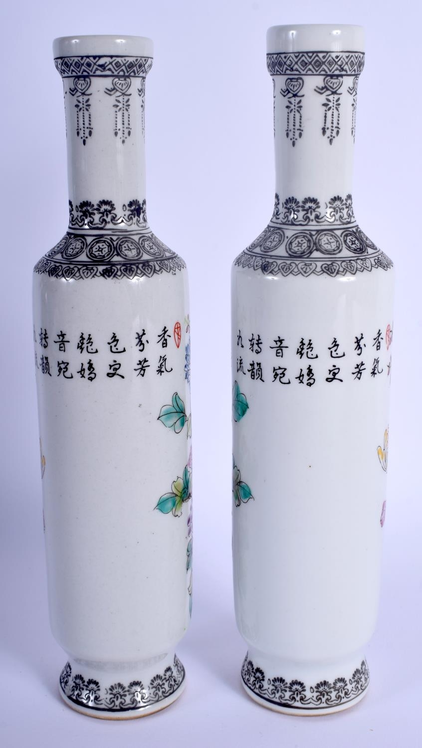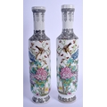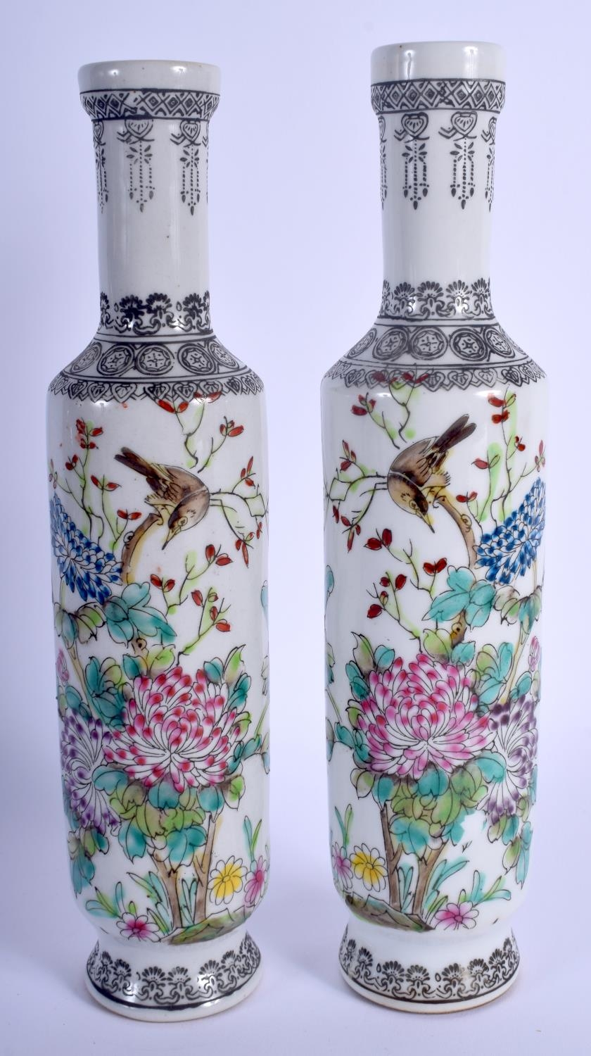 A PAIR OF CHINESE FAMILLE ROSE PORCELAIN VASES 20th Century, painted with birds amongst foliage. 25 cm high.