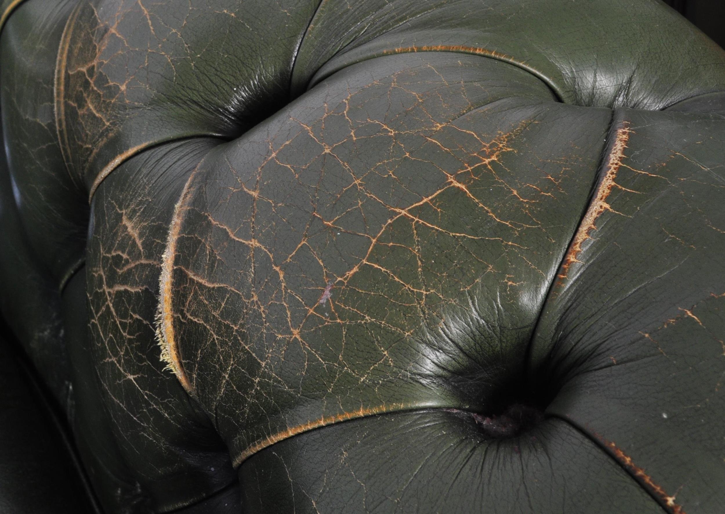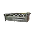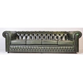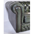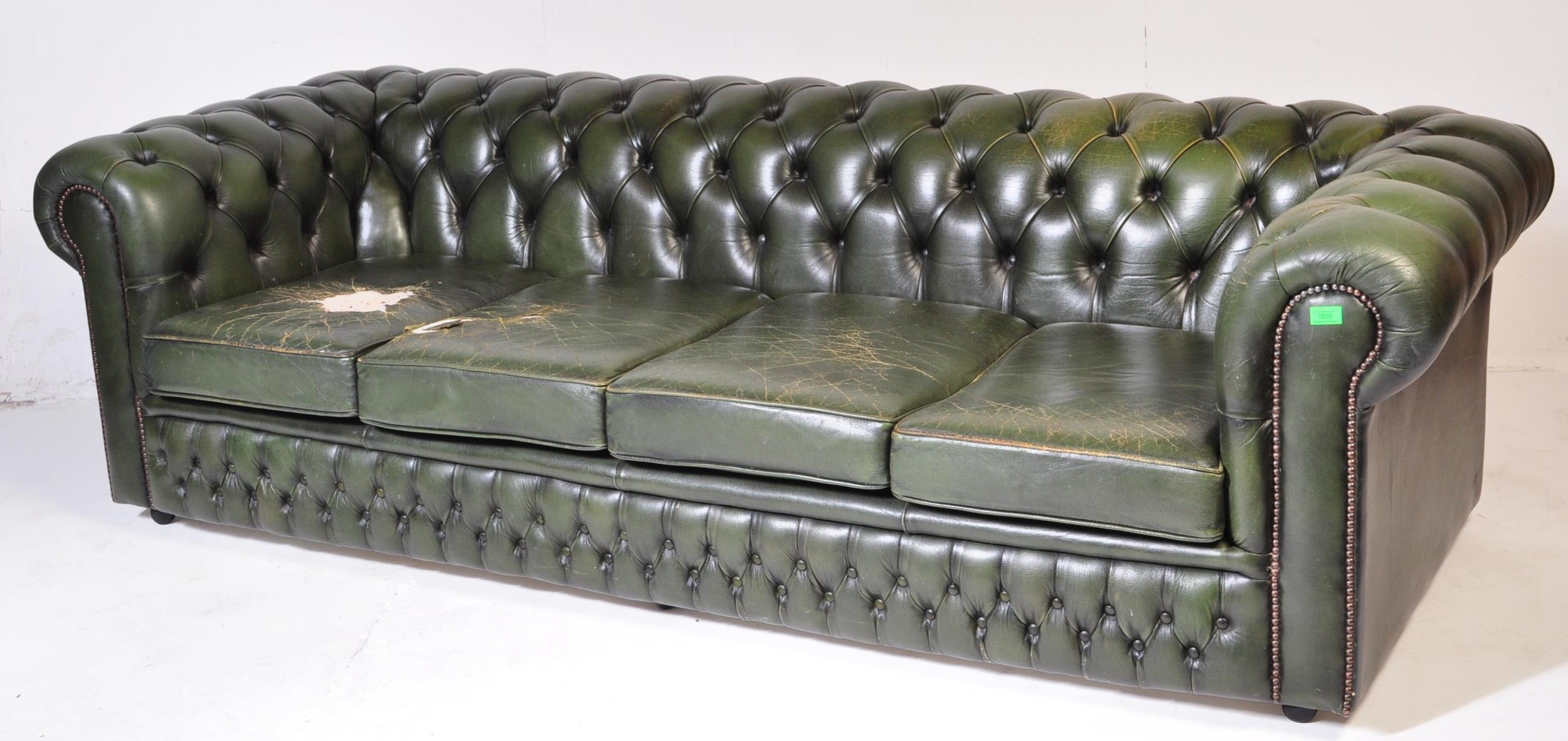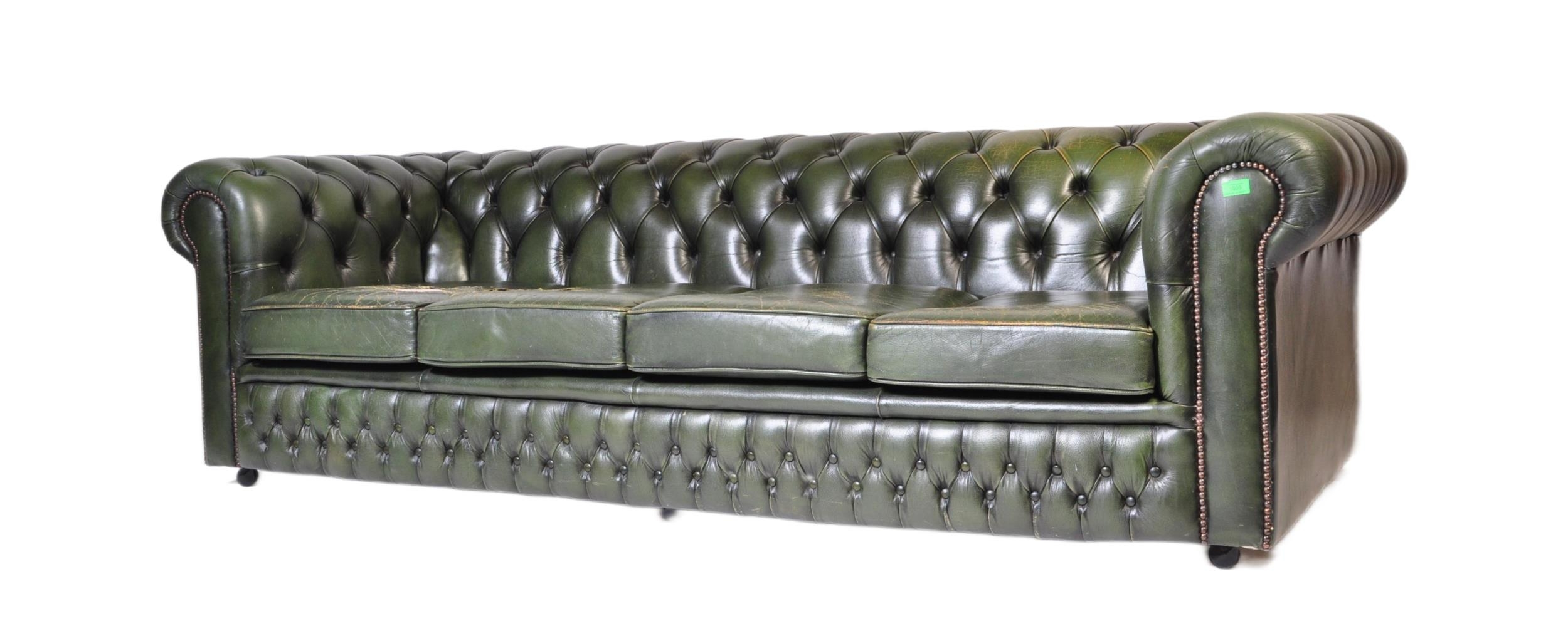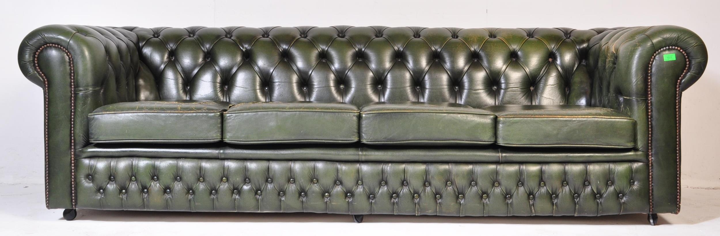 A 20th century four setter leather button back Chesterfield sofa settee. Raised on bun feet with green leather frame having deep barrel arms and back rest with button back leather. Measures approx; 67cm x 230cm x 94cm.