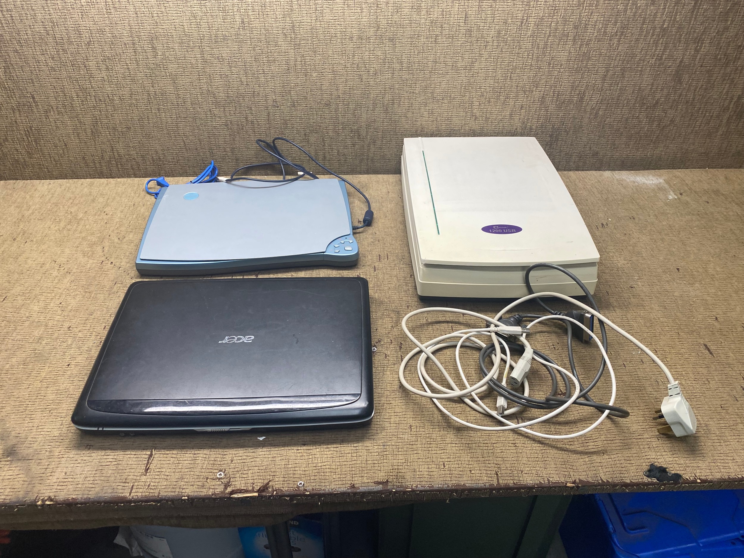 mixed selection of electronics including packard bell diamond 1200 plus scanner, Acer laptop and a Mustek 1200 USB scanner.