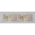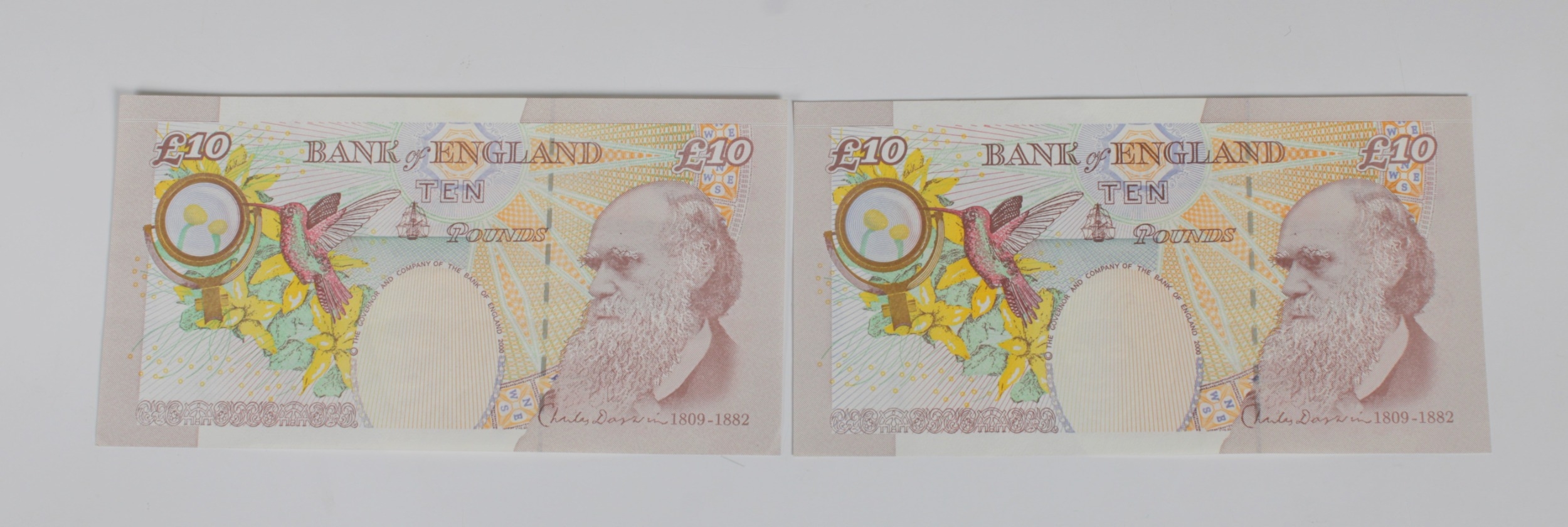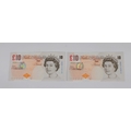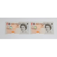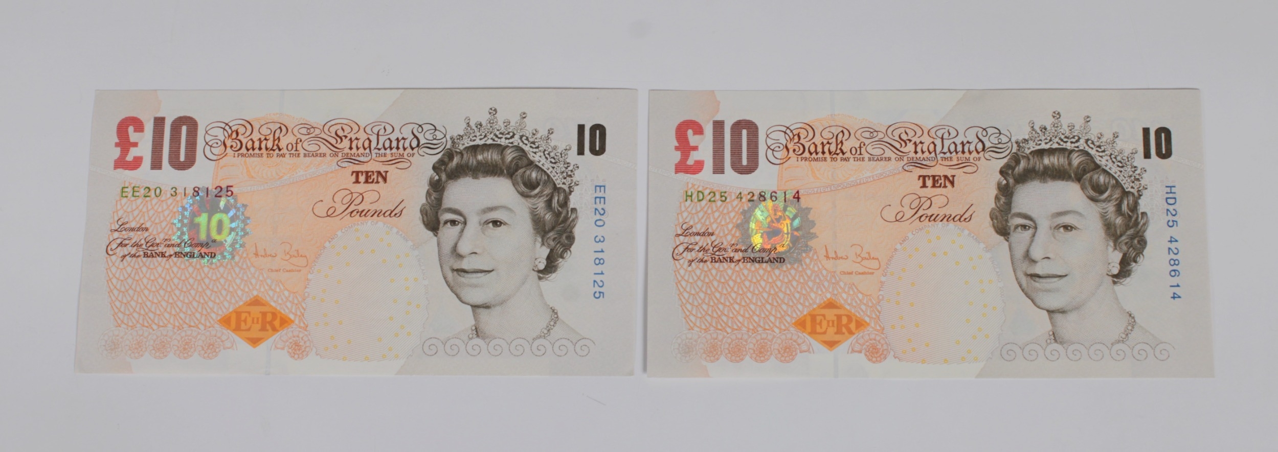 British Banknotes - Bank of England Ten Pounds (2) c.2004, Signatory Andrew Bailey, serial numbers EE20 318125 and HD25 428614, about uncirculated to UNC. (2)