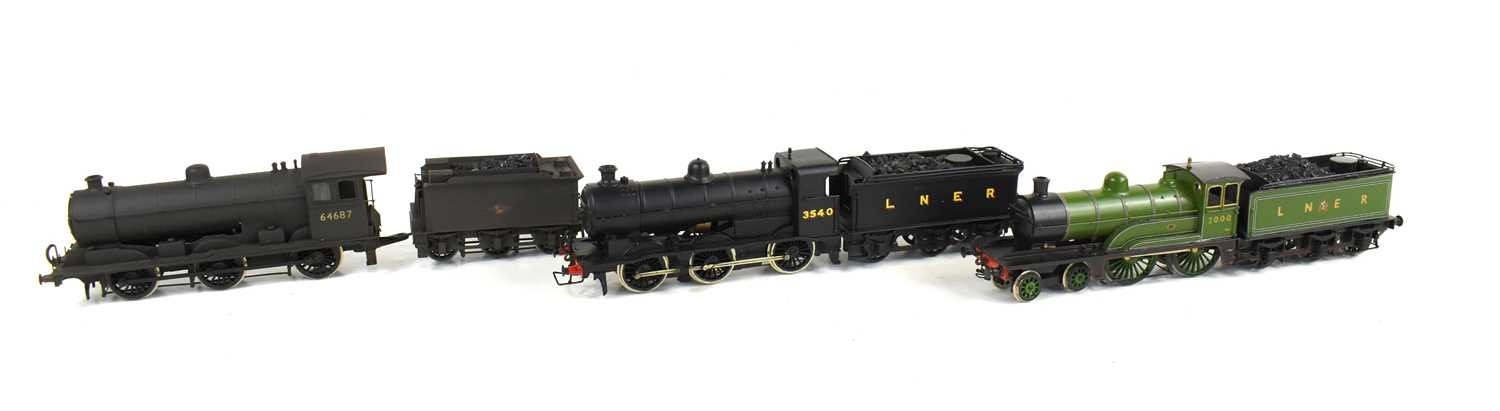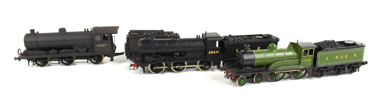 Three kit built OO gauge locomotives and tenders comprising of a LNER Class J6, No. 3540, a Class J20 in BR black with early emblem, No.64687 and a LNER Class D3, No.2000