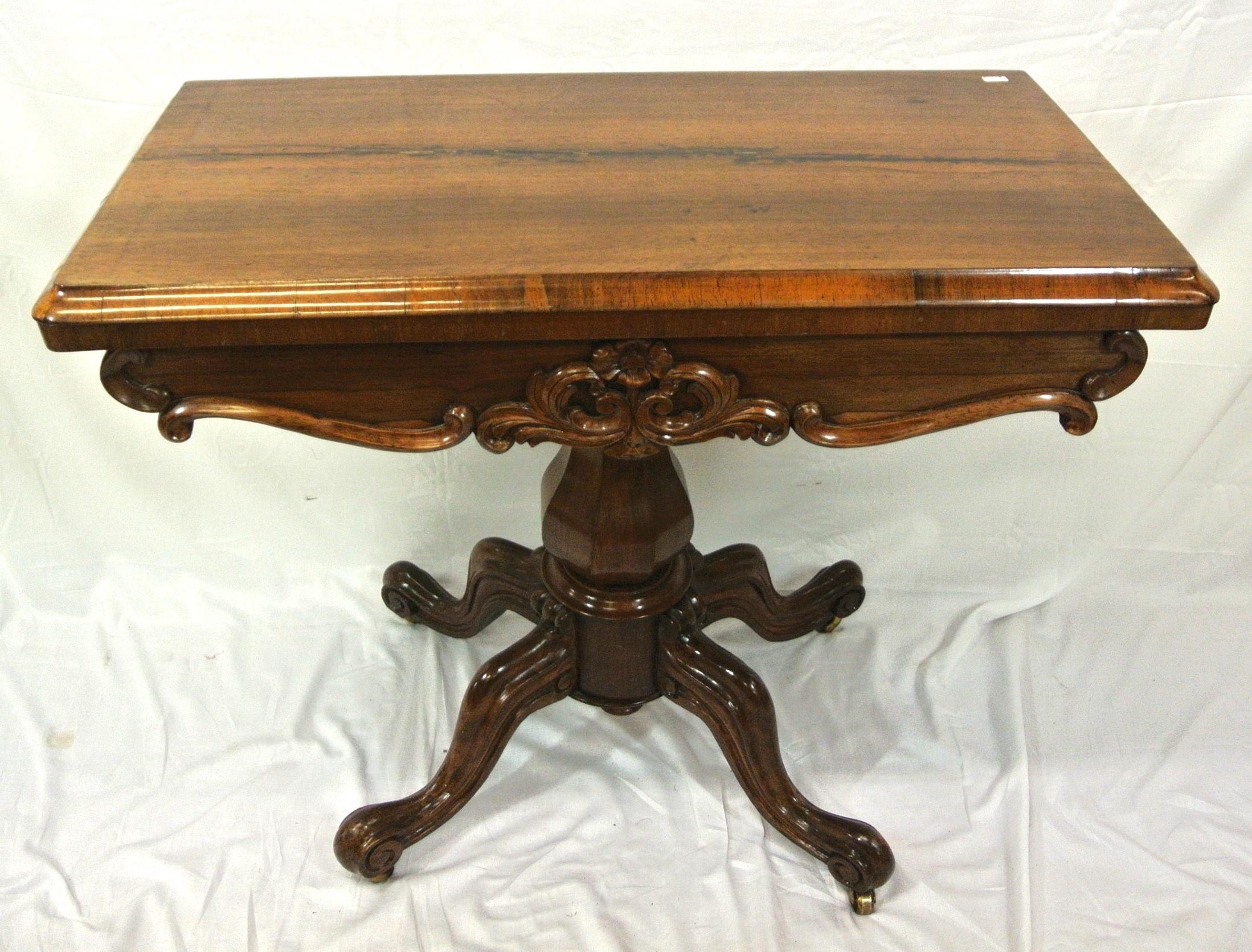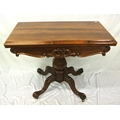 Victorian rosewood card table with swivel fold-over top, round playing surface, scroll and foliate decorated frieze, on hexagonal baluster turned column, on hipped quadrapod with scroll feet