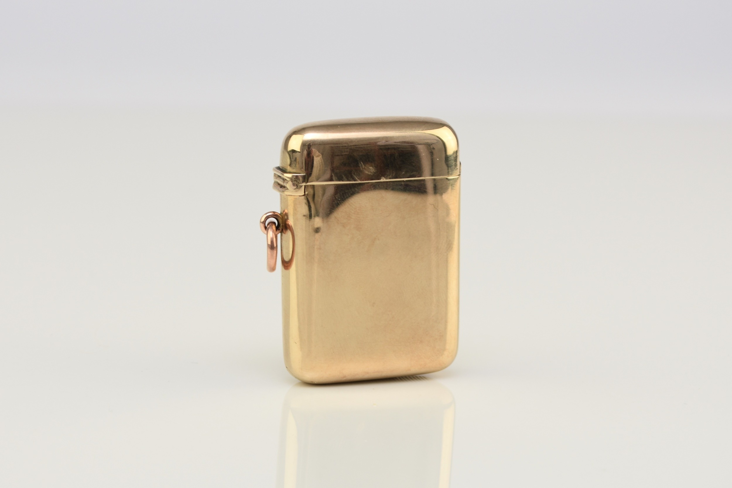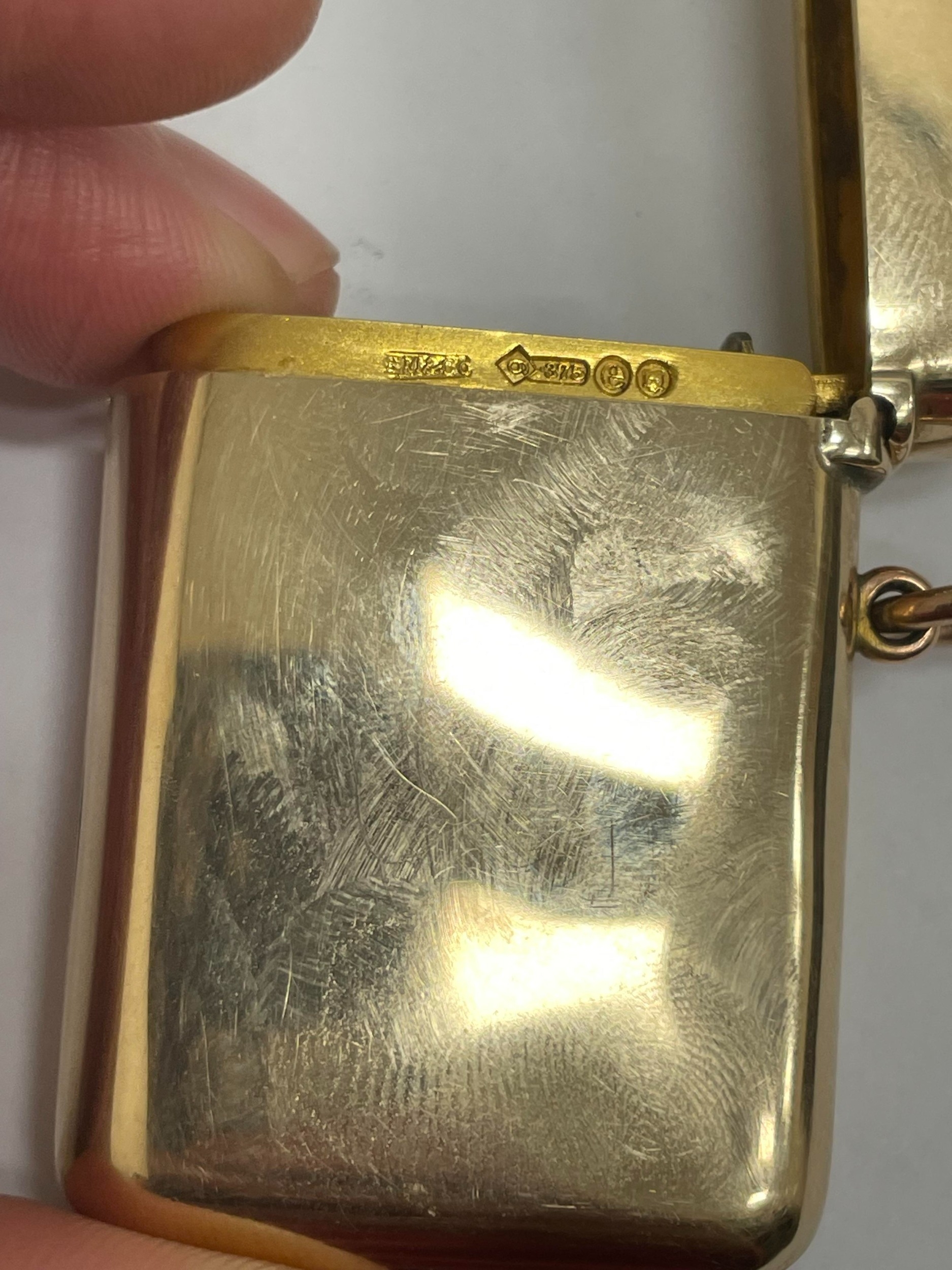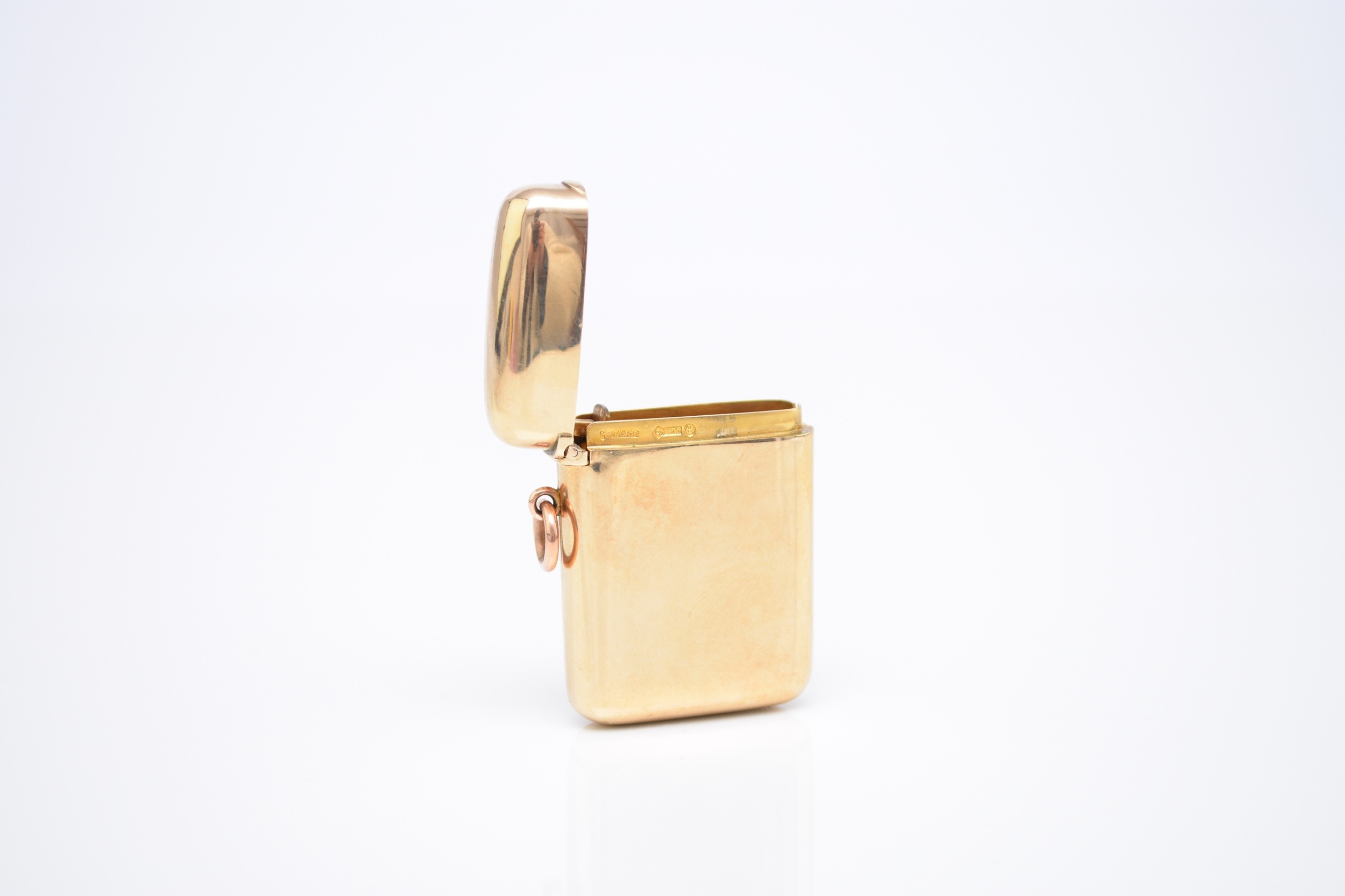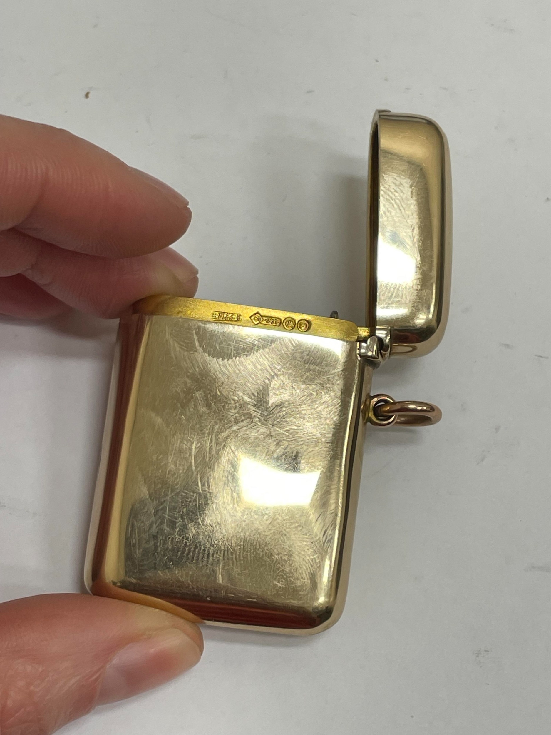 A Victorian Sampson Mordan & Co 9ct gold combined vesta and photo frame, London 1900, the case of rounded rectangular form with hinged cover opening to release further hinge to reveal internal oval photograph frame, the interior with engraved presentation inscription 'Walter from Nell Dec. 7. 01', 47mm high, weight approx 35.7g Condition:Hallmarks crisp and clear, general wear but no significant visible damage, refer to images