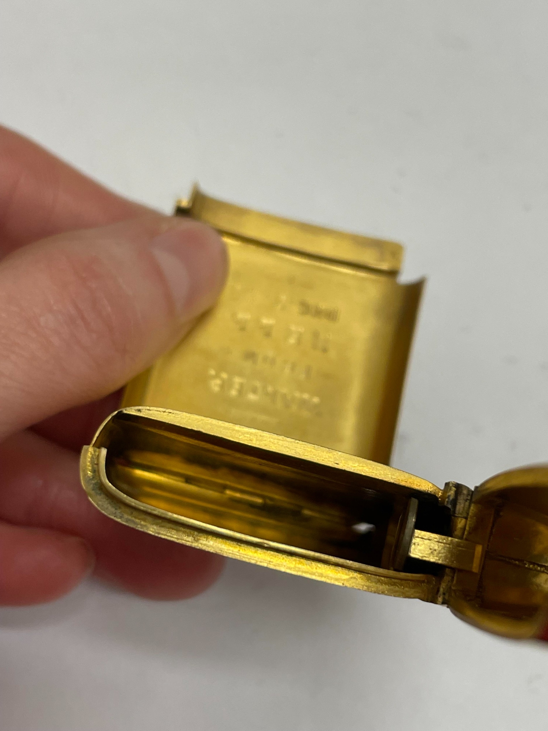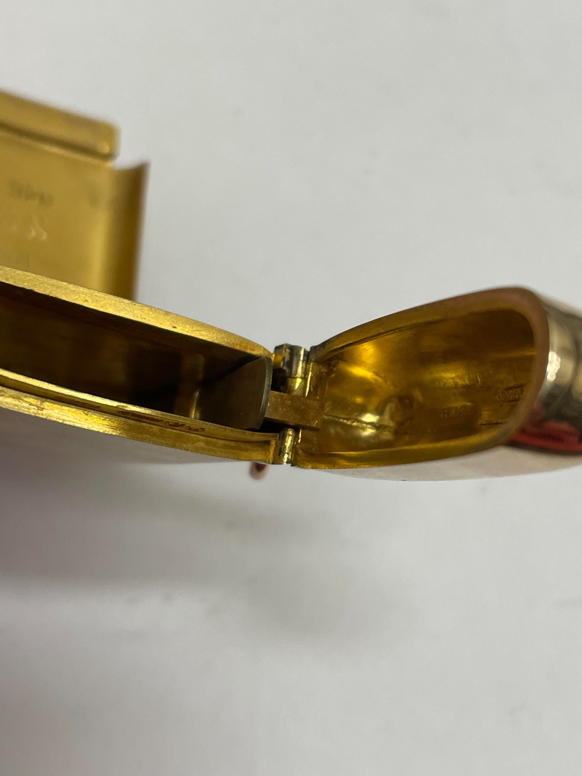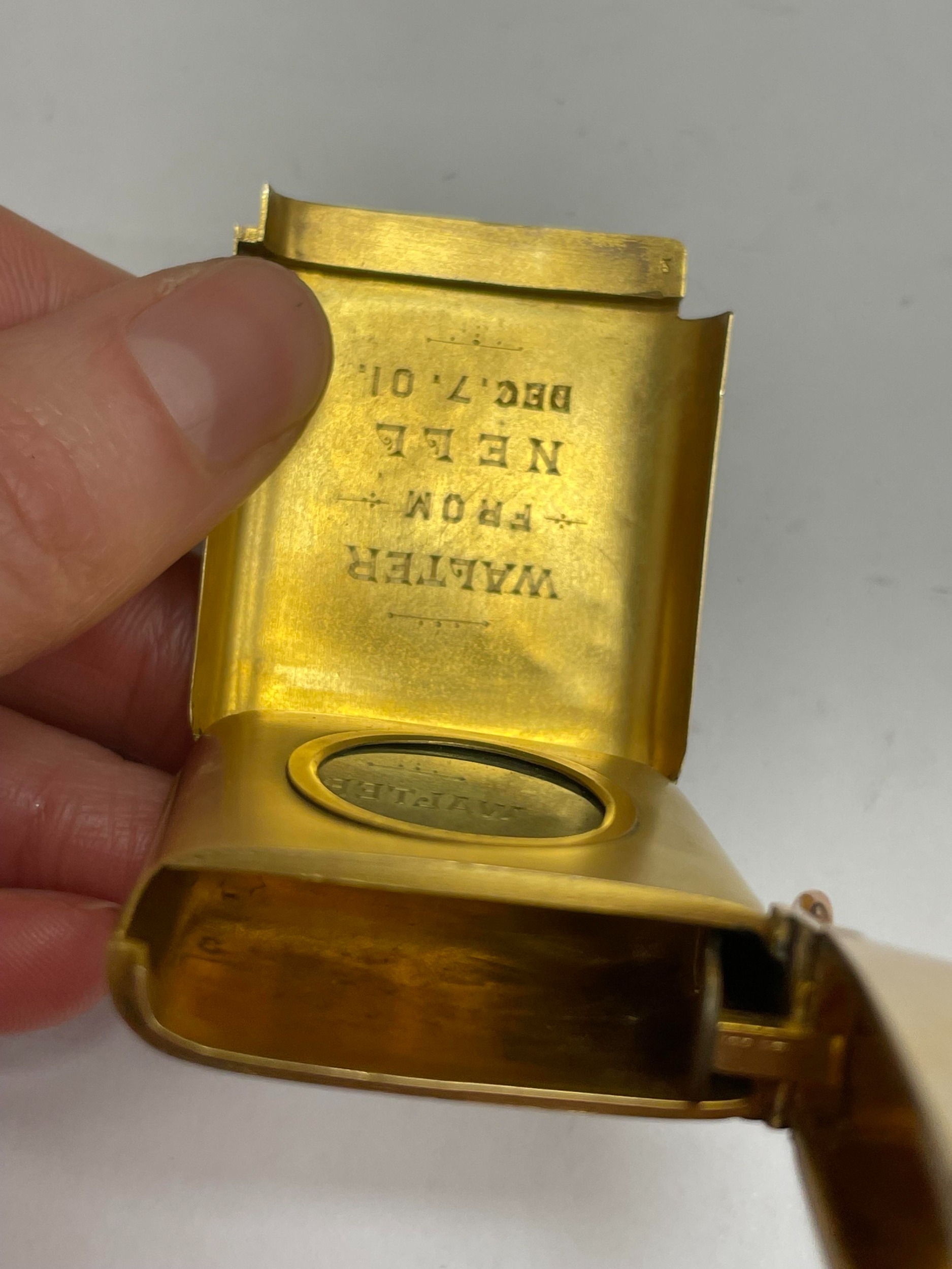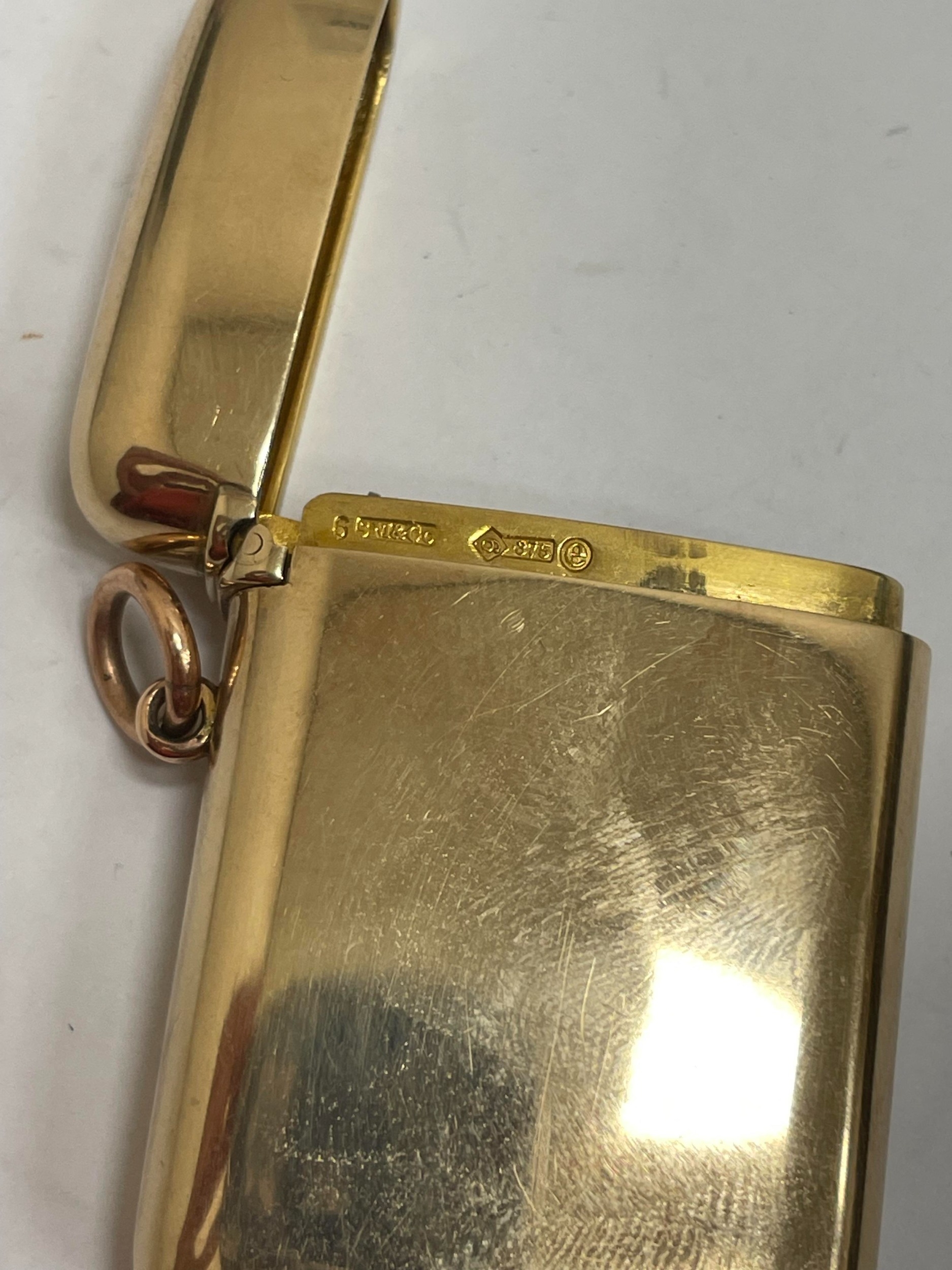 A Victorian Sampson Mordan & Co 9ct gold combined vesta and photo frame, London 1900, the case of rounded rectangular form with hinged cover opening to release further hinge to reveal internal oval photograph frame, the interior with engraved presentation inscription 'Walter from Nell Dec. 7. 01', 47mm high, weight approx 35.7g Condition:Hallmarks crisp and clear, general wear but no significant visible damage, refer to images