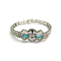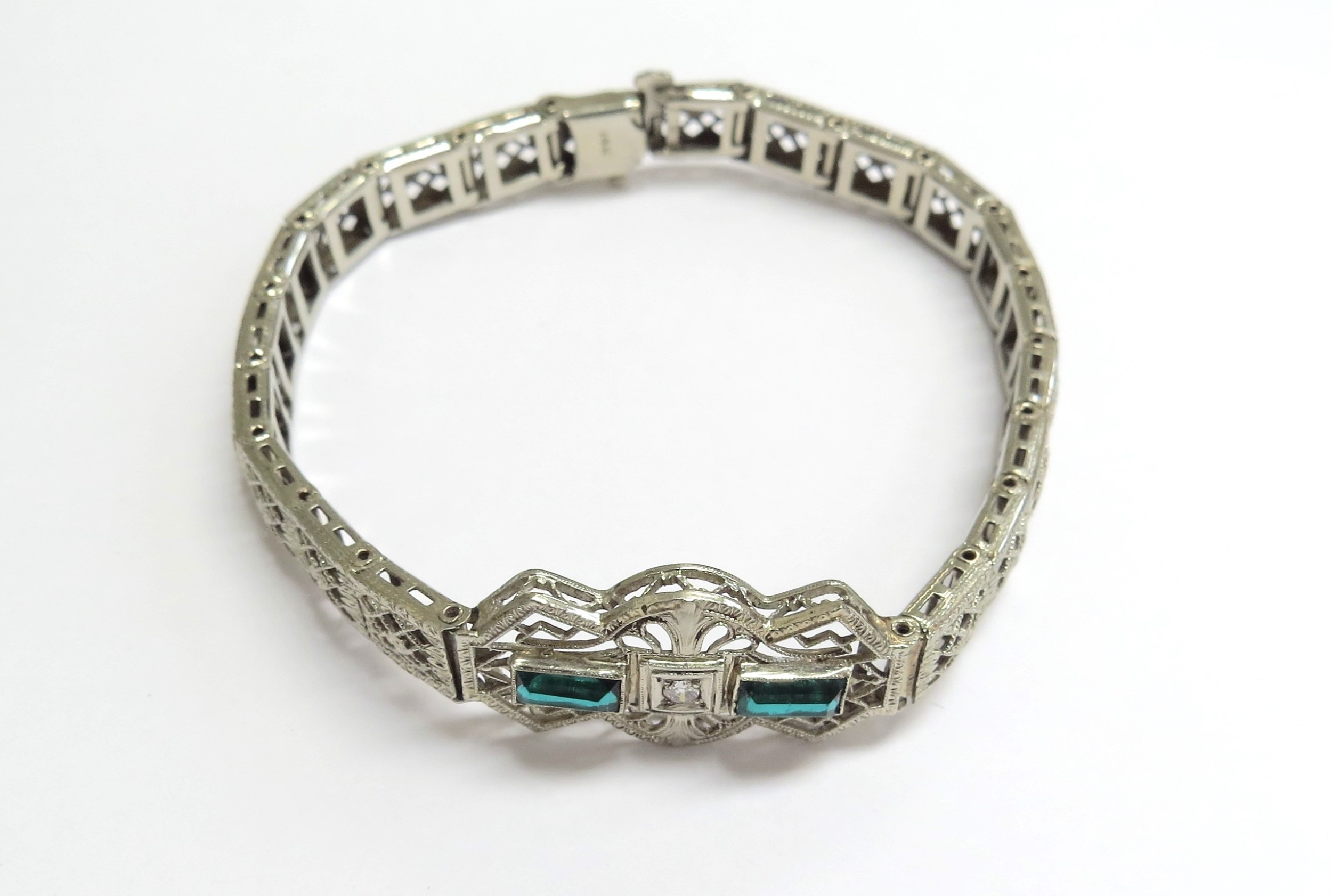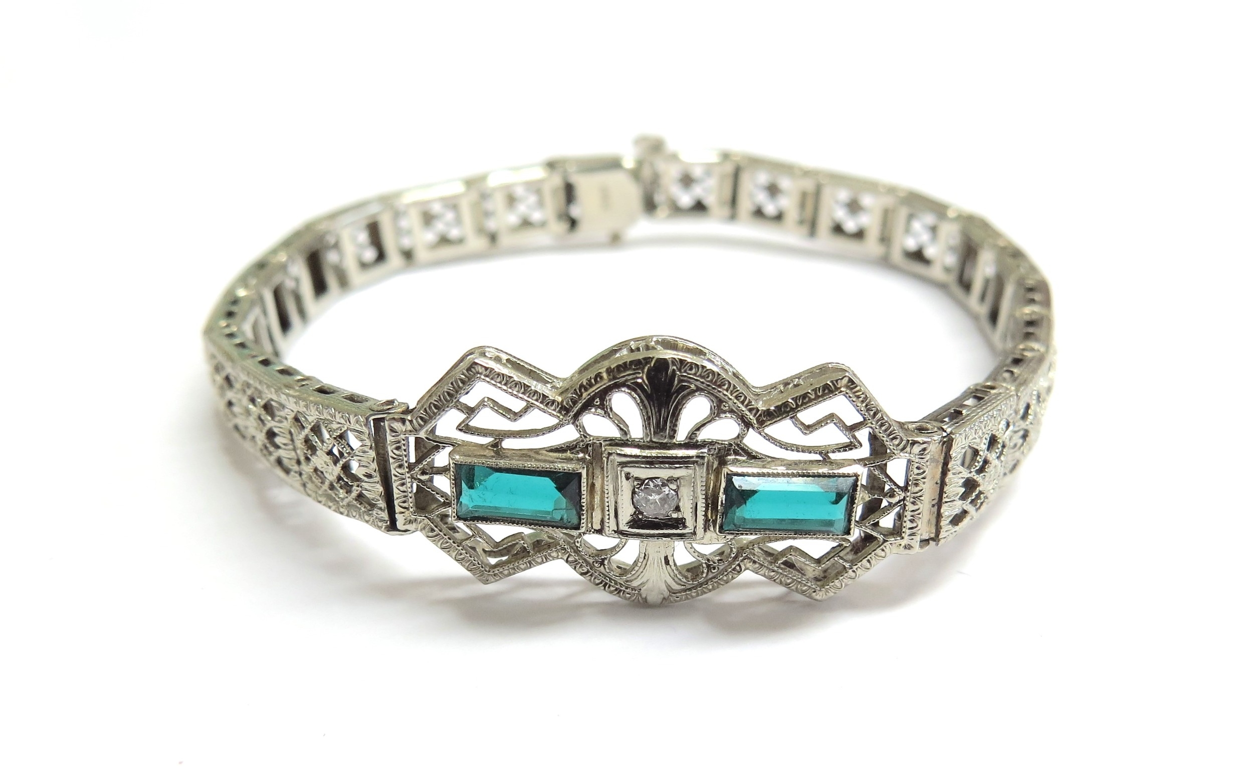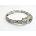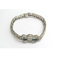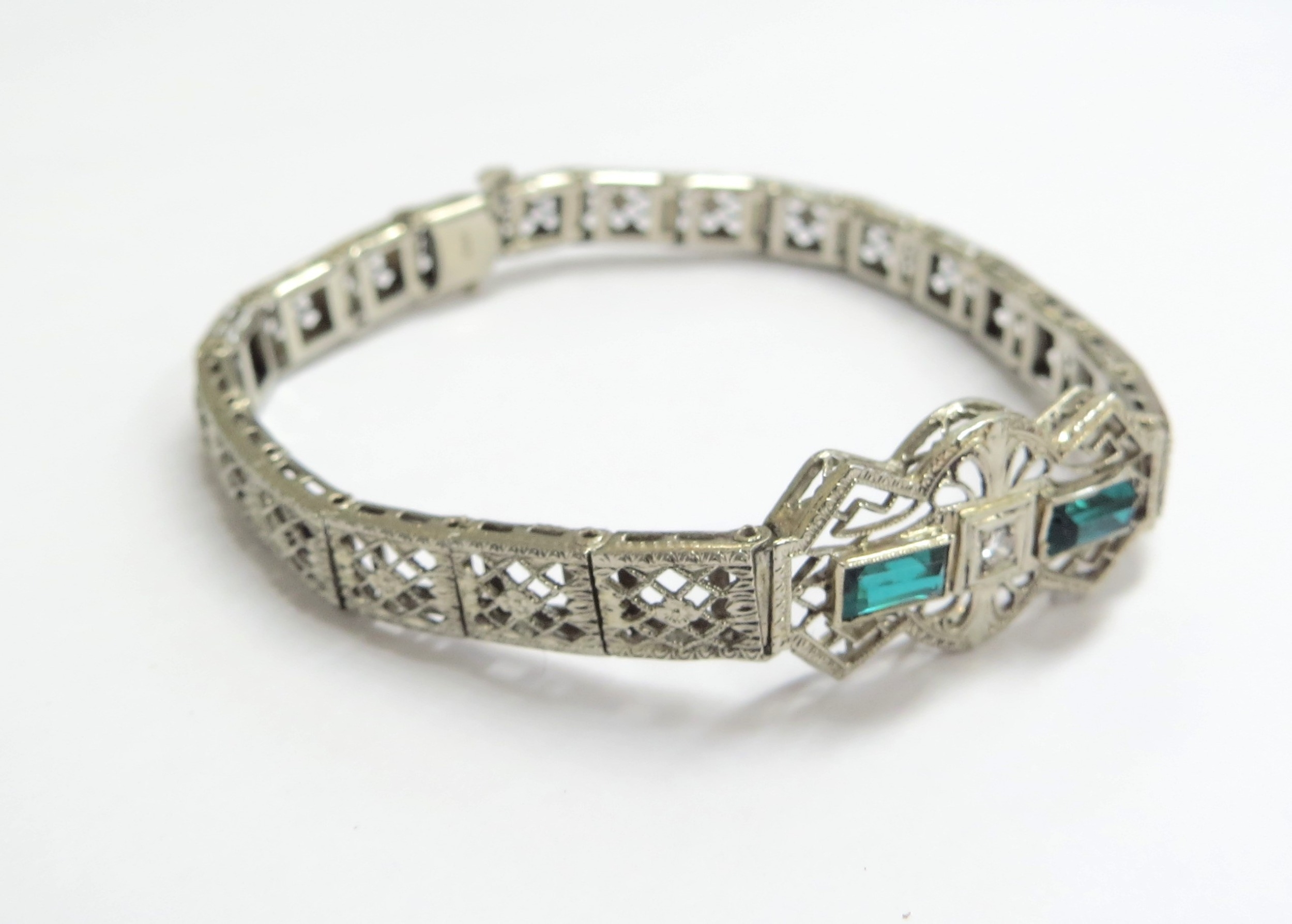 A white gold bracelet with pierced links, central diamond flanked by green coloured baguettes, stamped 14k, 17.5cm long, 9.5g