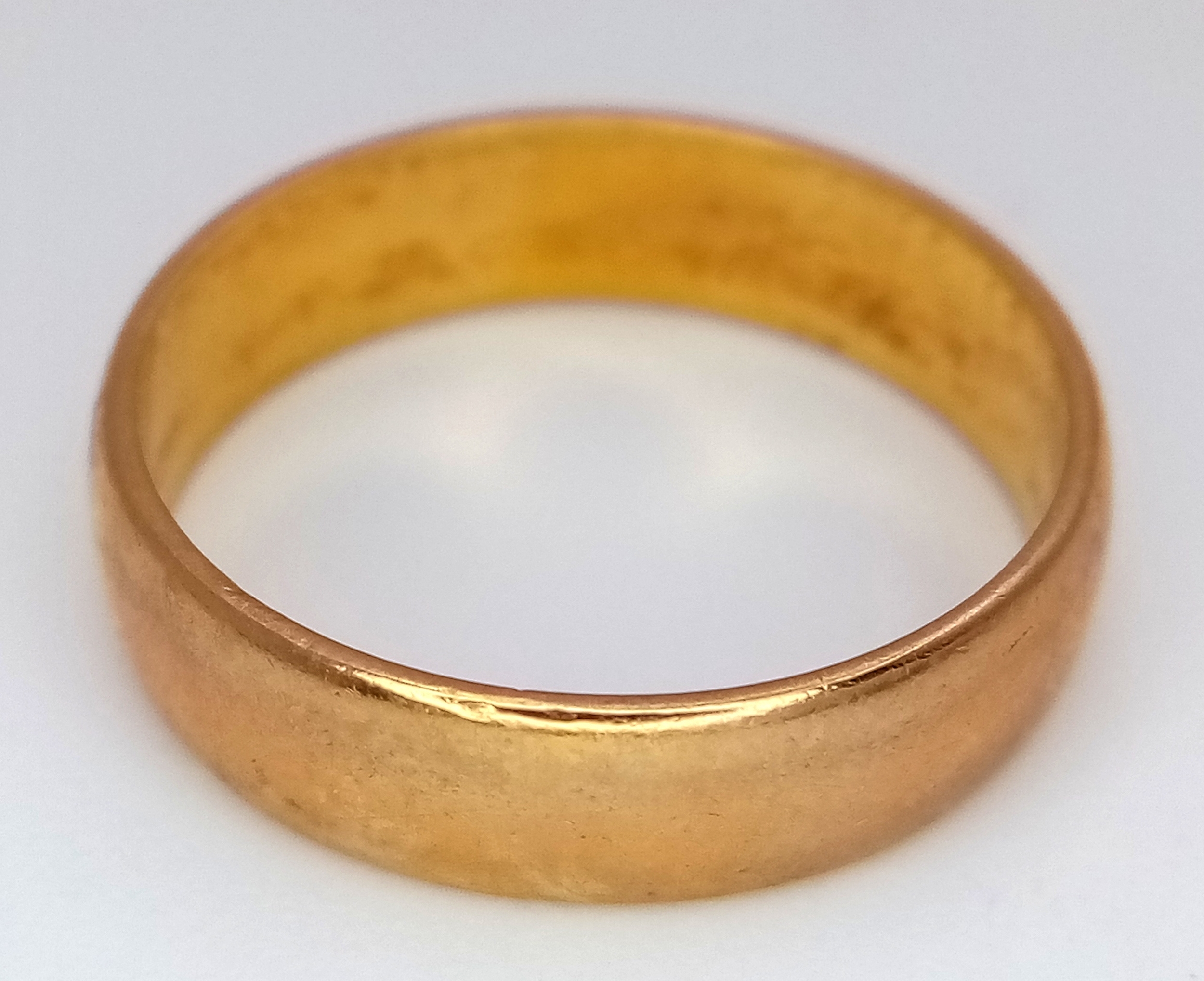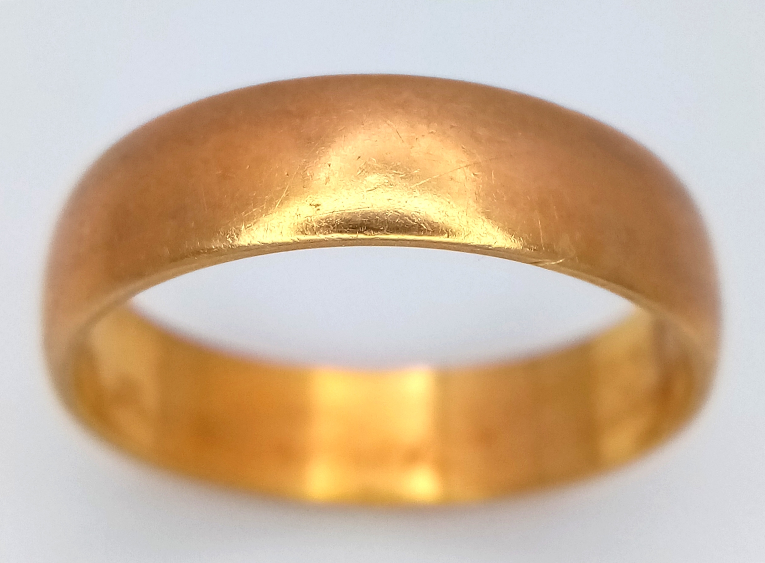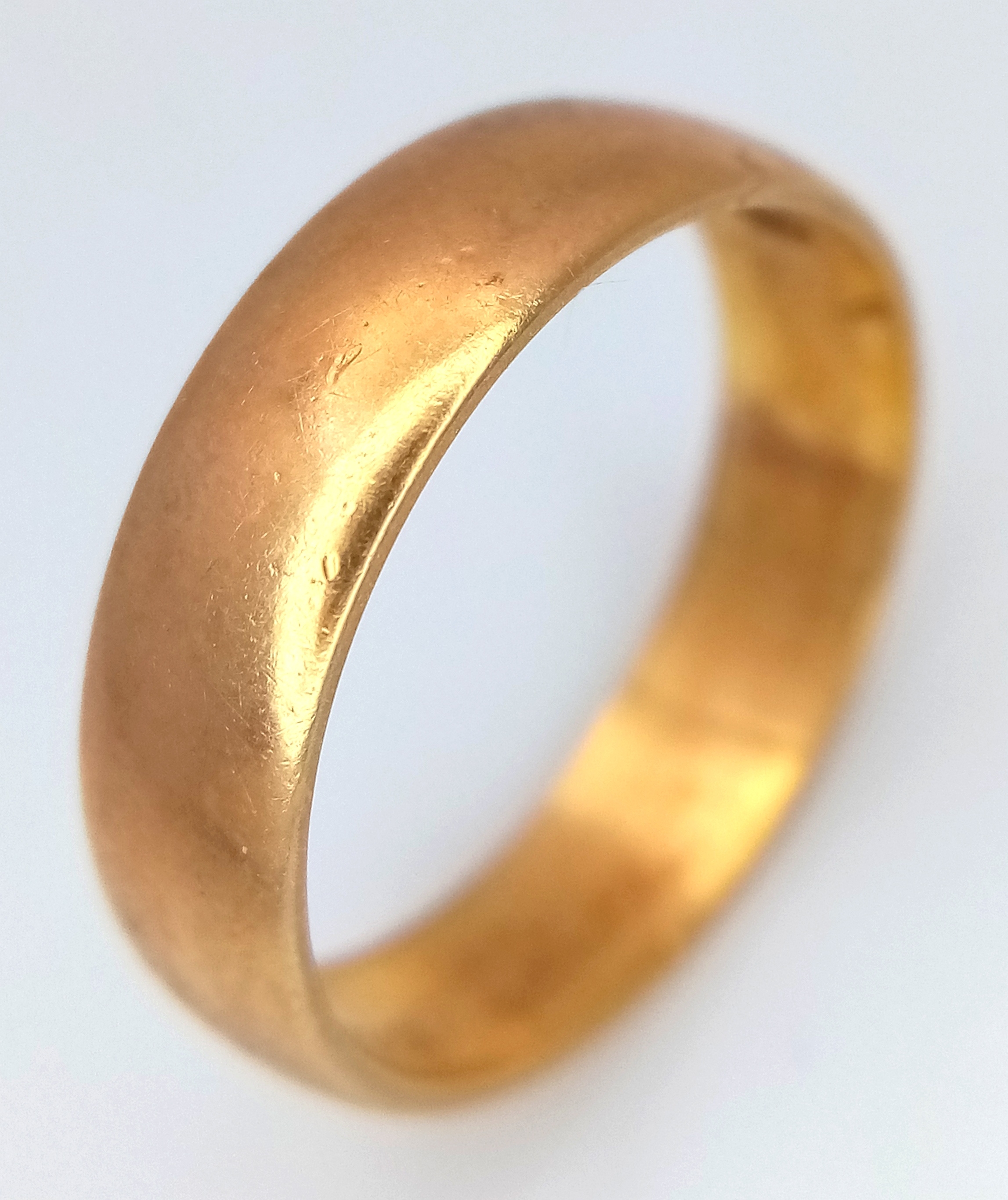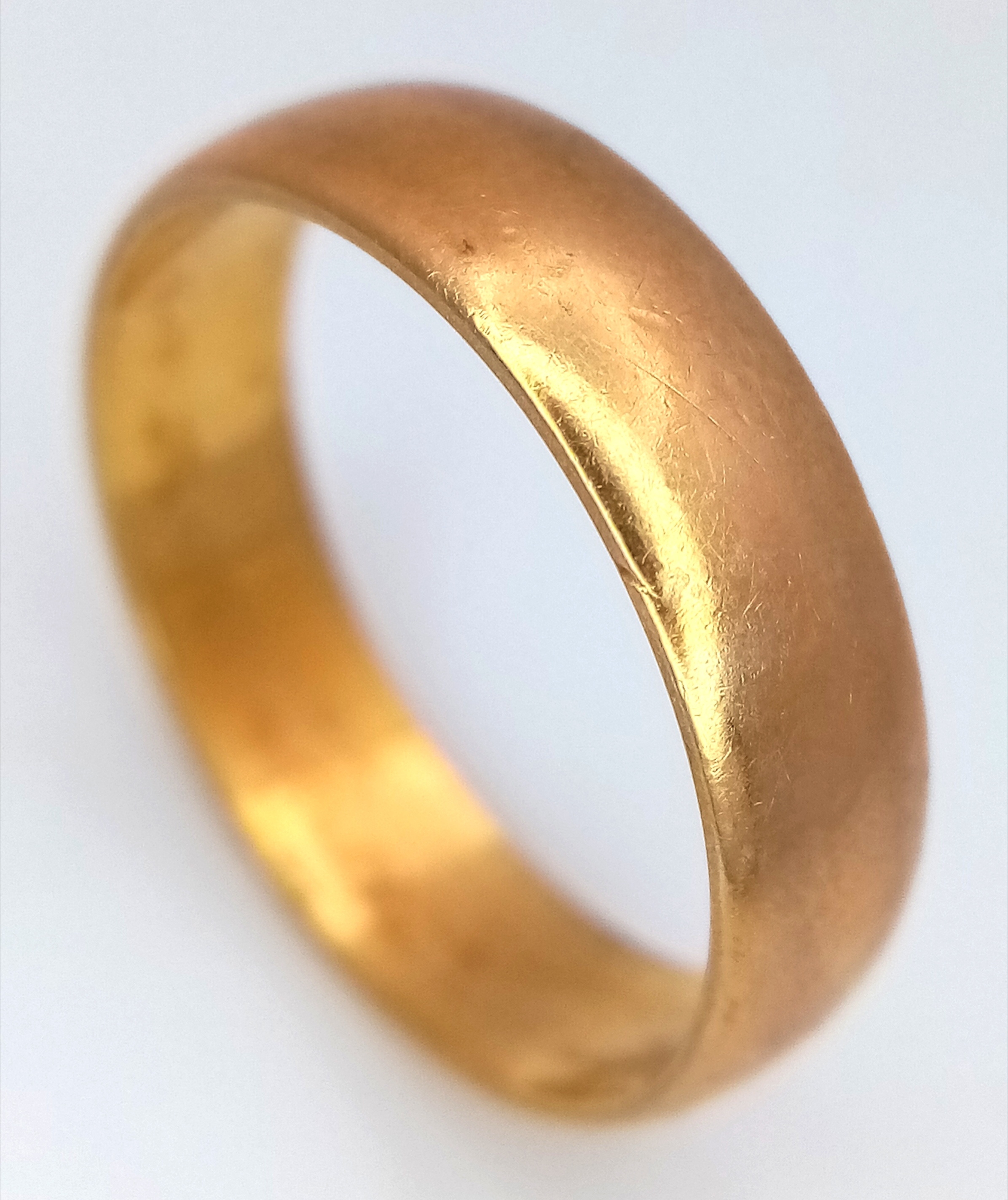 A 22K Yellow Gold Band Ring. 6mm width. Full UK hallmarks. 4.35g.