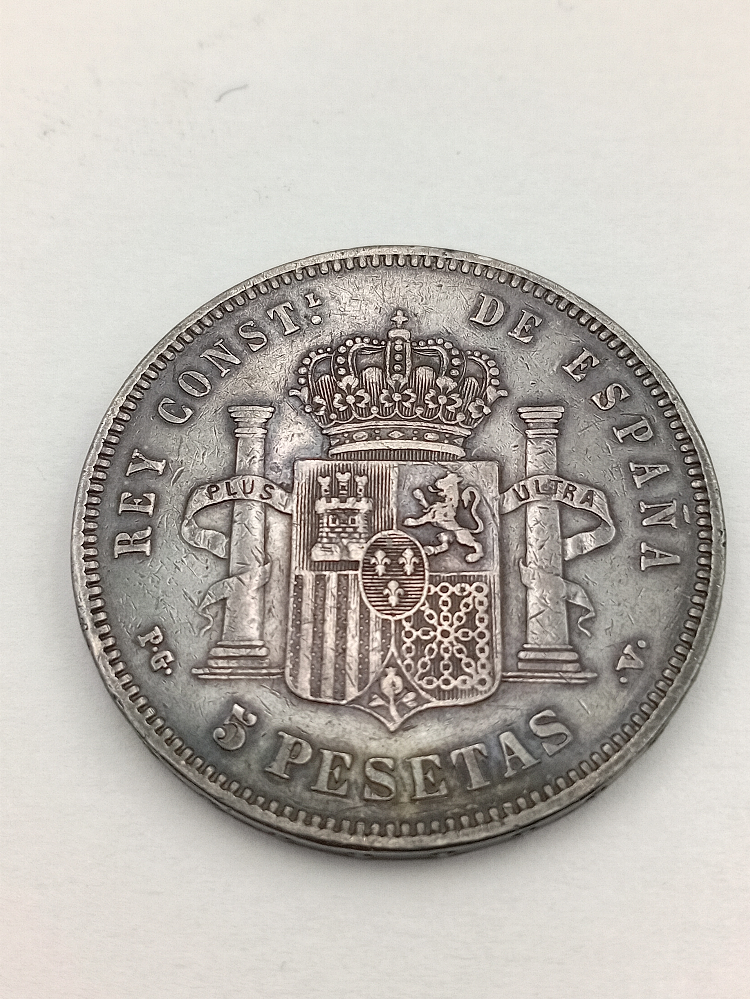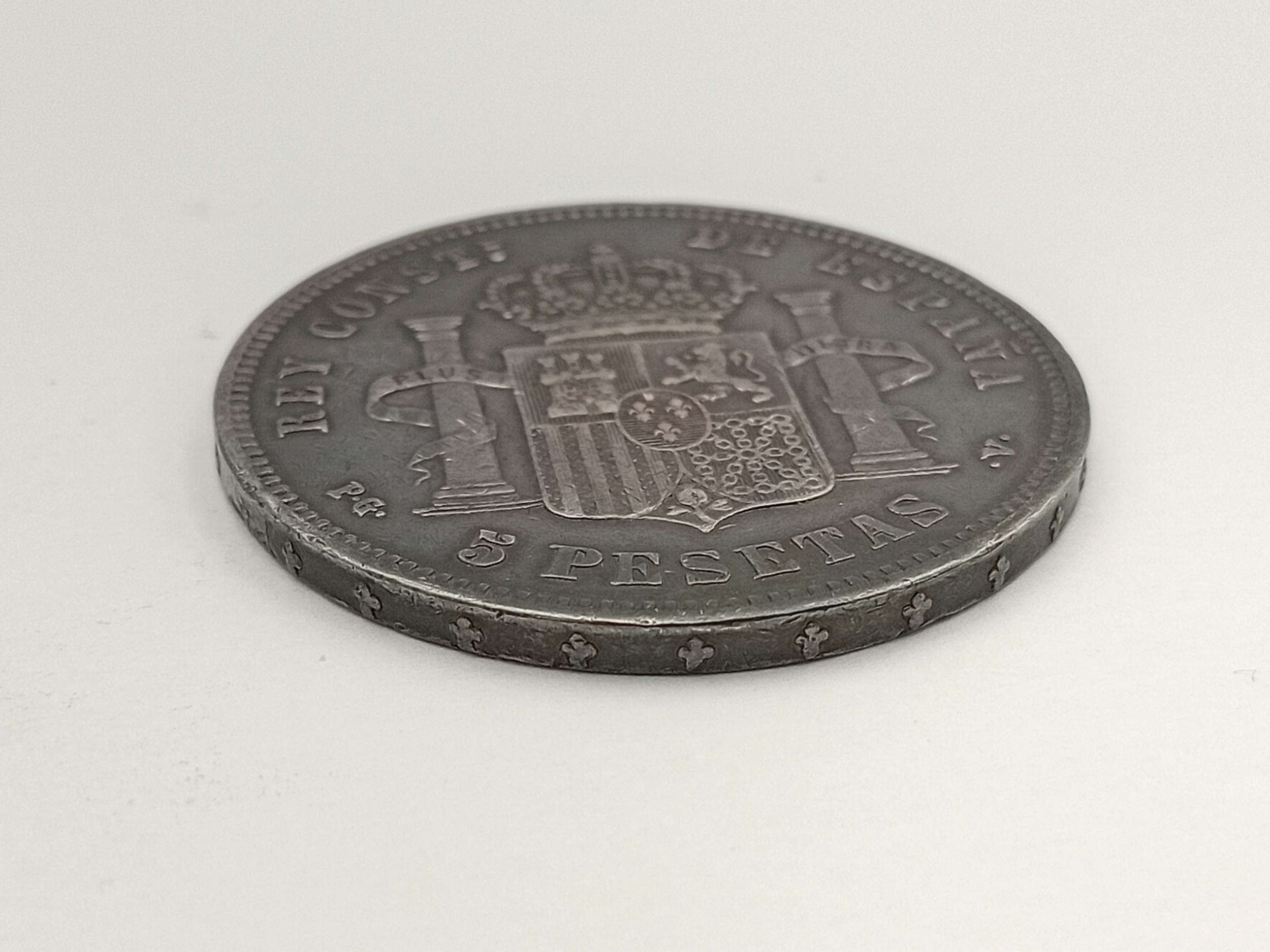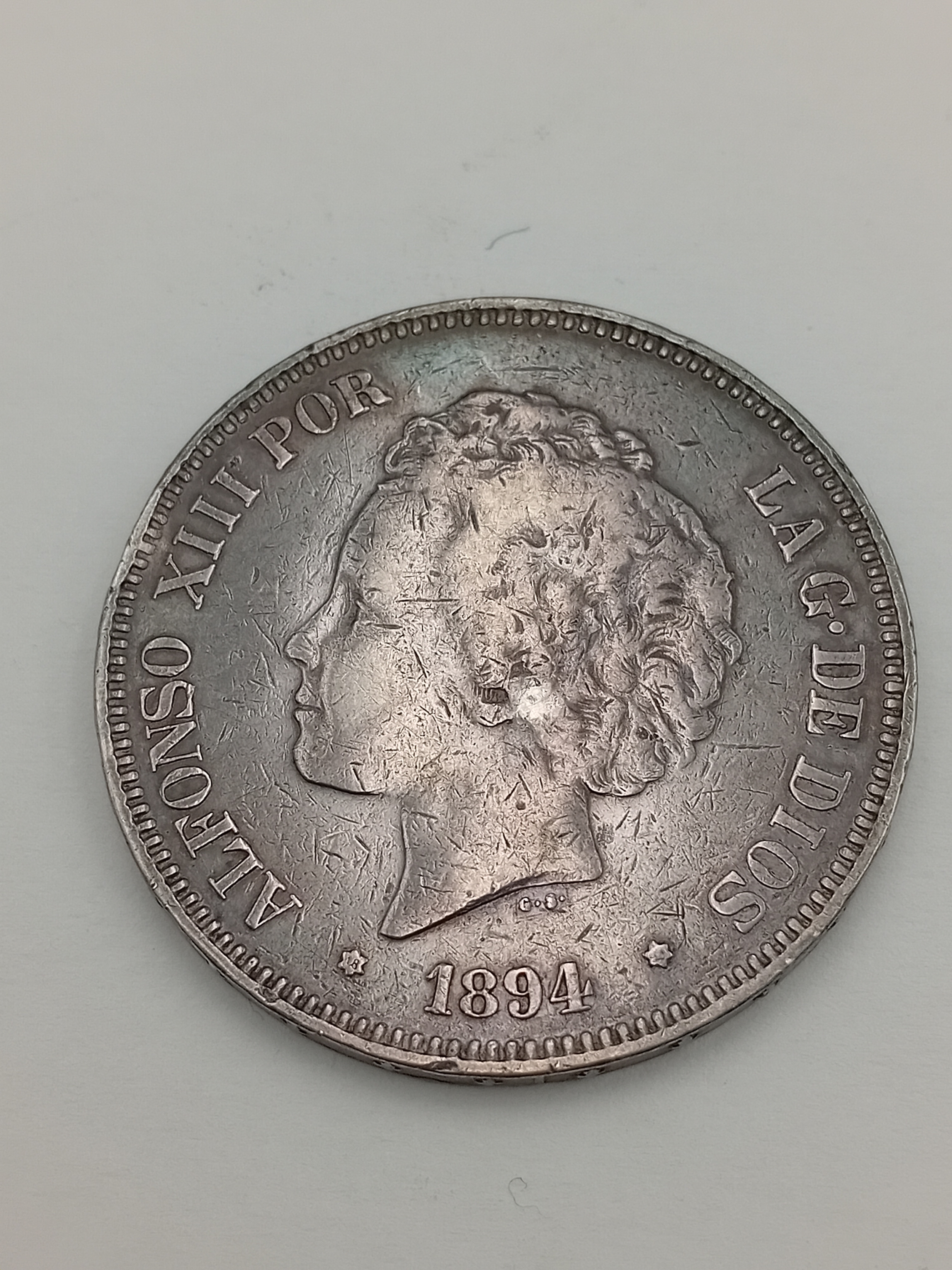 An 1894 Alfonso XII Por La G-De Dios 5 Pesetas Silver Coin.