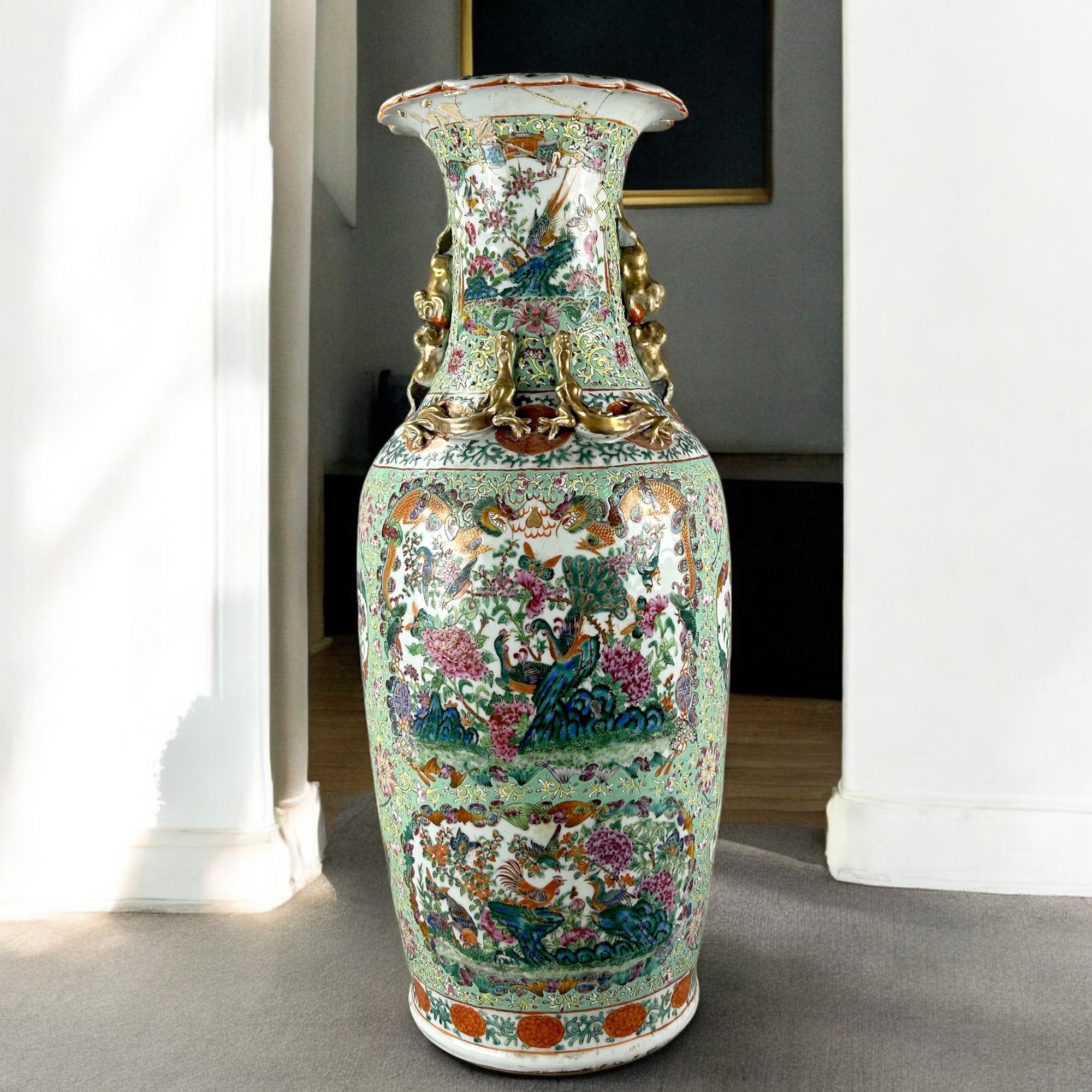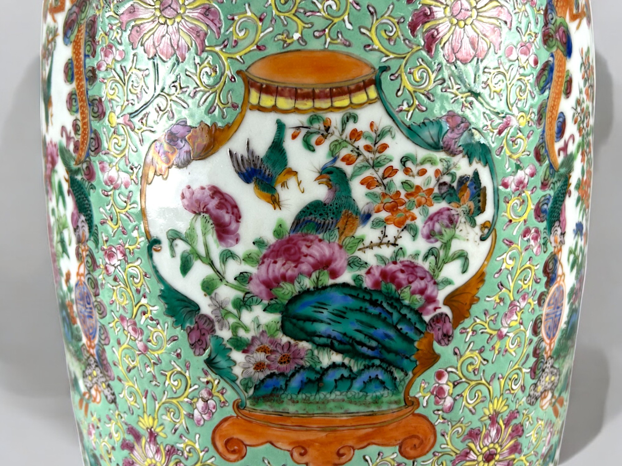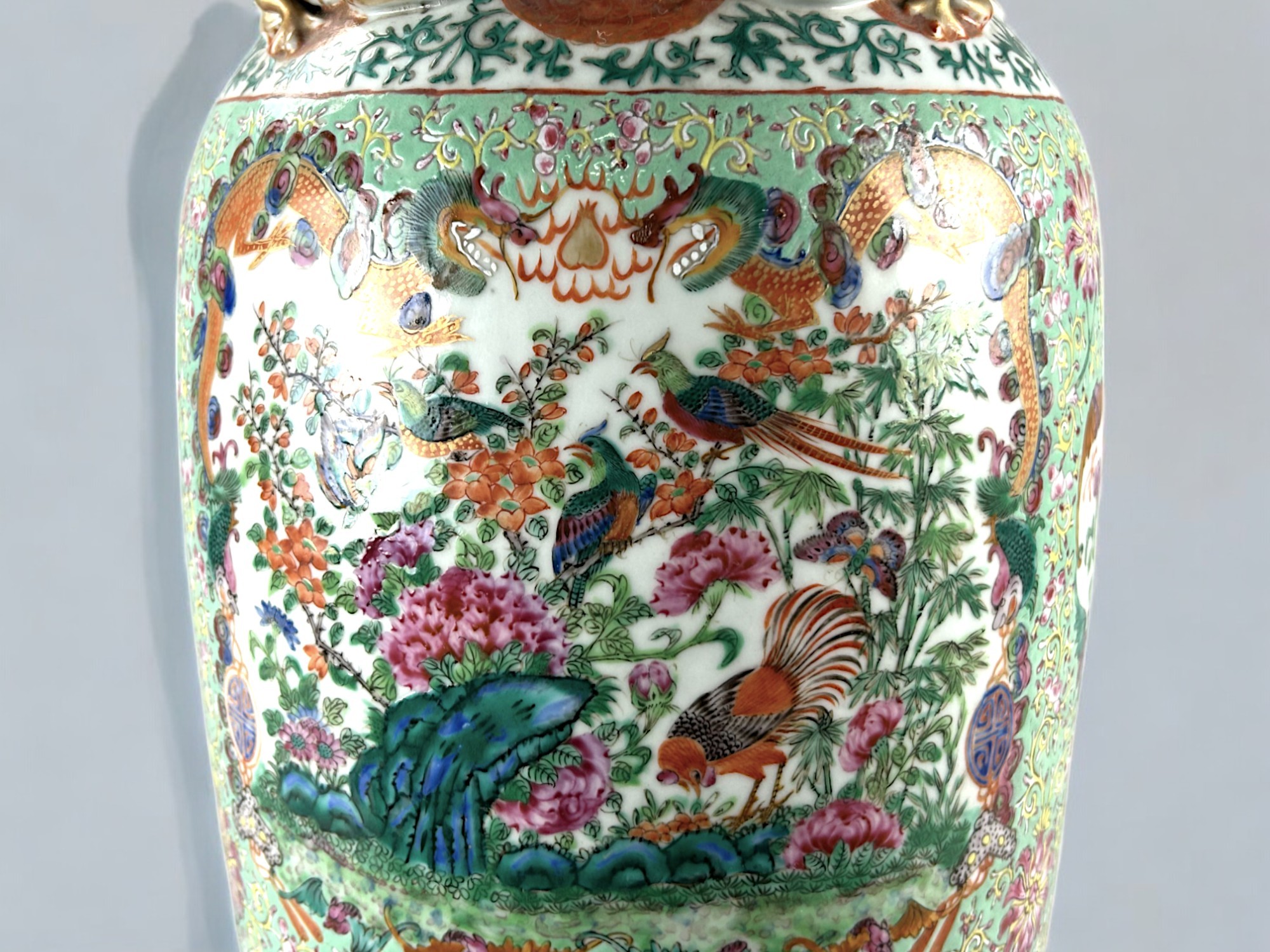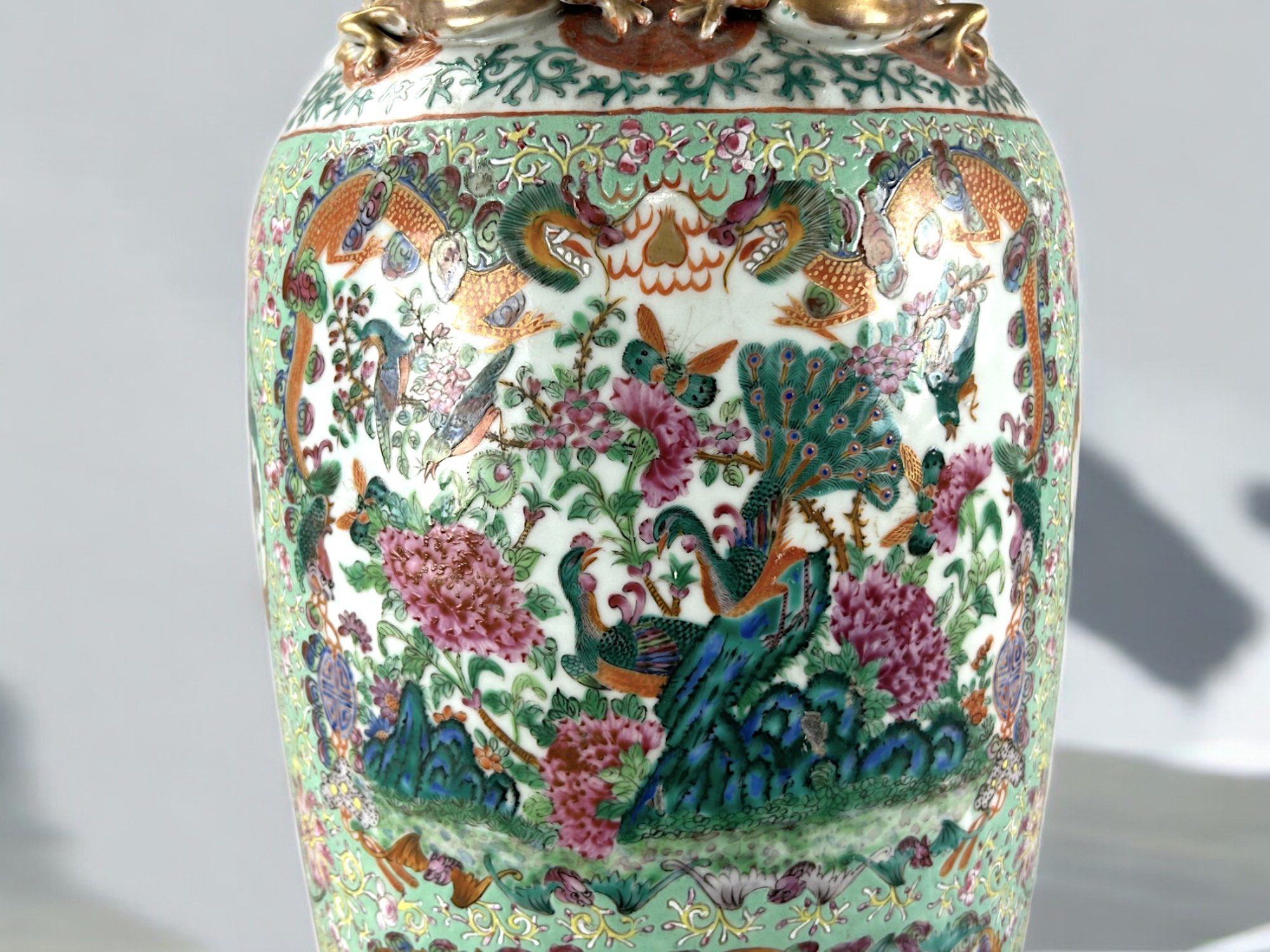 Turquoise ground, finely painted with panels of exotic birds and foliage amongst stylised blossoming foliate and mounted with gilt dragons.