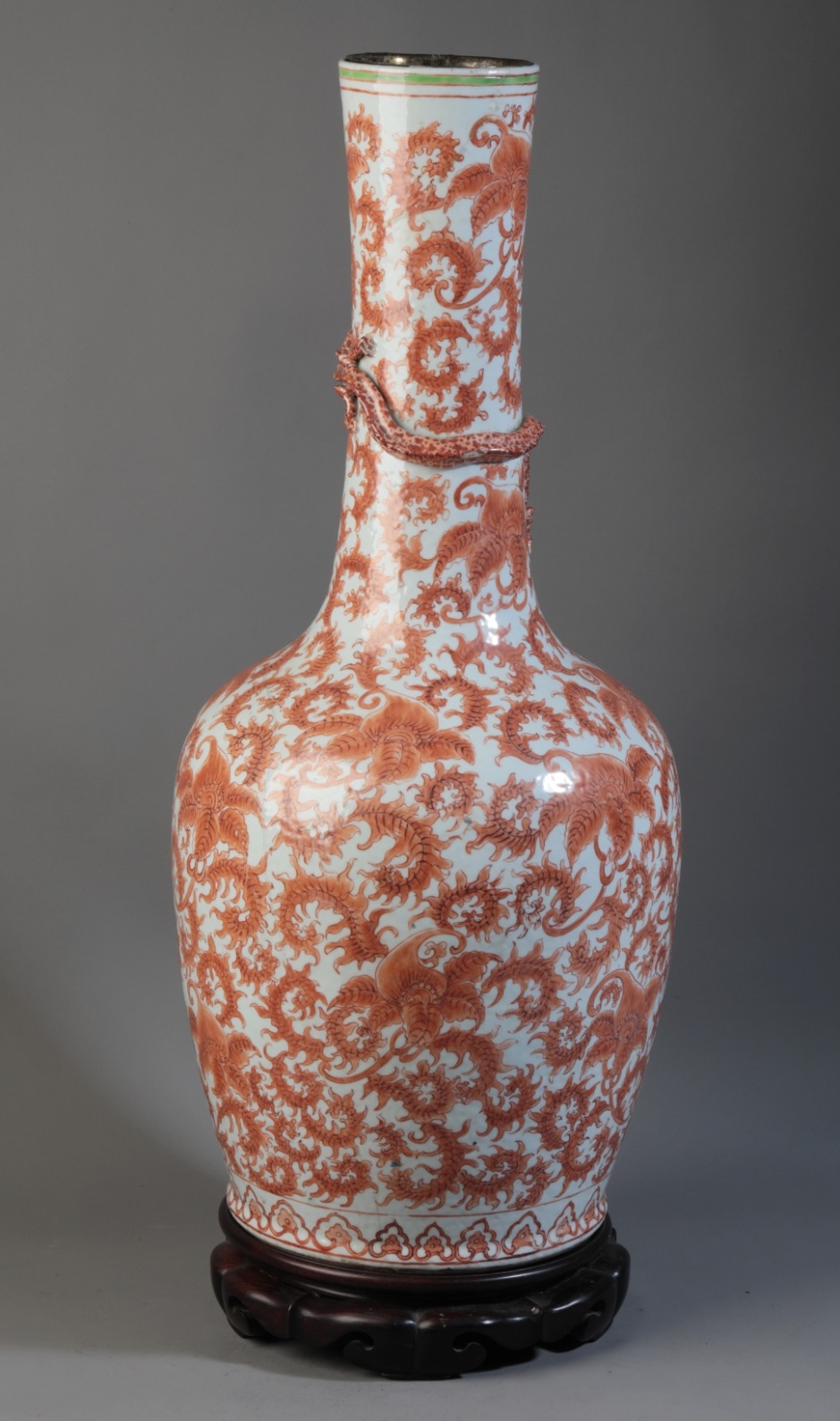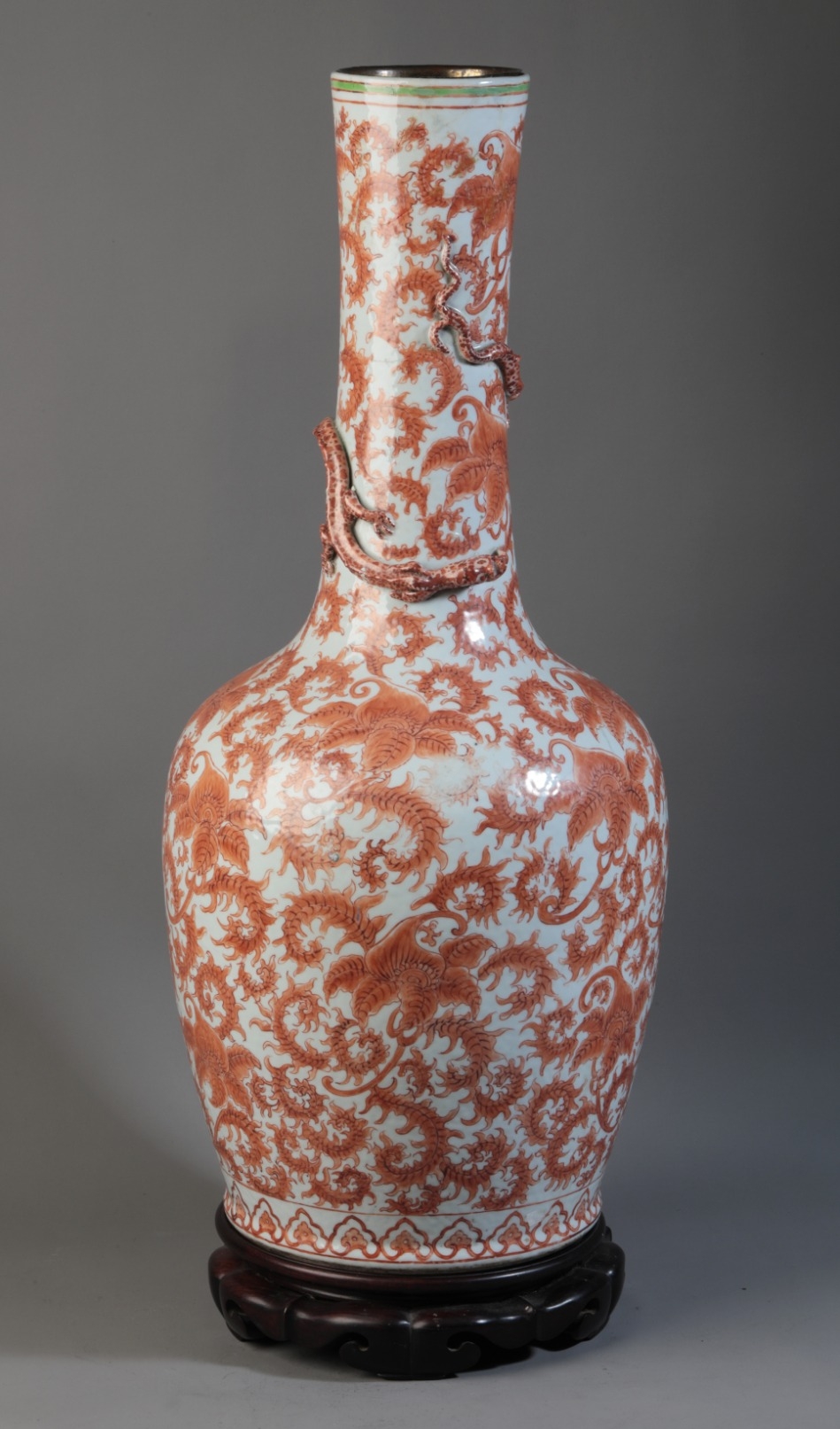 19th century, the slender neck with an applied chilong, the body decorated throughout with a profusion of leaves and foliage, 62cm high, on a hardwood stand