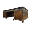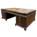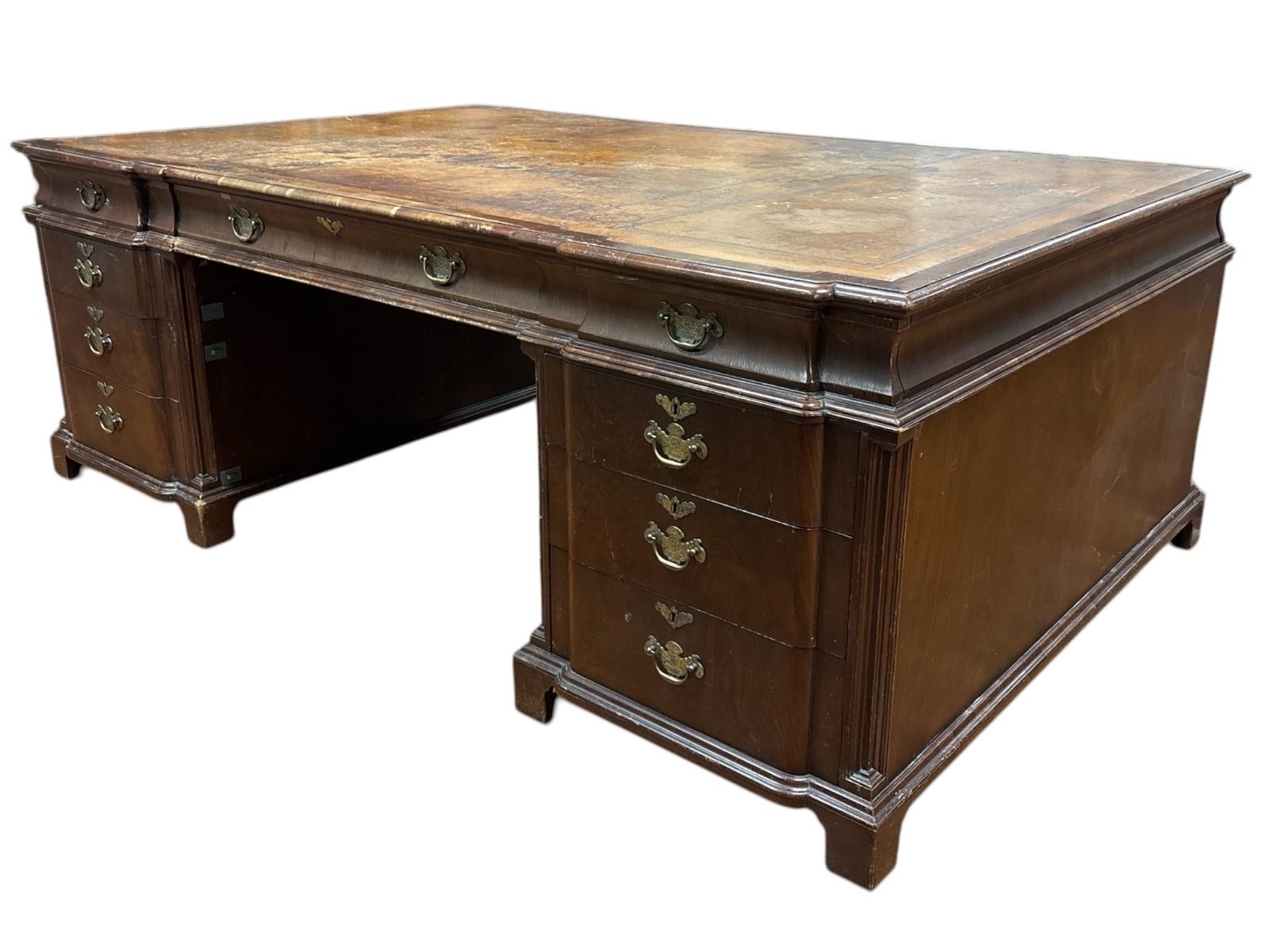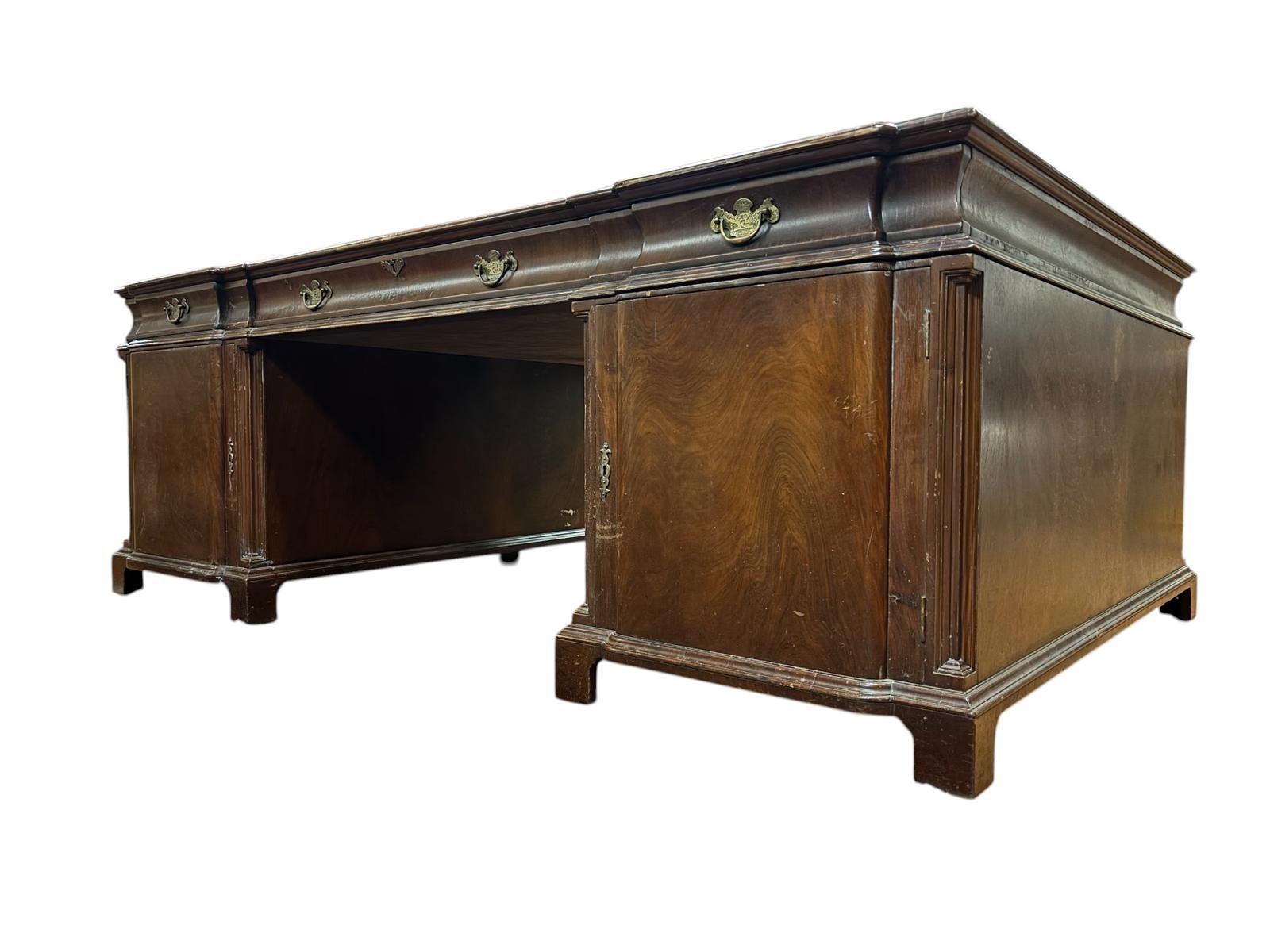 A GEORGIAN STYLE MAHOGANY PARTNER'S DESK the shaped top with tooled leather inset above three frieze drawers raised on twin three drawer pedestals with opposing cupboards on bracket feet 77cm (h) x 214cm (w) x 138cm (d)