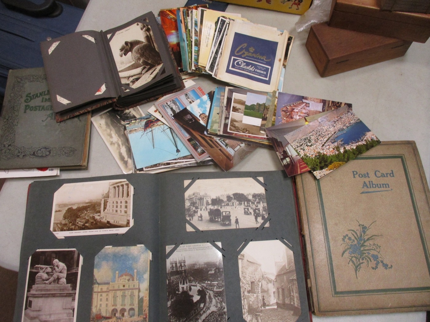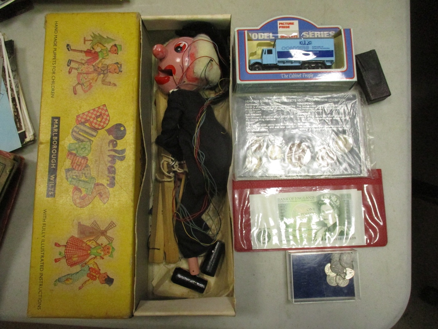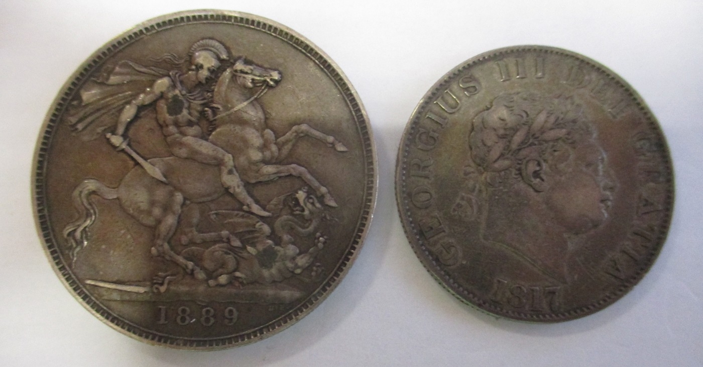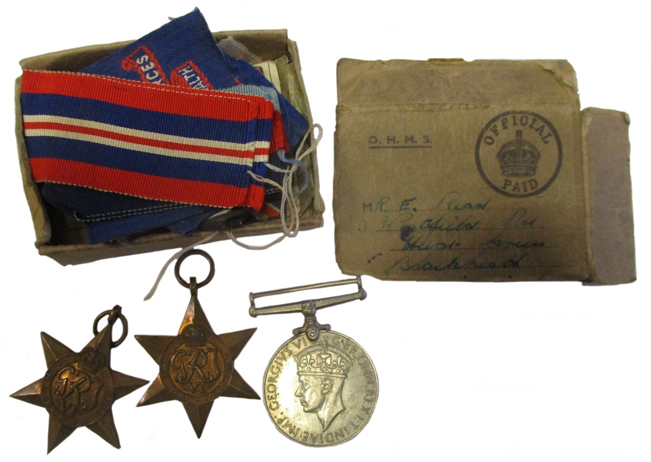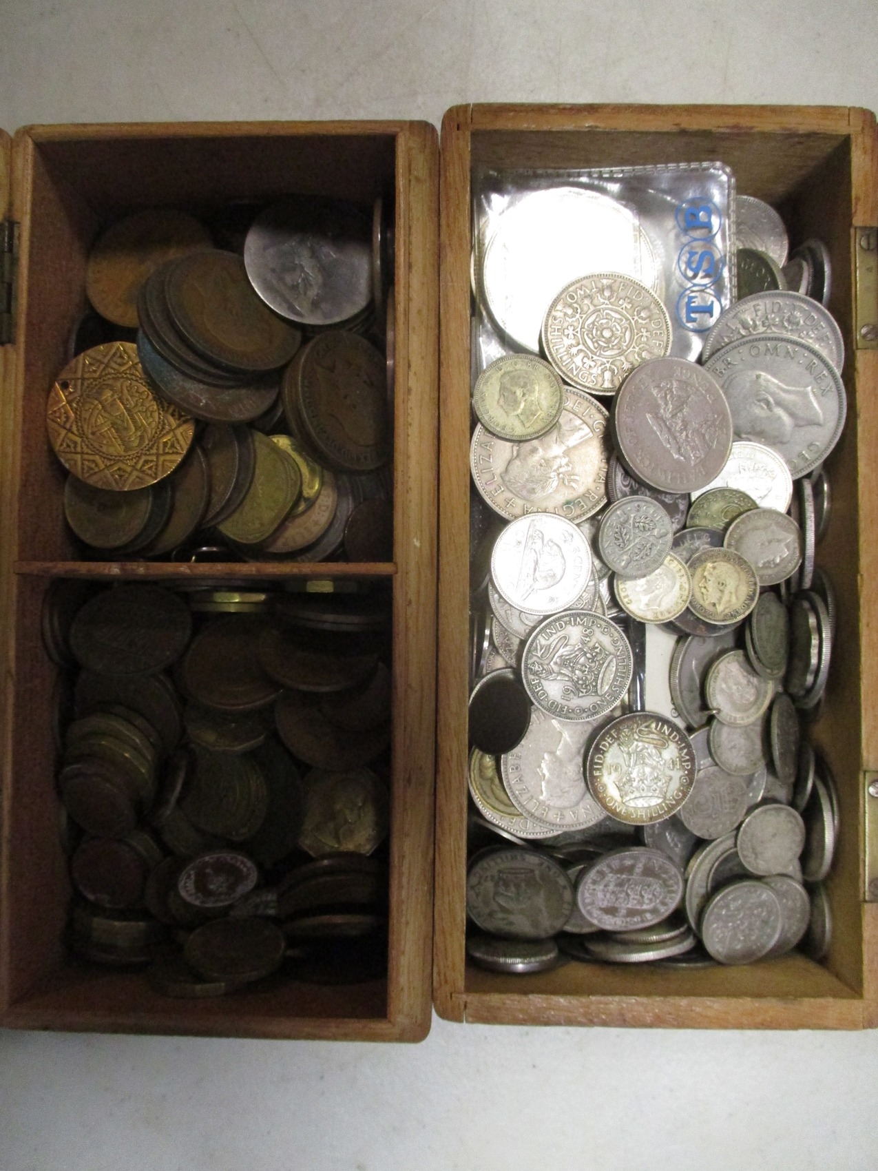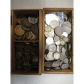 Accumulation in boxes with strength in GB including crown 1889, half crown 1817, shillings etc. Also with medals GB WW2 1939-1945, Burma Stars and BWM in Infantry box of issue addressed to Mr E. Read, Blackheath, few cap badges, Pelham Puppet, good range of postcards and a few stamps, in mixed condition. Qty 100s (½B)
