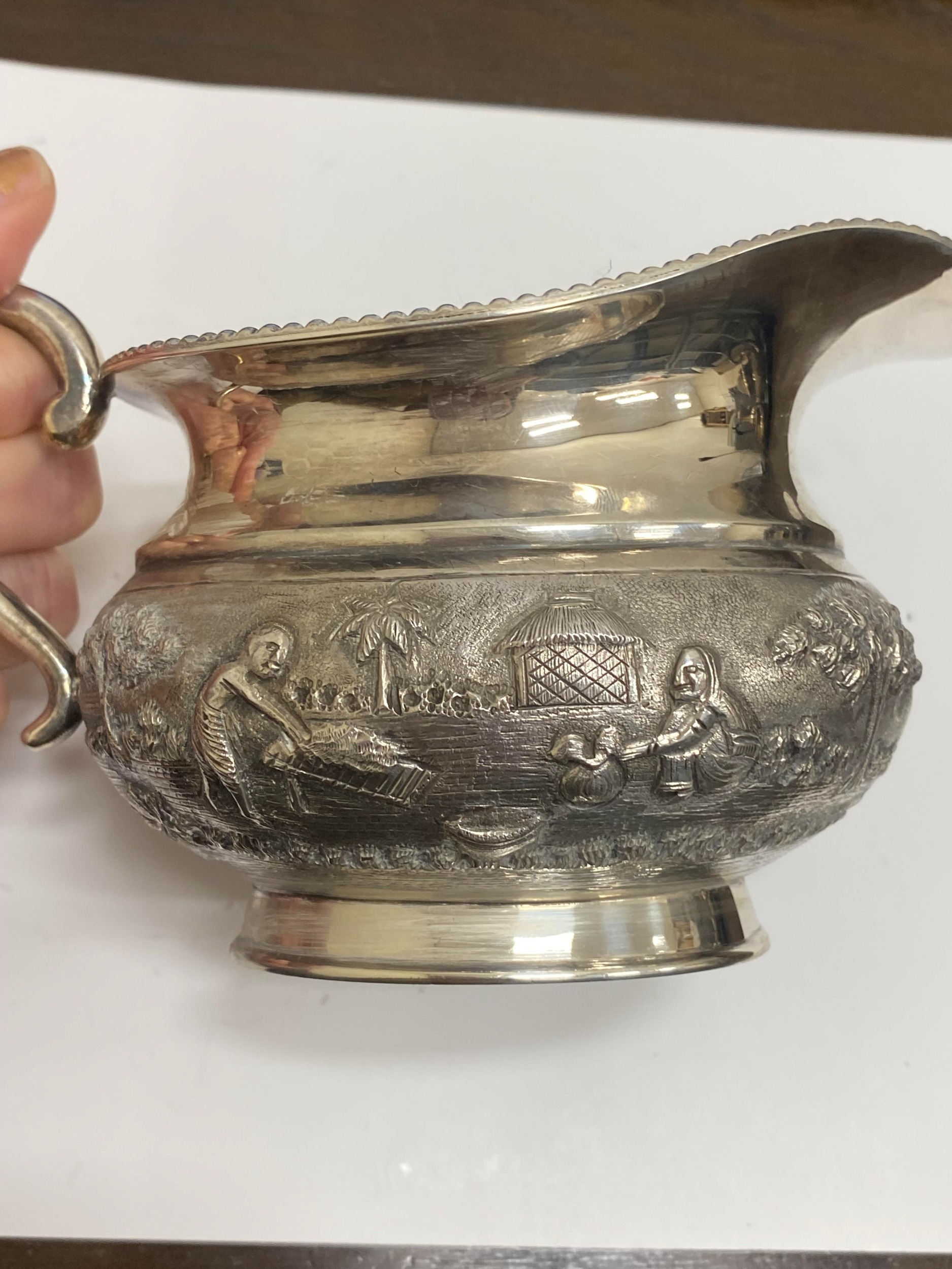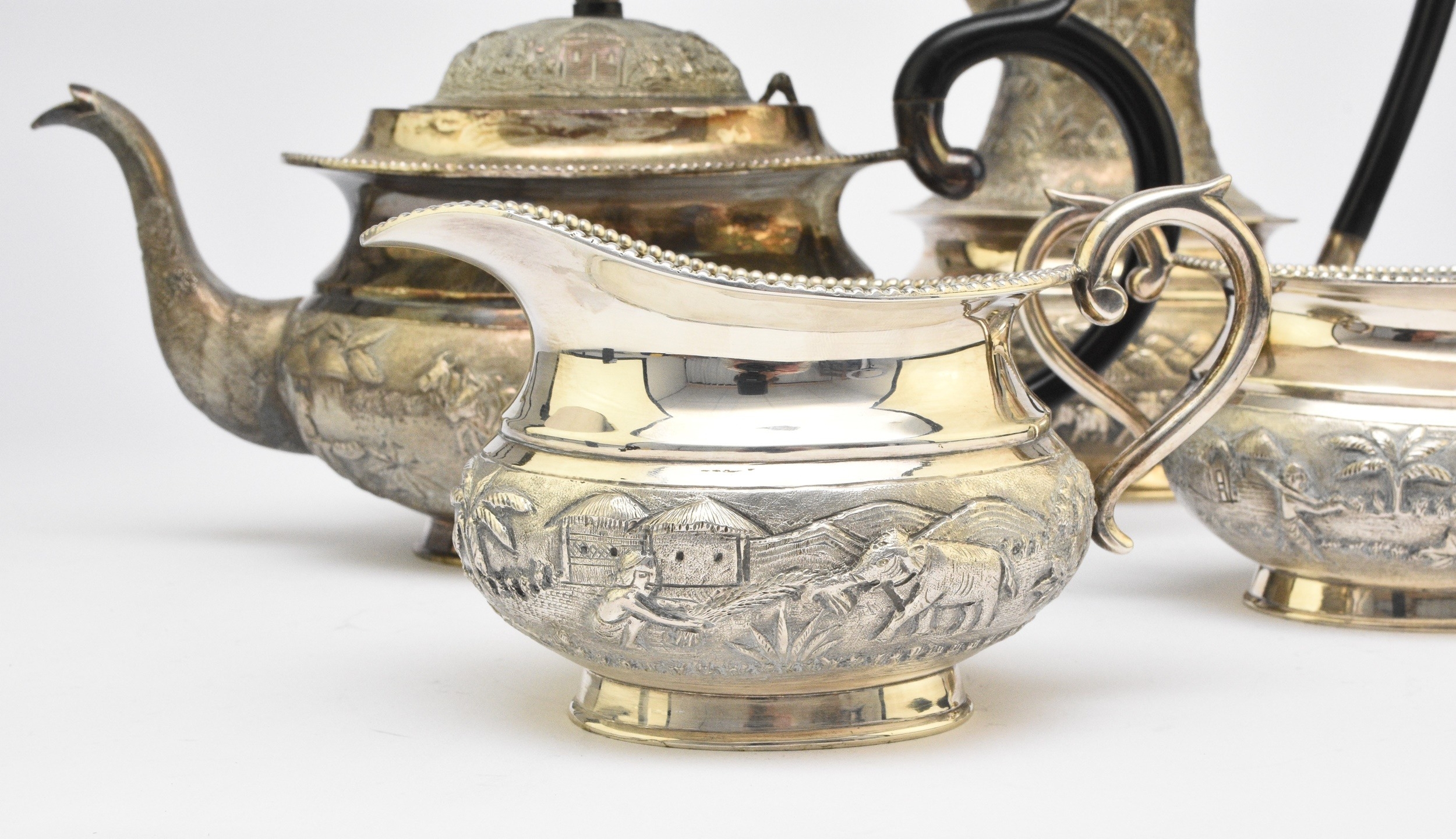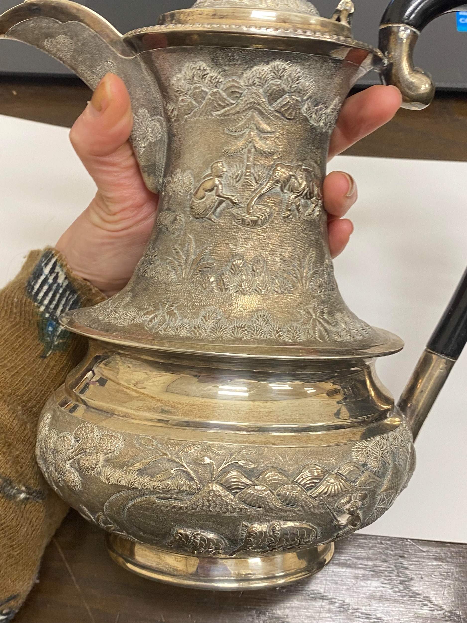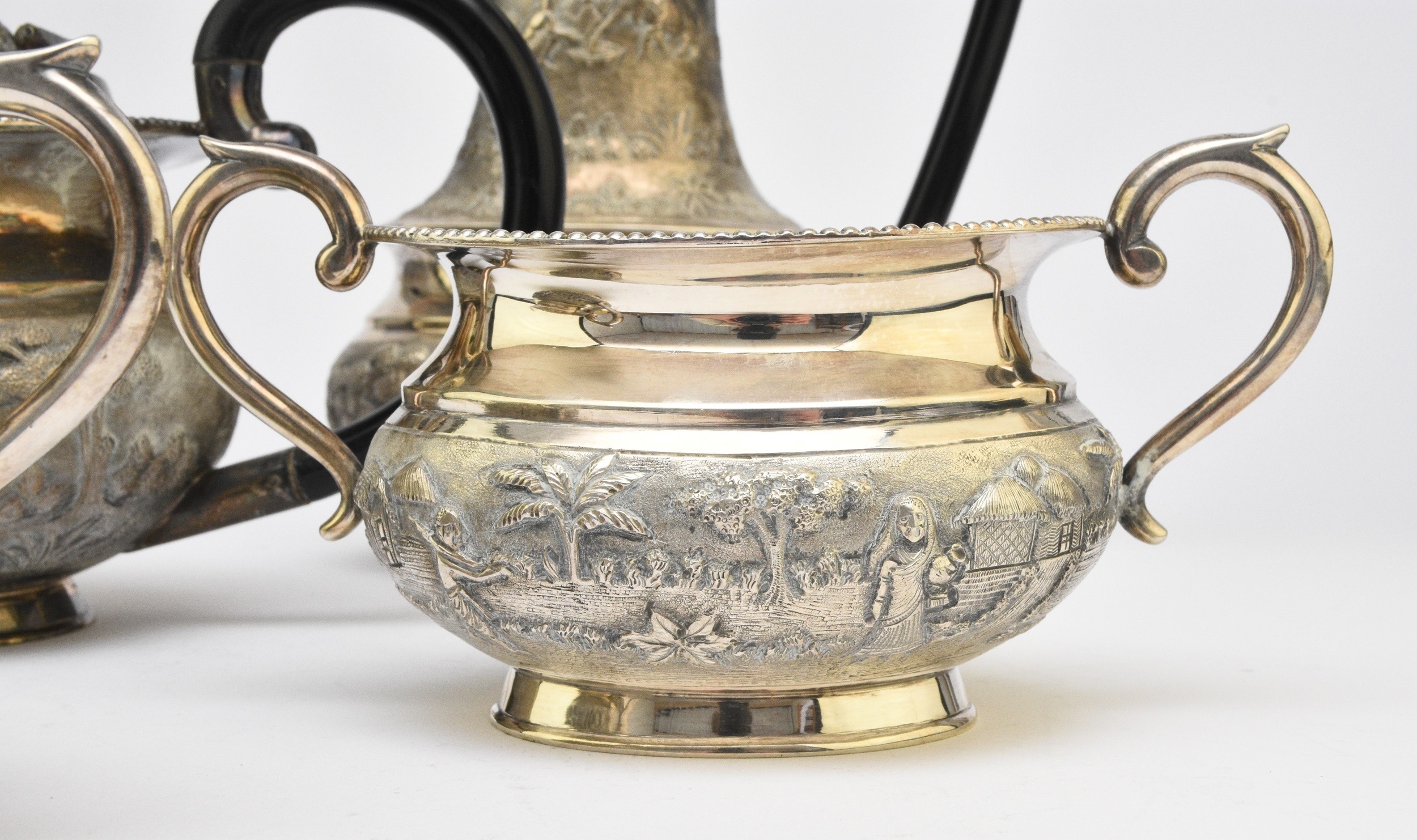 A 'Sterling Silver' South East Asian four piece tea service, each piece of oval form with figural and animal decoration against a landscape ground, comprising; a teapot with ebony handle and finial, 15.5cm high, a hot water jug with ebony handle and finial, 23.5cm high, a two handled sugar bowl, 9.5cm high and a cream jug, 9.5cm high, each piece raised on oval foot and stamped 'Sterling Silver', total weight approx 71oz (4) Condition:Cover of the teapot does not sit flush with body, other than this just general wear commensurate with age, refer to images