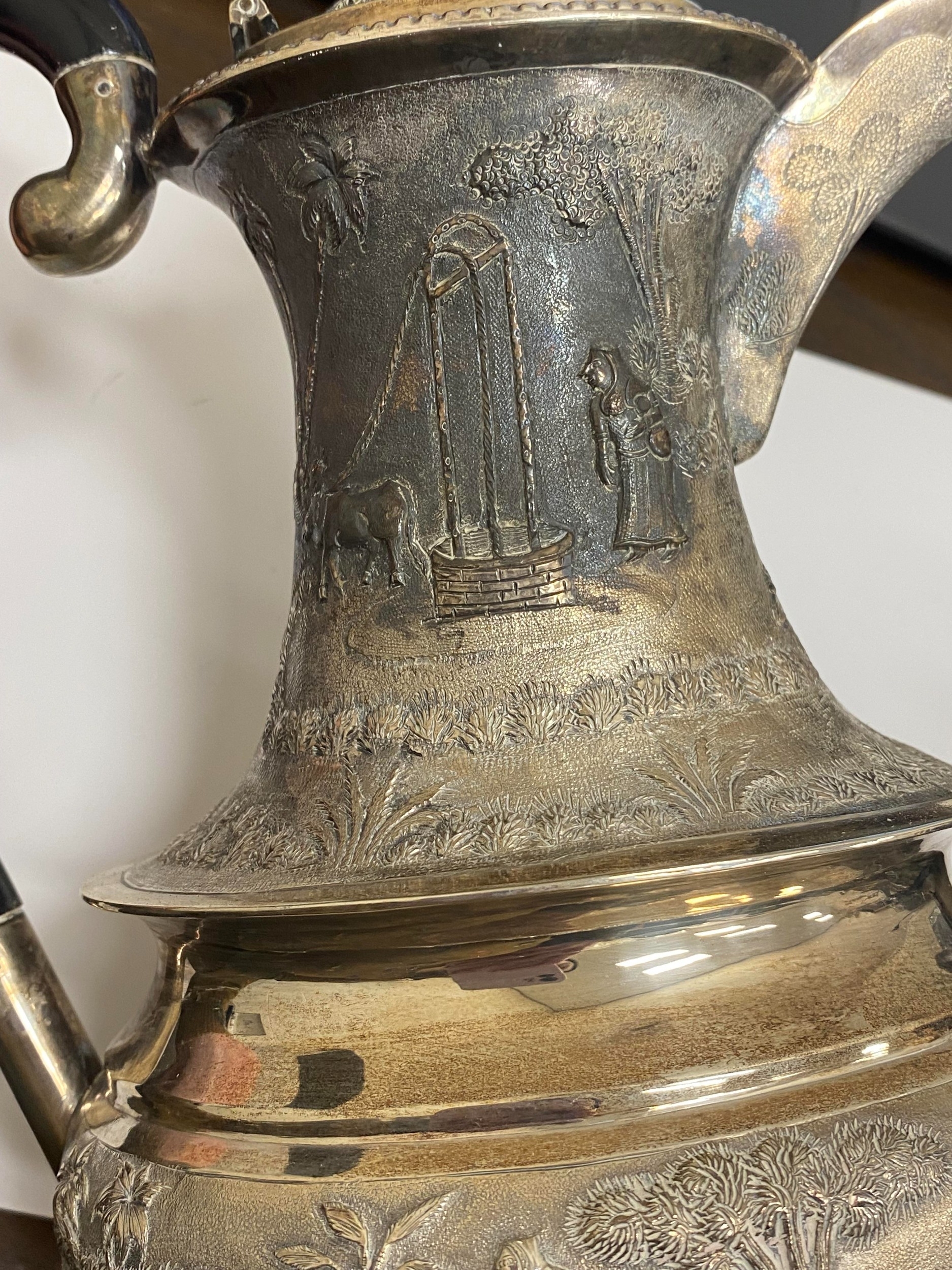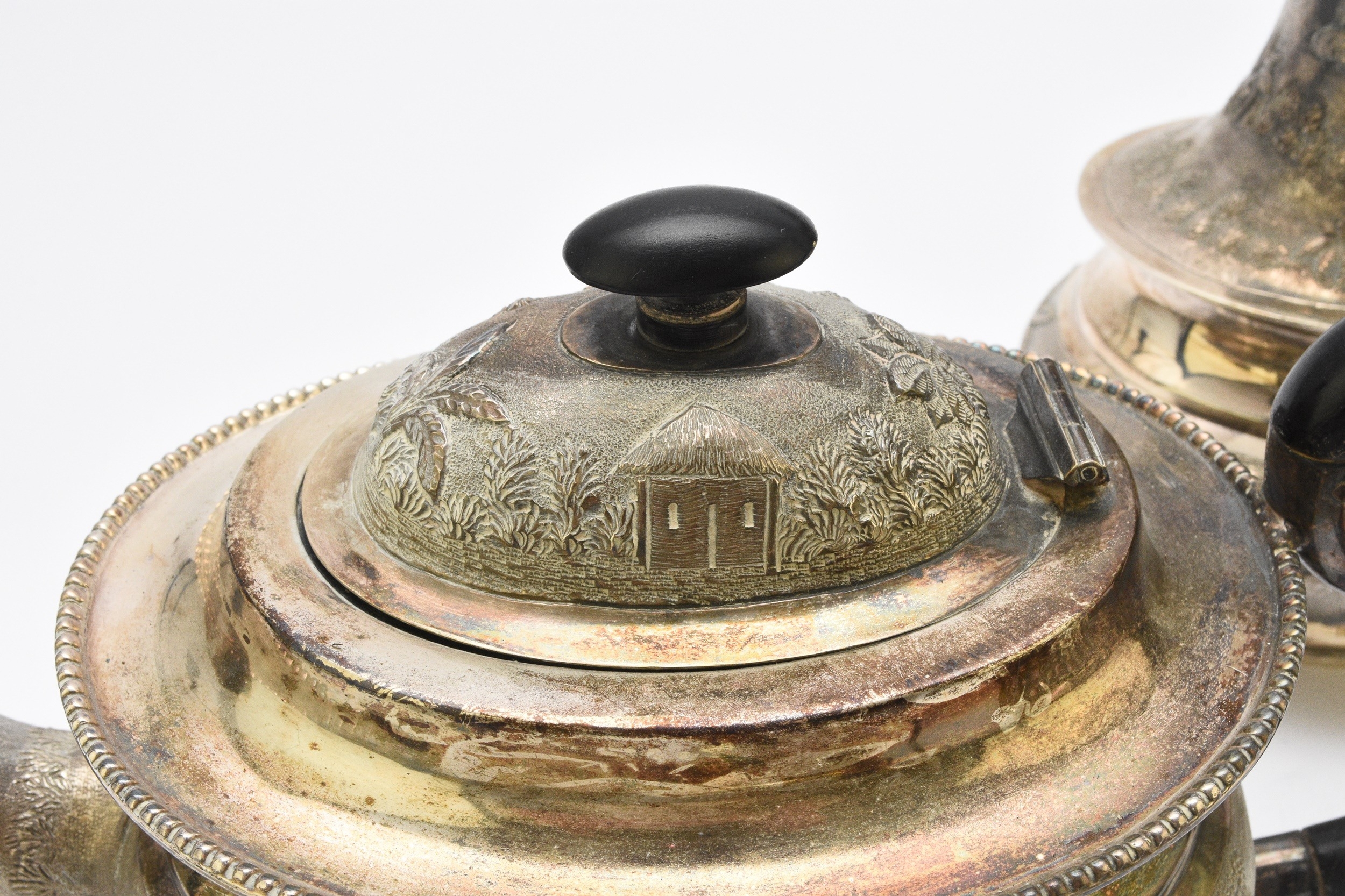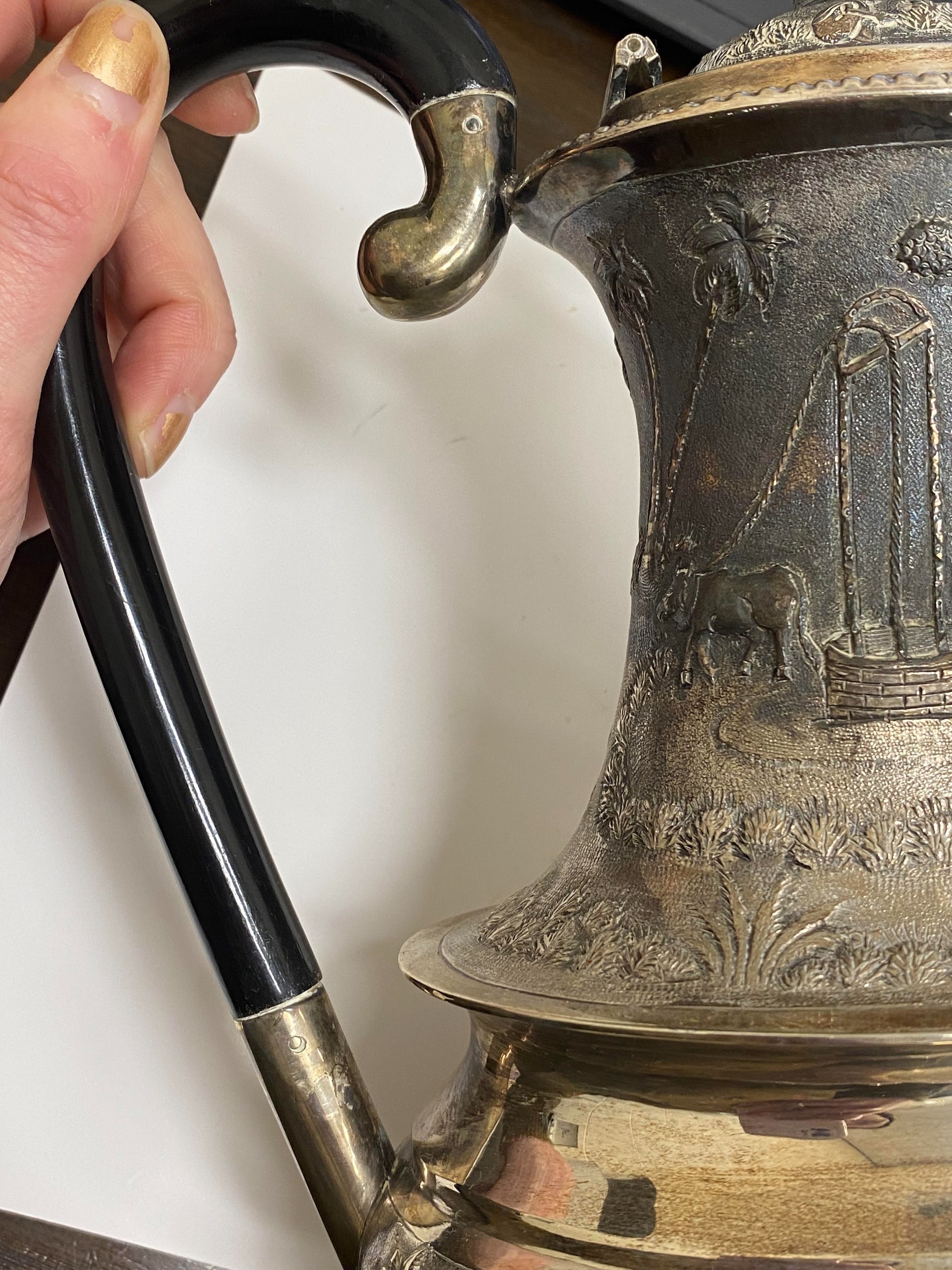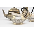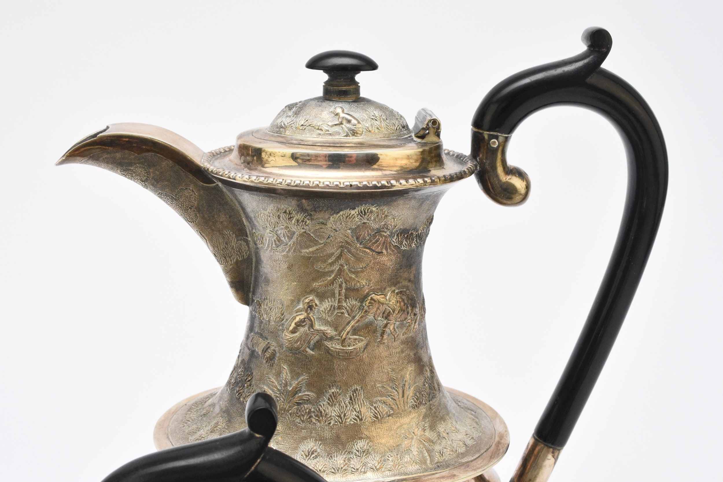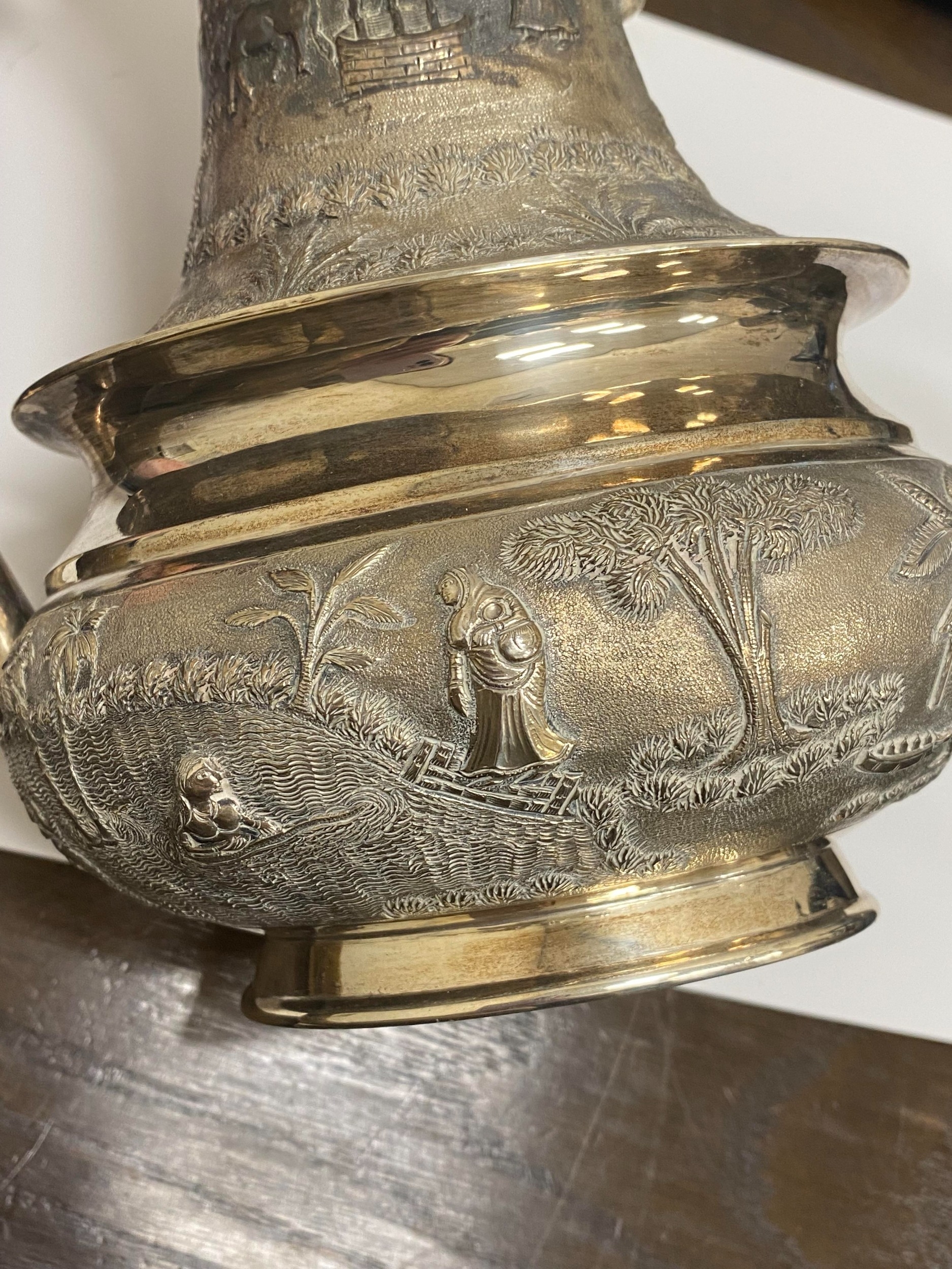 A 'Sterling Silver' South East Asian four piece tea service, each piece of oval form with figural and animal decoration against a landscape ground, comprising; a teapot with ebony handle and finial, 15.5cm high, a hot water jug with ebony handle and finial, 23.5cm high, a two handled sugar bowl, 9.5cm high and a cream jug, 9.5cm high, each piece raised on oval foot and stamped 'Sterling Silver', total weight approx 71oz (4) Condition:Cover of the teapot does not sit flush with body, other than this just general wear commensurate with age, refer to images