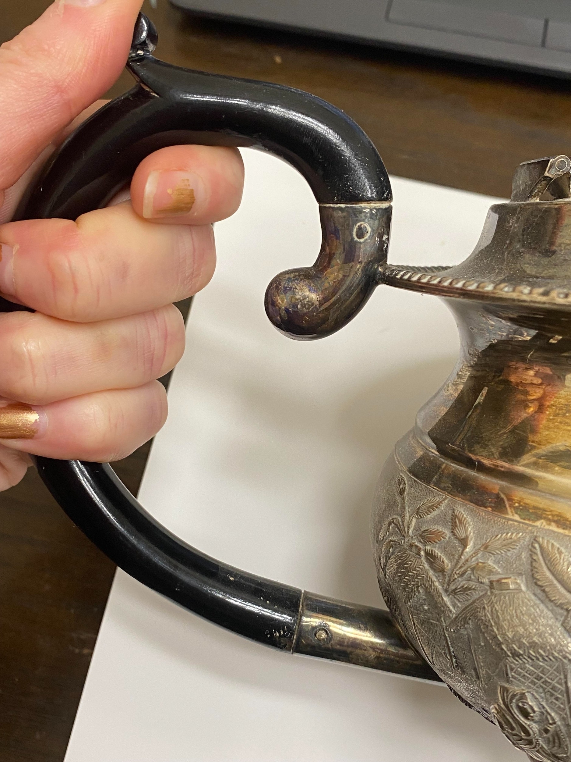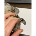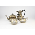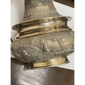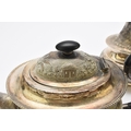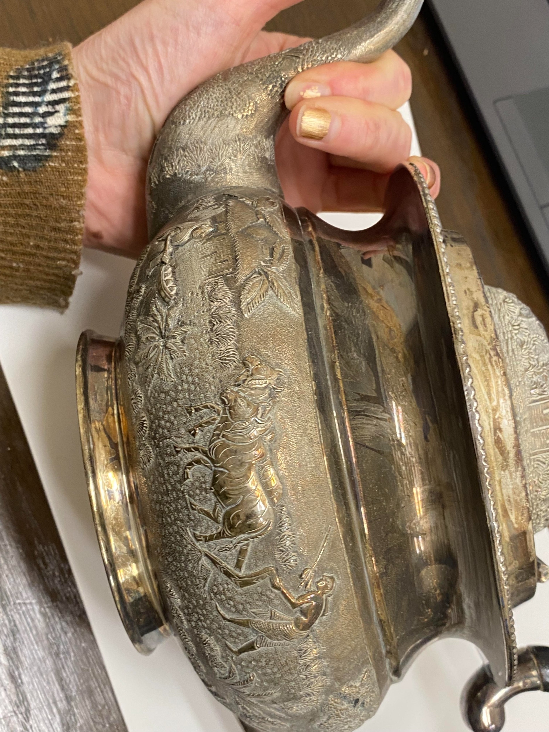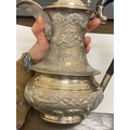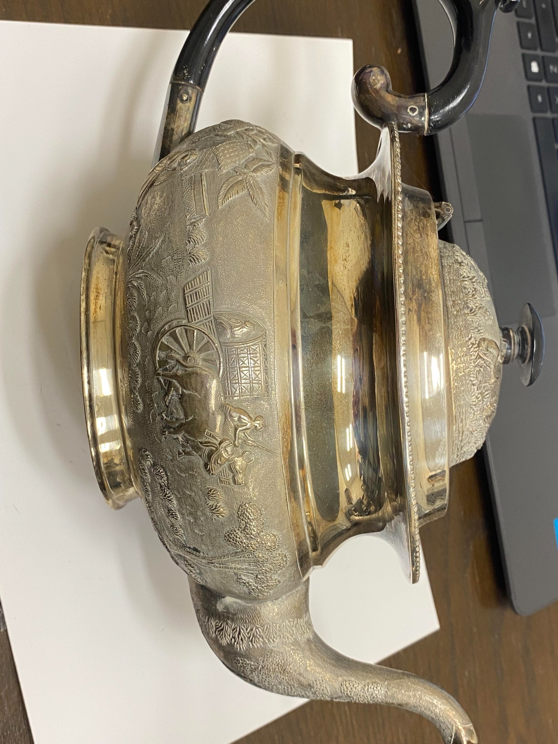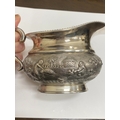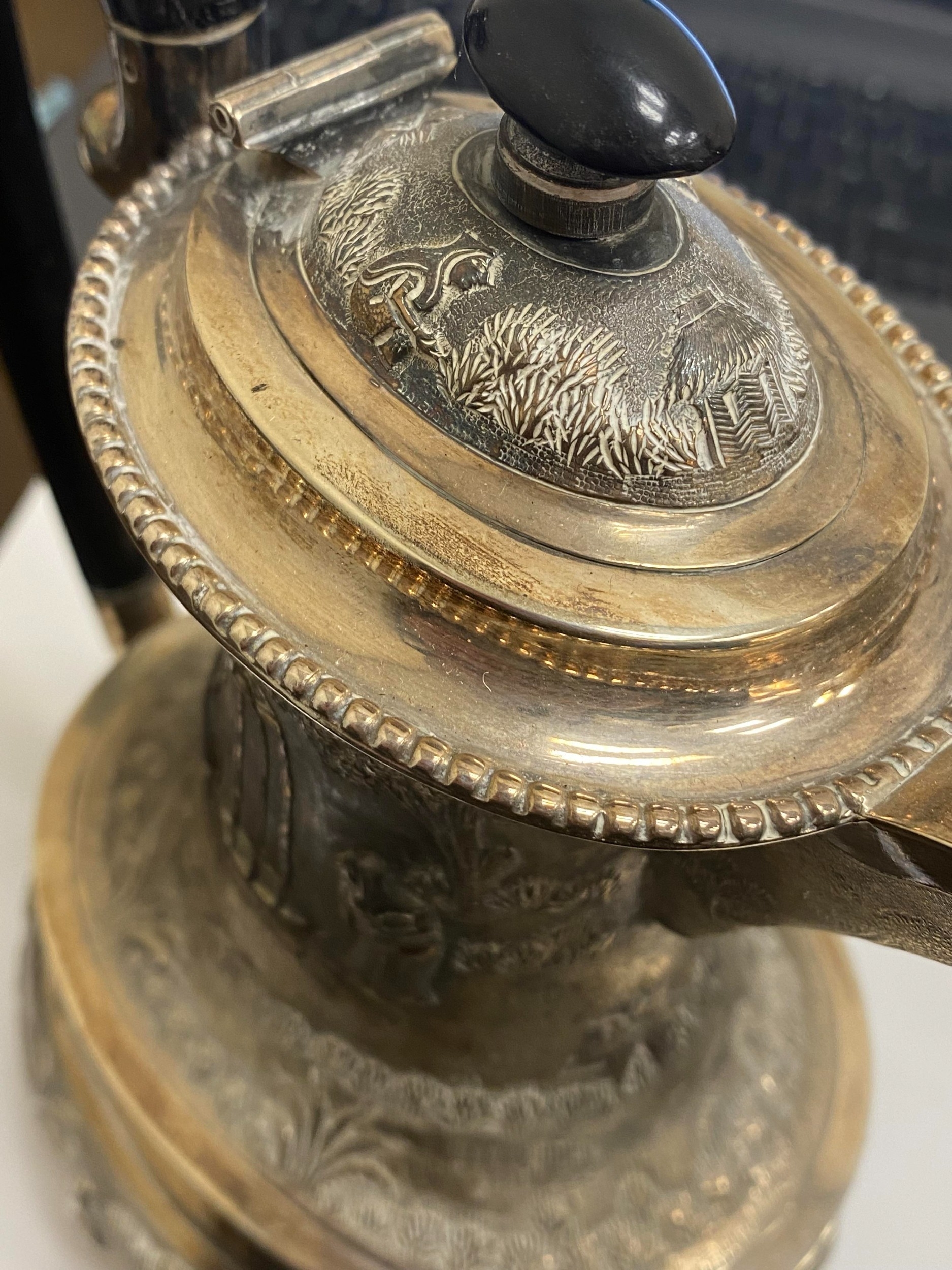 A 'Sterling Silver' South East Asian four piece tea service, each piece of oval form with figural and animal decoration against a landscape ground, comprising; a teapot with ebony handle and finial, 15.5cm high, a hot water jug with ebony handle and finial, 23.5cm high, a two handled sugar bowl, 9.5cm high and a cream jug, 9.5cm high, each piece raised on oval foot and stamped 'Sterling Silver', total weight approx 71oz (4) Condition:Cover of the teapot does not sit flush with body, other than this just general wear commensurate with age, refer to images