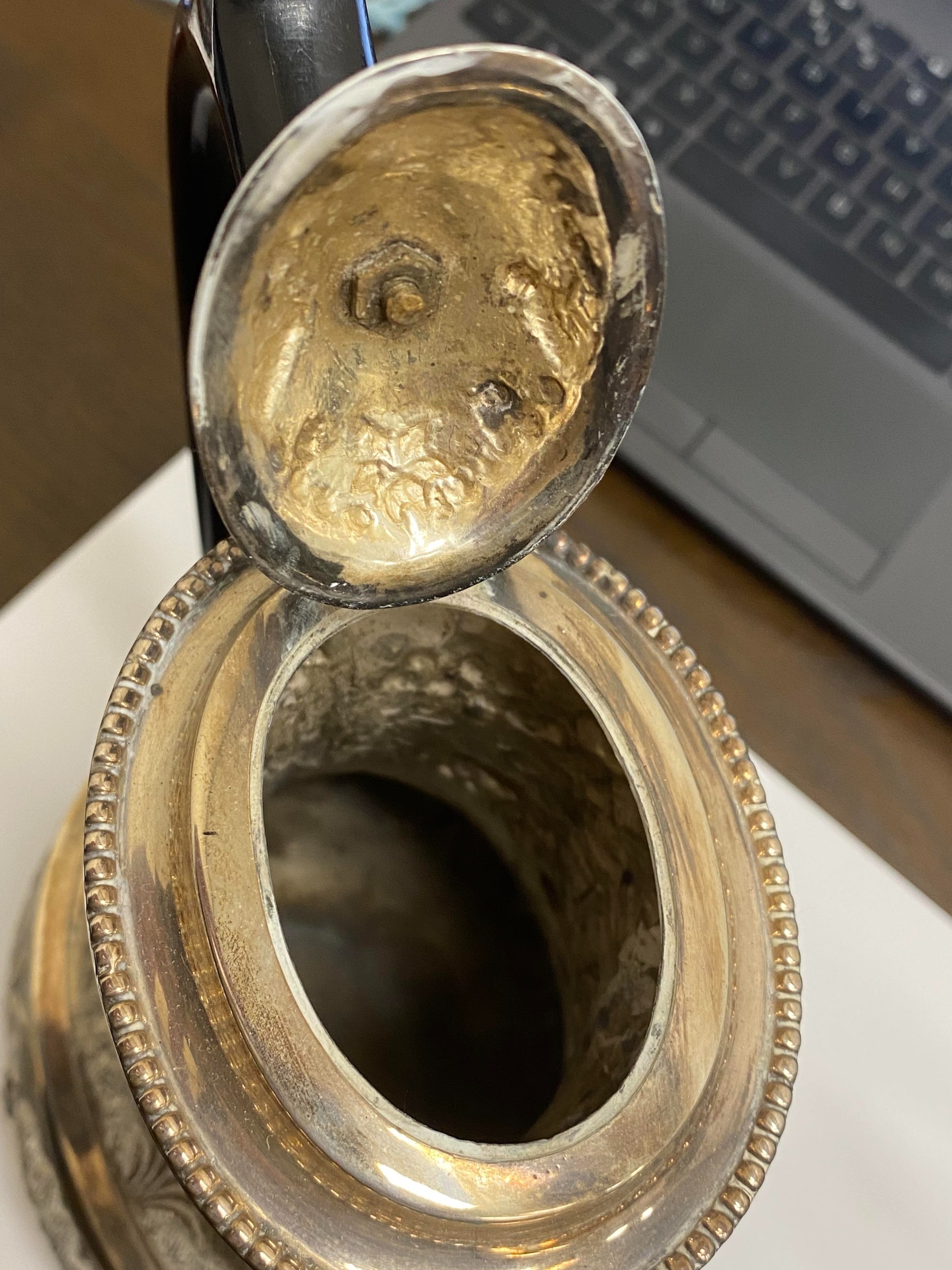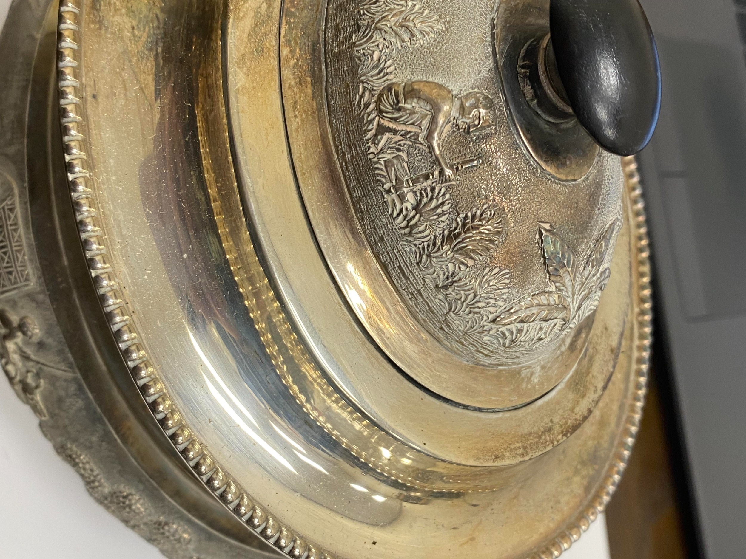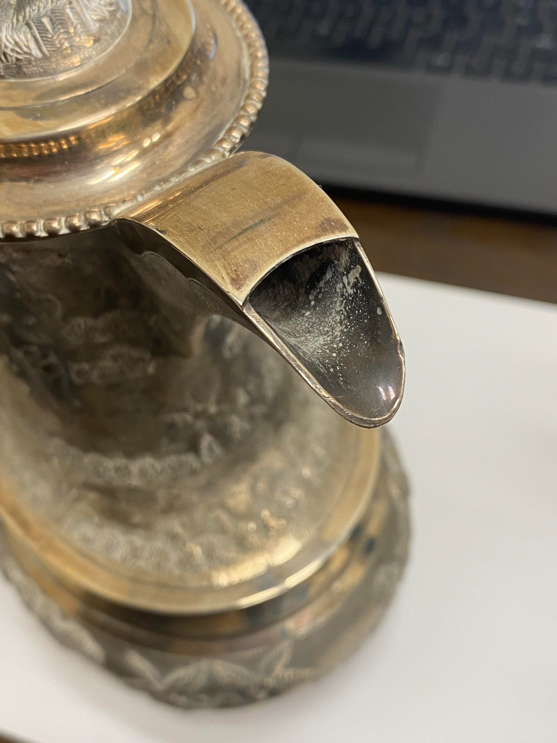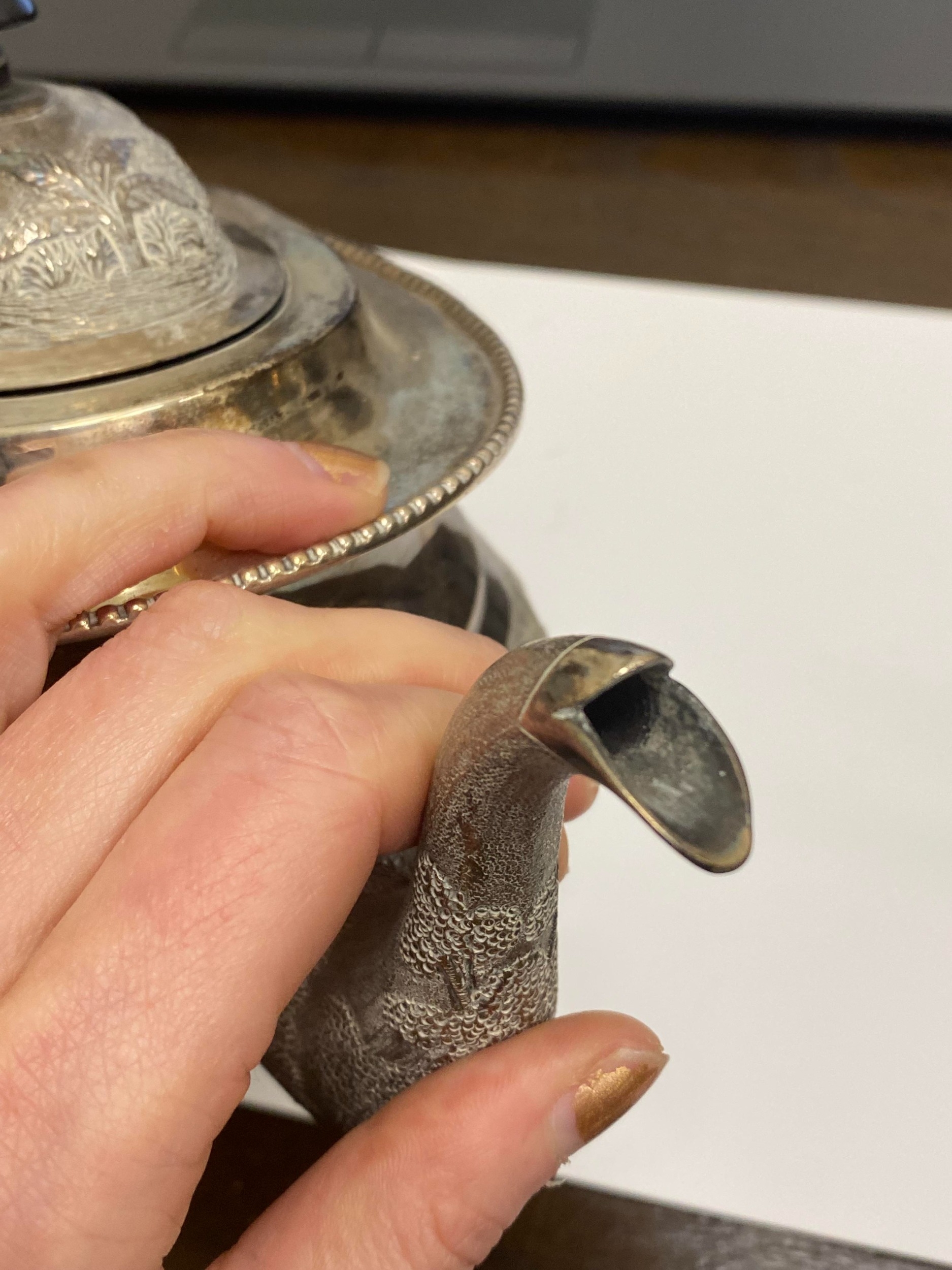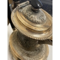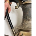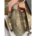 A 'Sterling Silver' South East Asian four piece tea service, each piece of oval form with figural and animal decoration against a landscape ground, comprising; a teapot with ebony handle and finial, 15.5cm high, a hot water jug with ebony handle and finial, 23.5cm high, a two handled sugar bowl, 9.5cm high and a cream jug, 9.5cm high, each piece raised on oval foot and stamped 'Sterling Silver', total weight approx 71oz (4) Condition:Cover of the teapot does not sit flush with body, other than this just general wear commensurate with age, refer to images