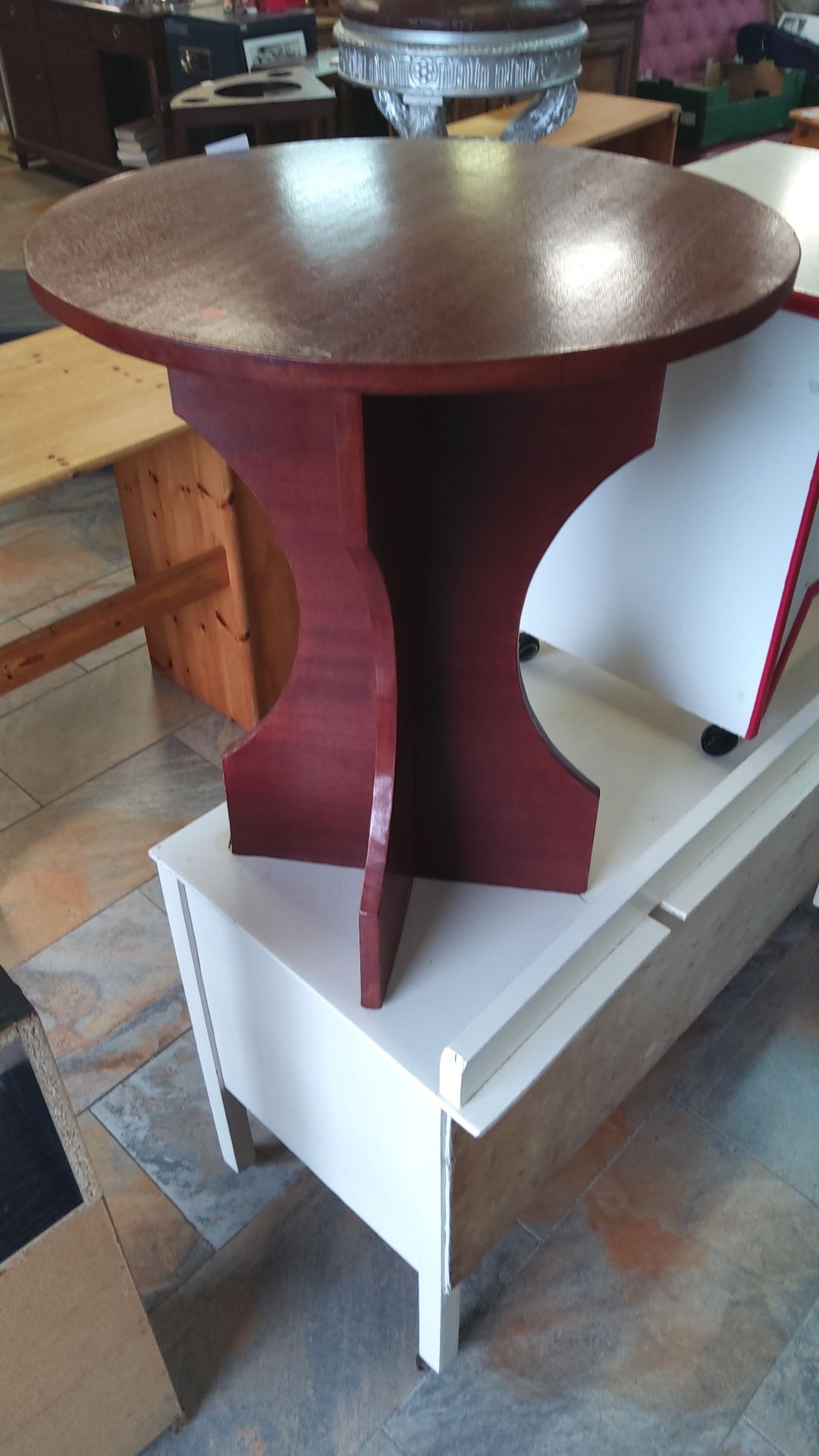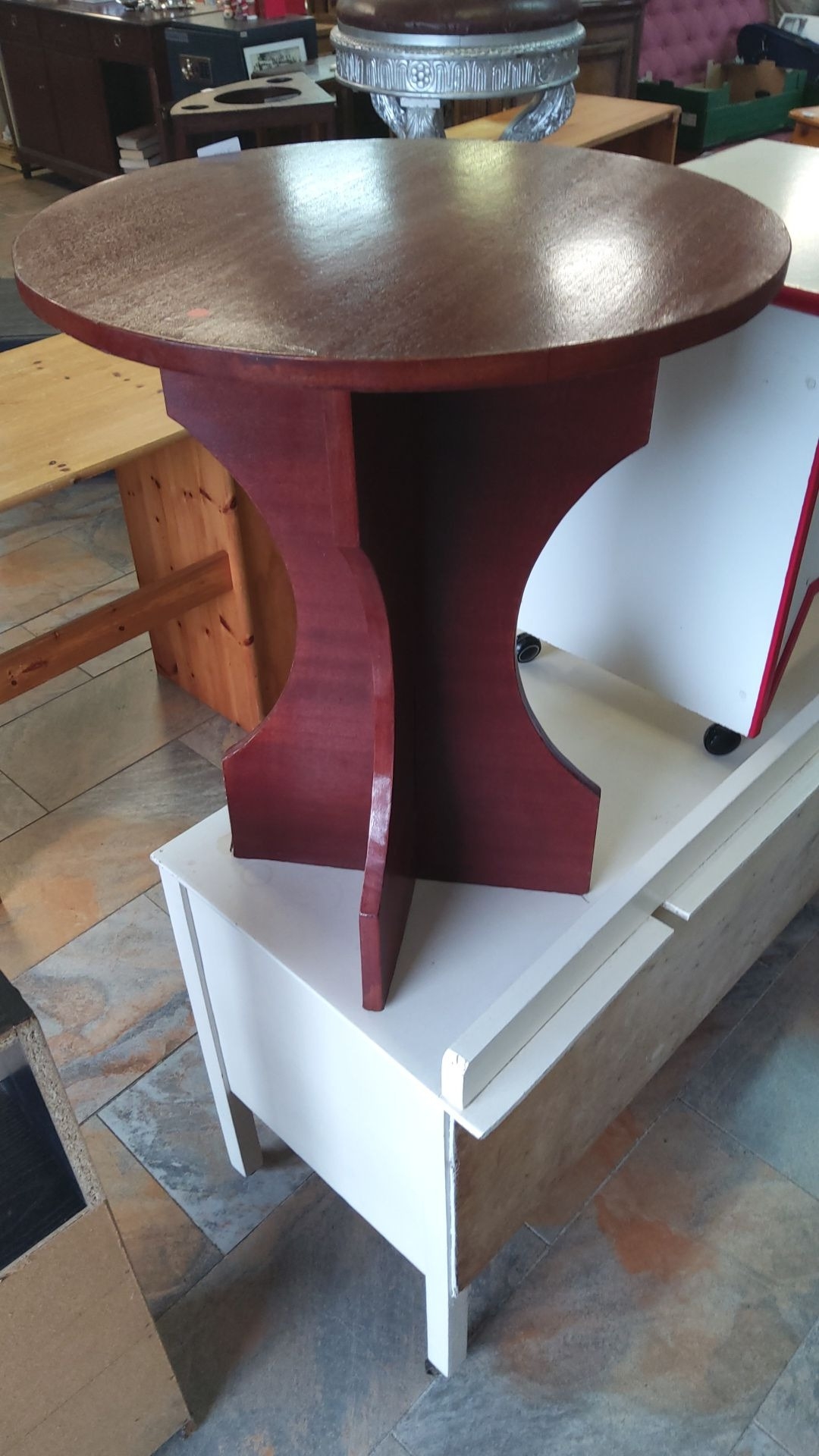 Round wooden side table with a sculptural base, featuring a dark mahogany finish.
