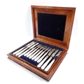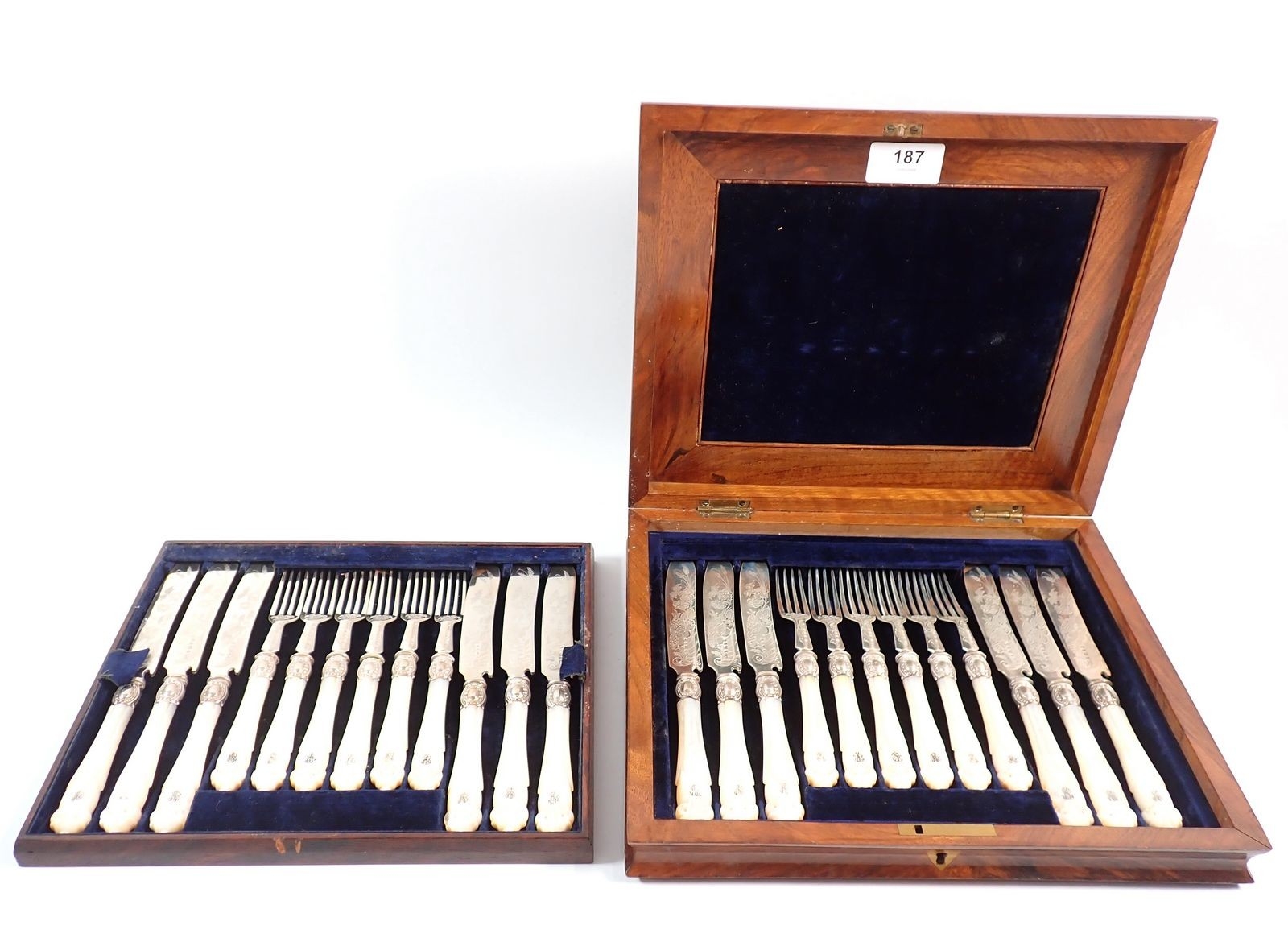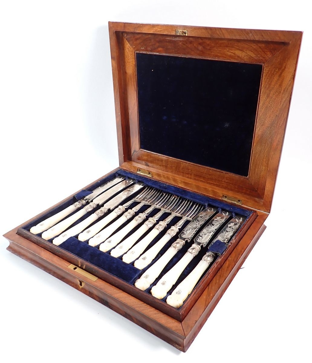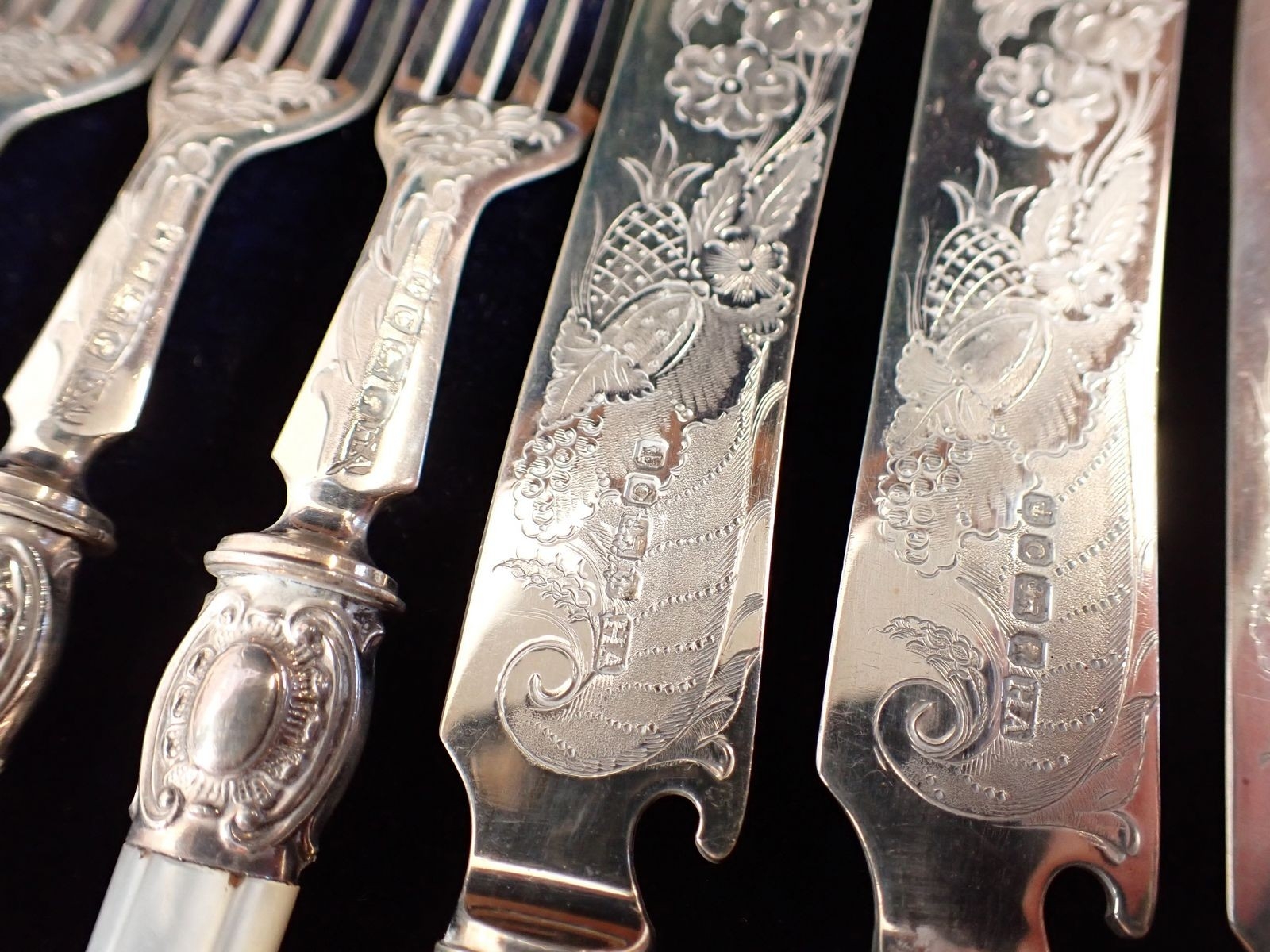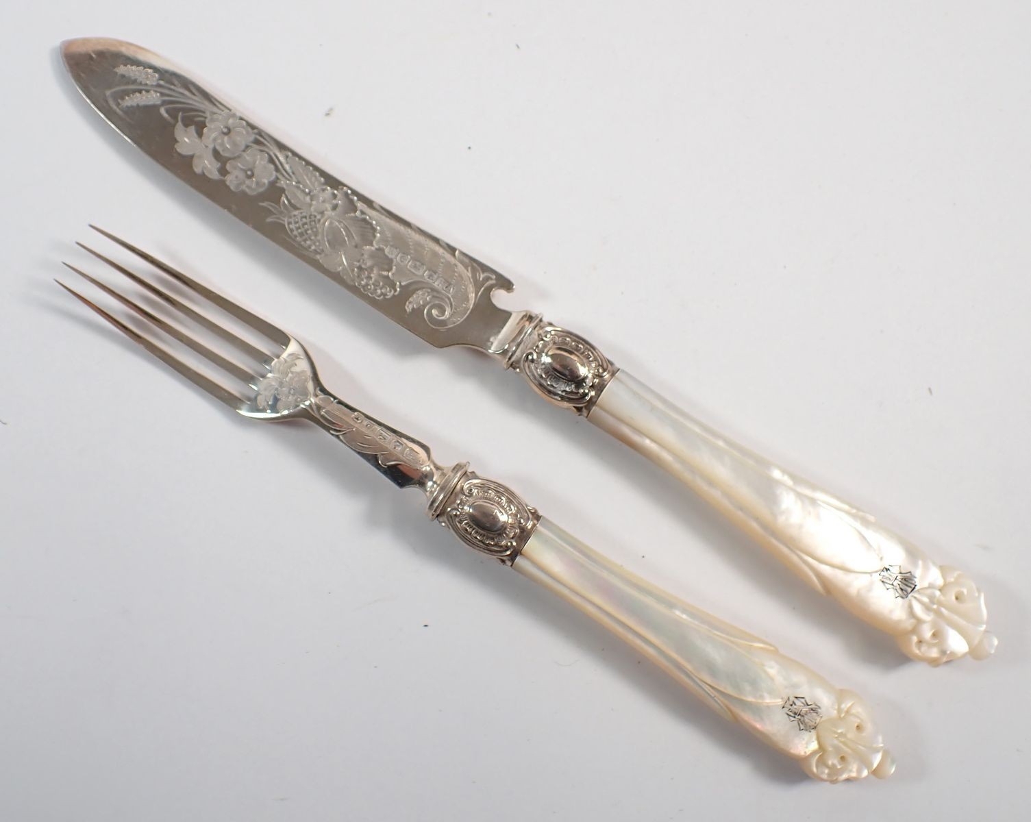 A Victorian silver and mother of pearl set of twelve fruit knives and forks with engraved decoration by Atkin Brothers, Sheffield 1870 in fitted walnut case