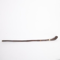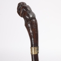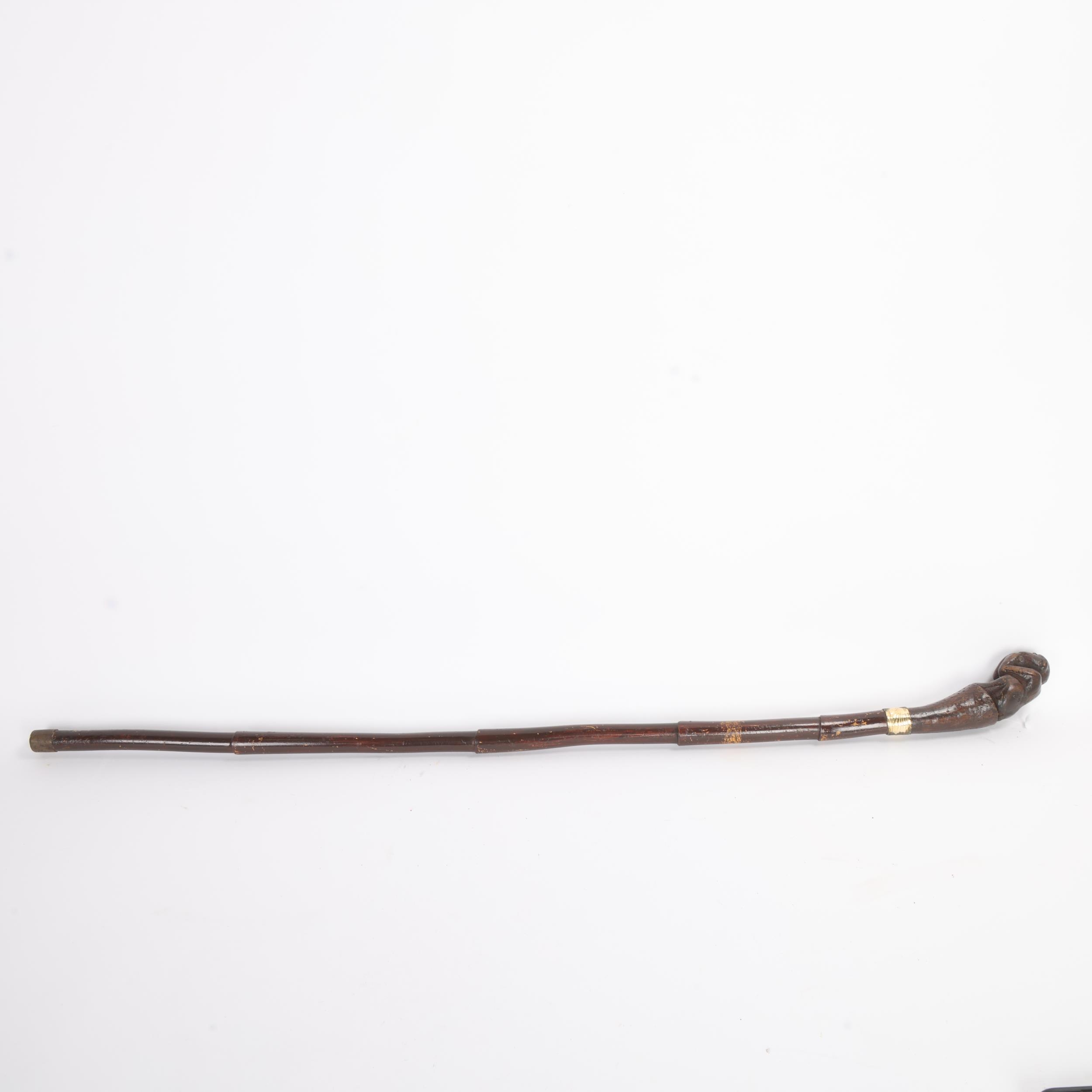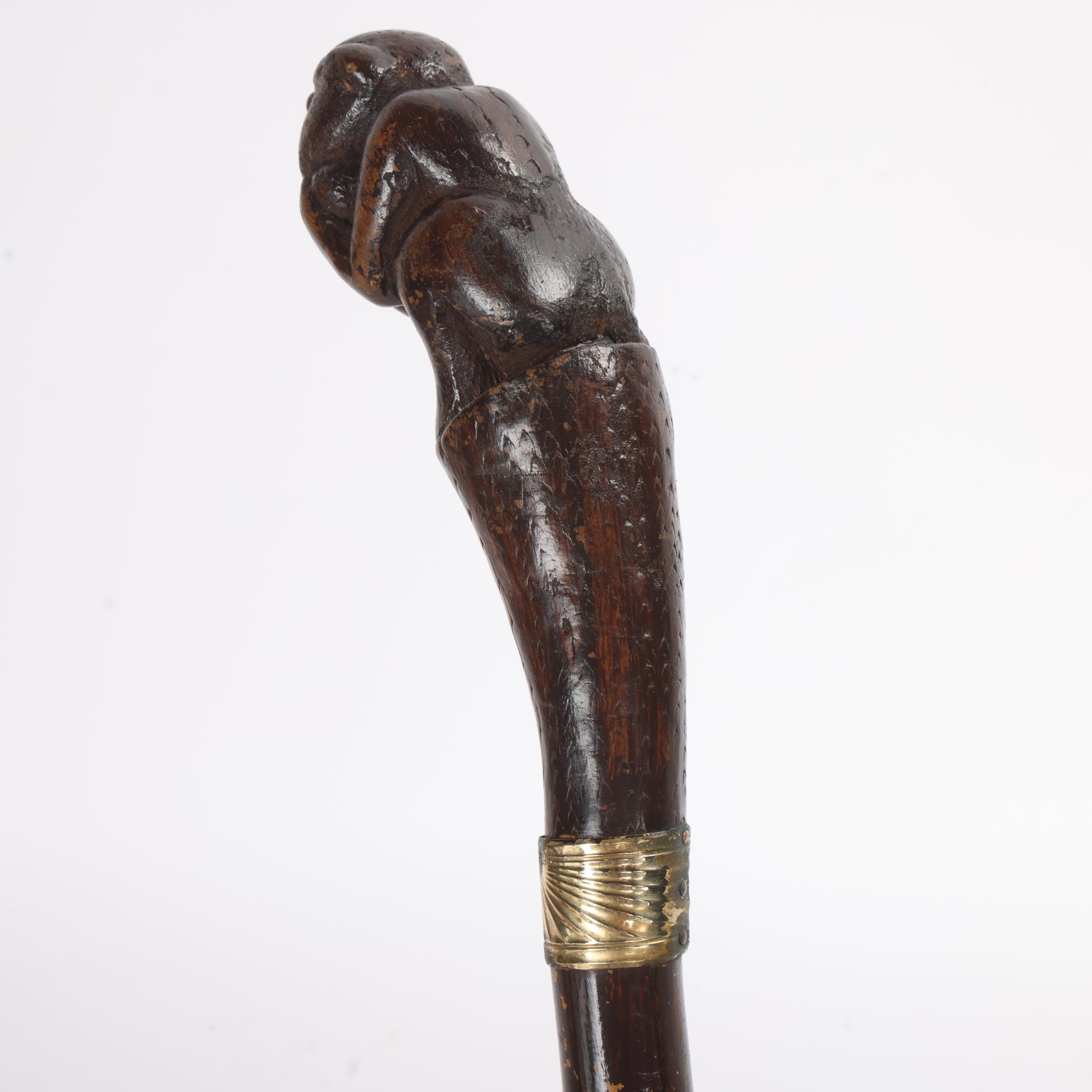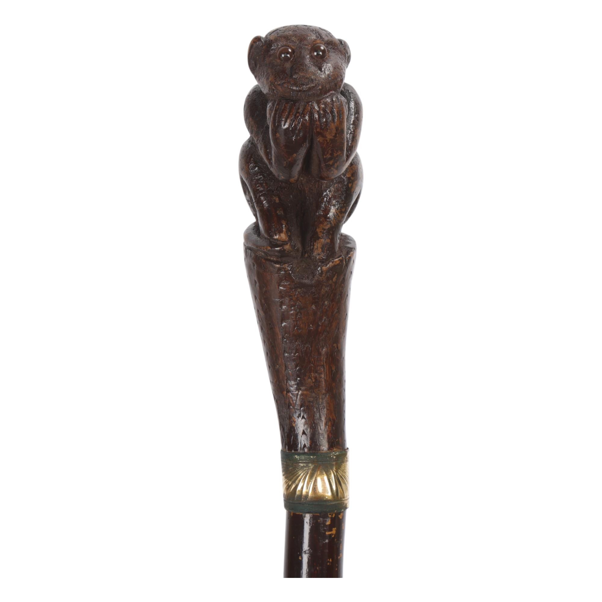 A Palm wood handle walking cane, carved as a full, seated monkey eating a fruit with both paws, with inset plastic eyes, metal collar and an unusual stepped malacca shaft painted brown, metal ferrule, circa 1880s, length 91cm