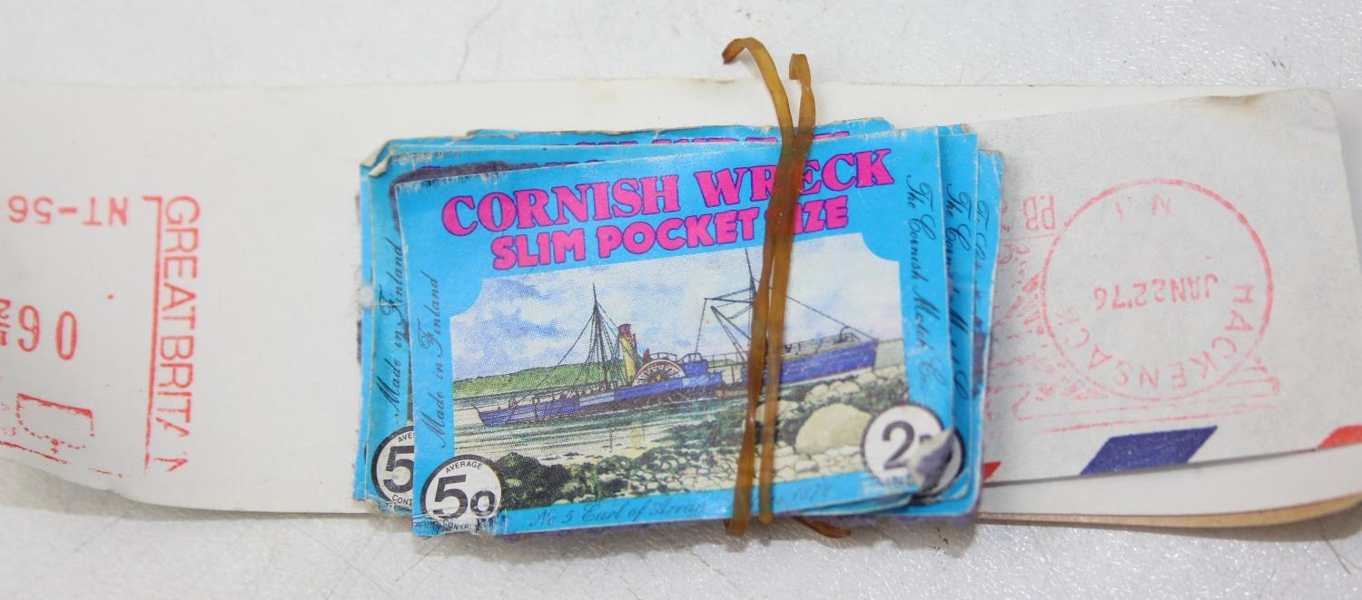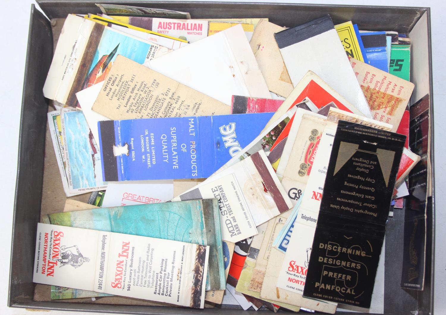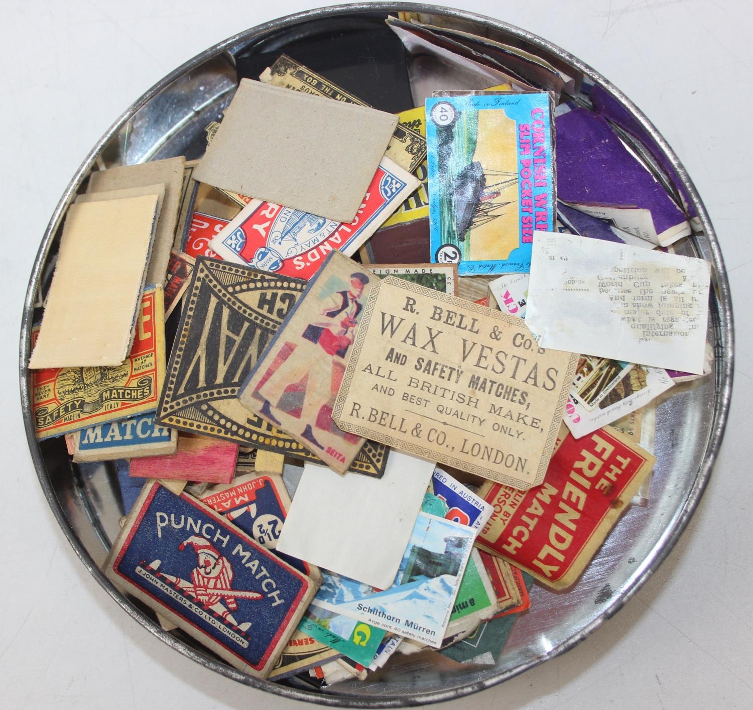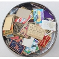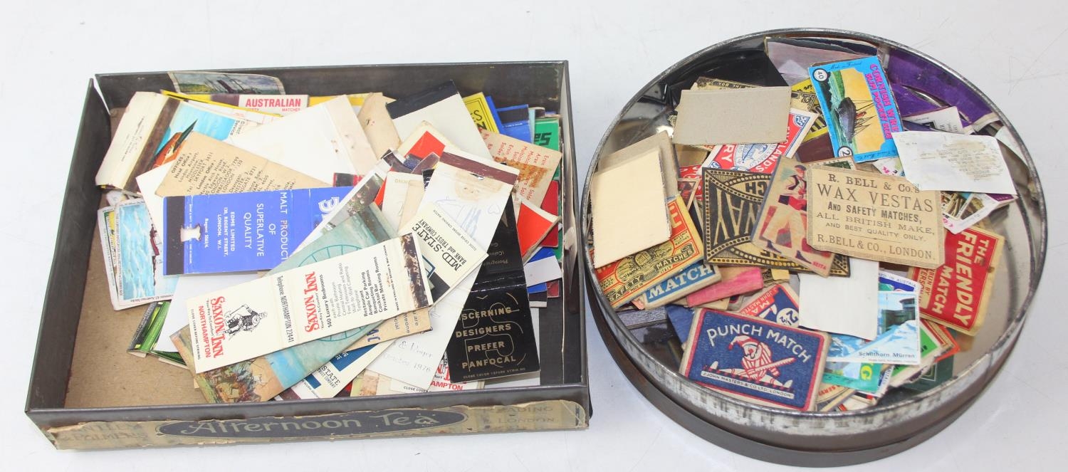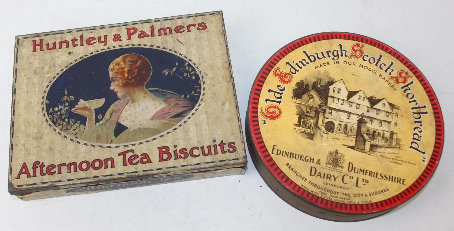Advertising - Phillumeny - two vintage tins containing antique and later matchbox advertising covers or labels, Huntley & Palmers Afternoon Tea Biscuits & Olde Edinburgh Scotch Shortbread tins [2]