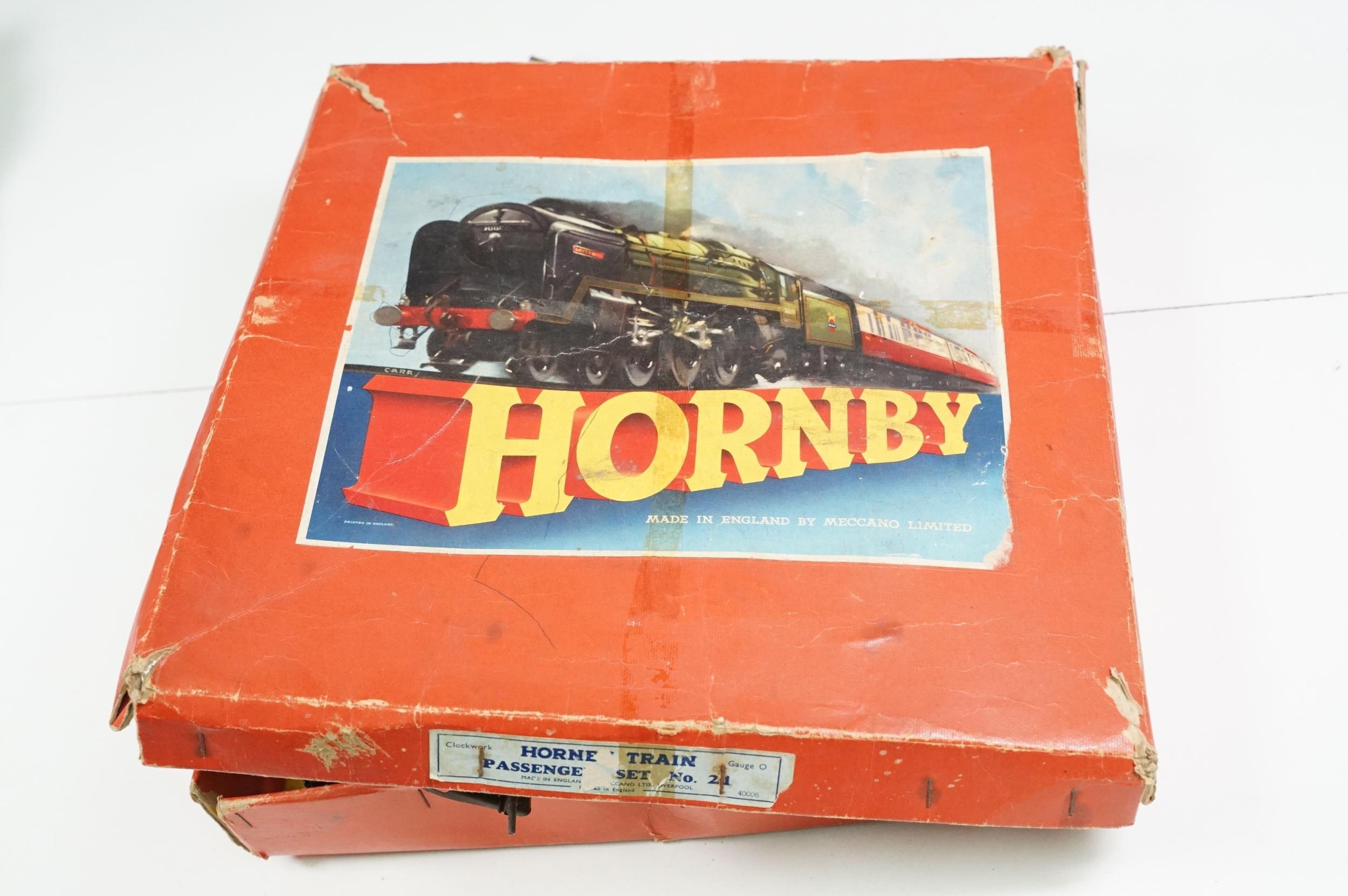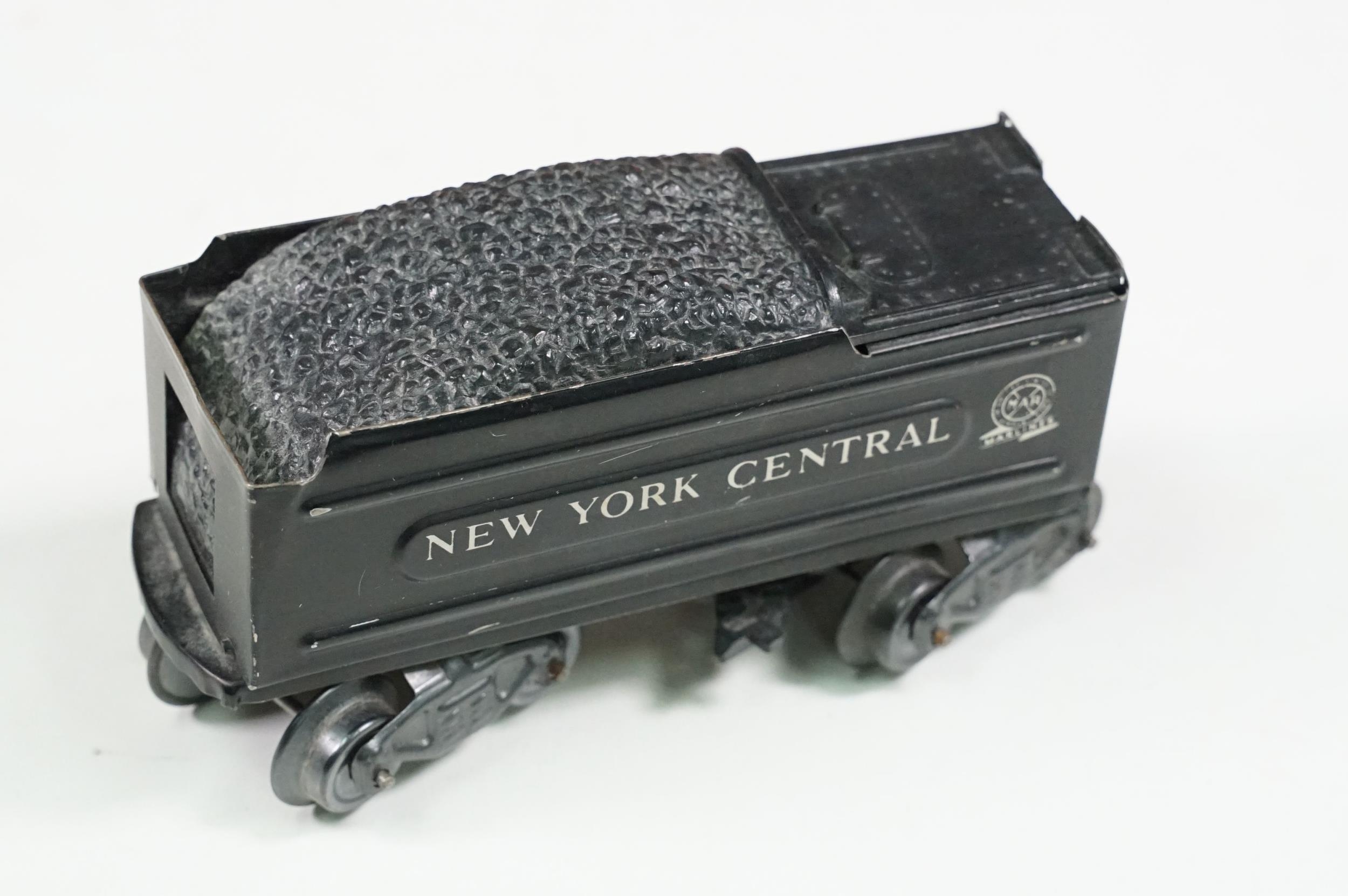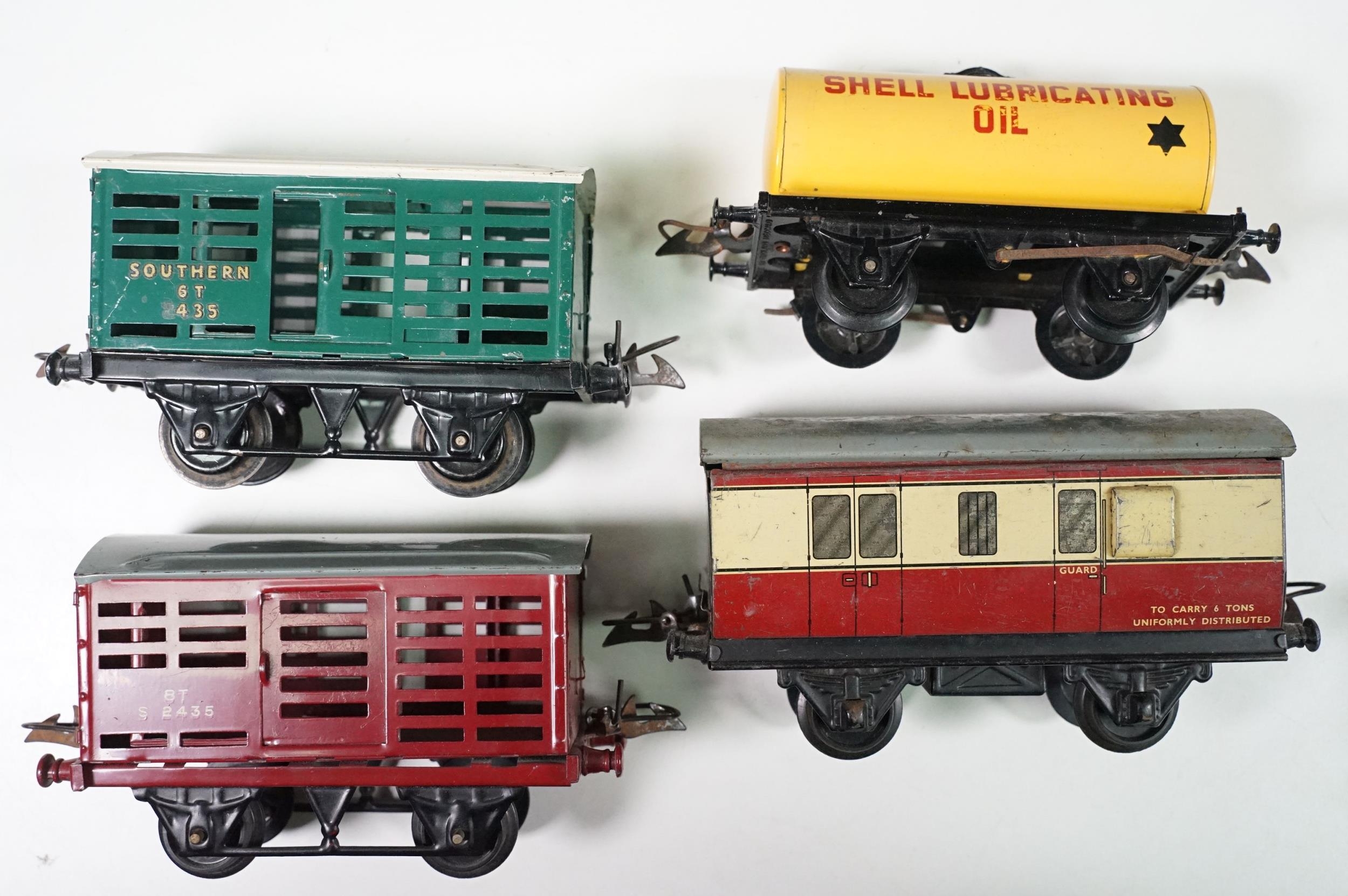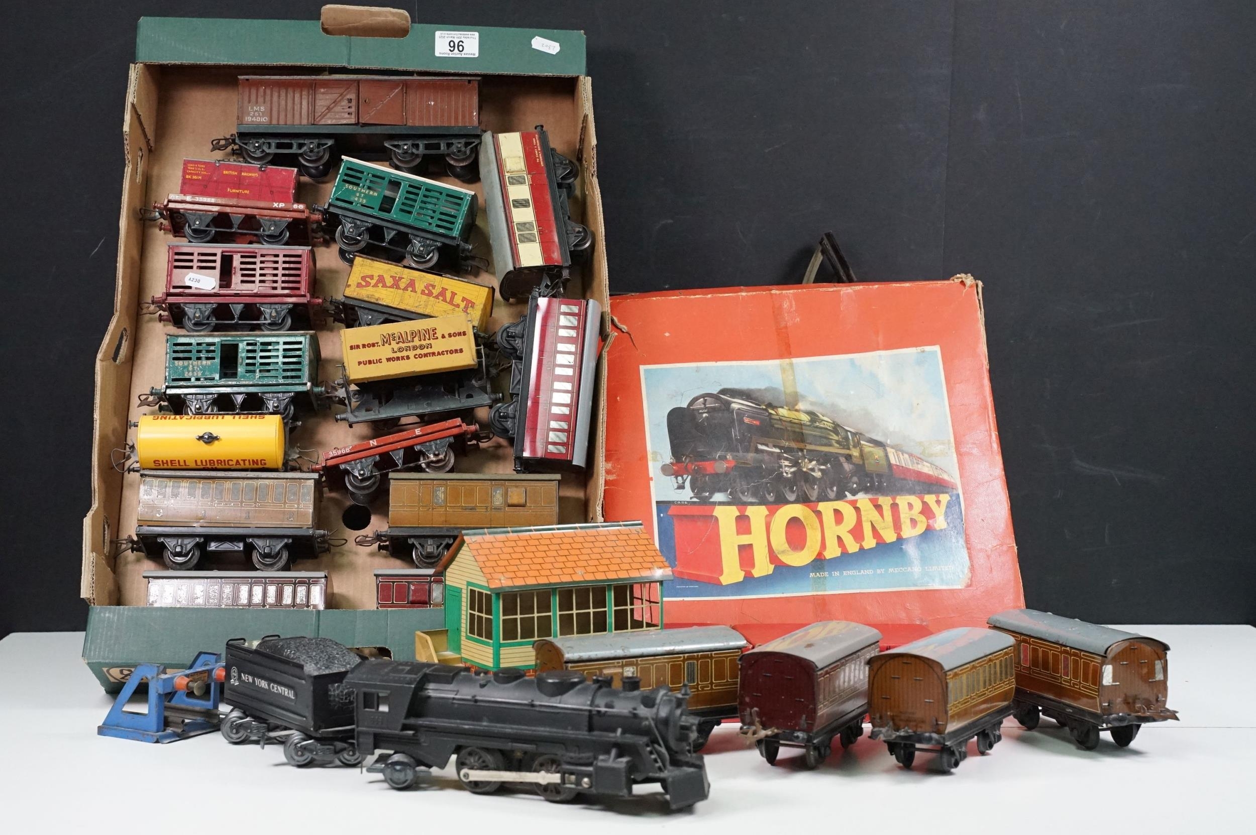 Collection of Hornby O gauge model railway to include 19 x items of rolling stock featuring Shell Lubricating Tanker, platform building, 3 x boxed No 1 Buffer Stop and a boxed Passenger Set No 21 with locomotive, coaches and track, plus a Marx O gauge New York Central 2-4-2 locomotive and tender (two boxes)
