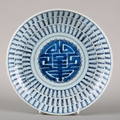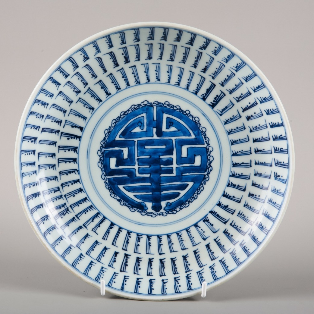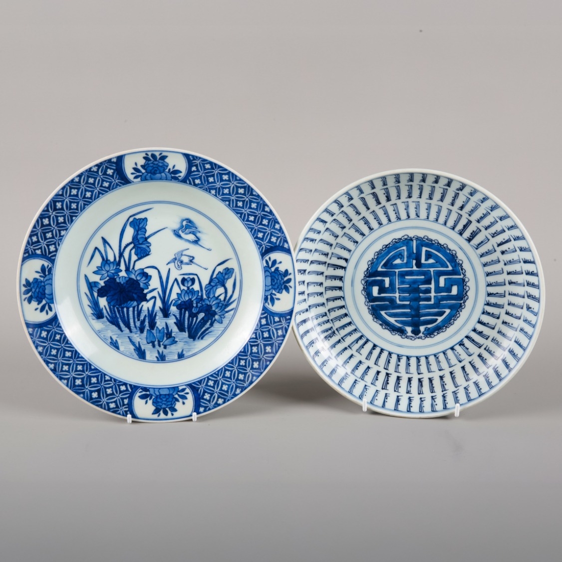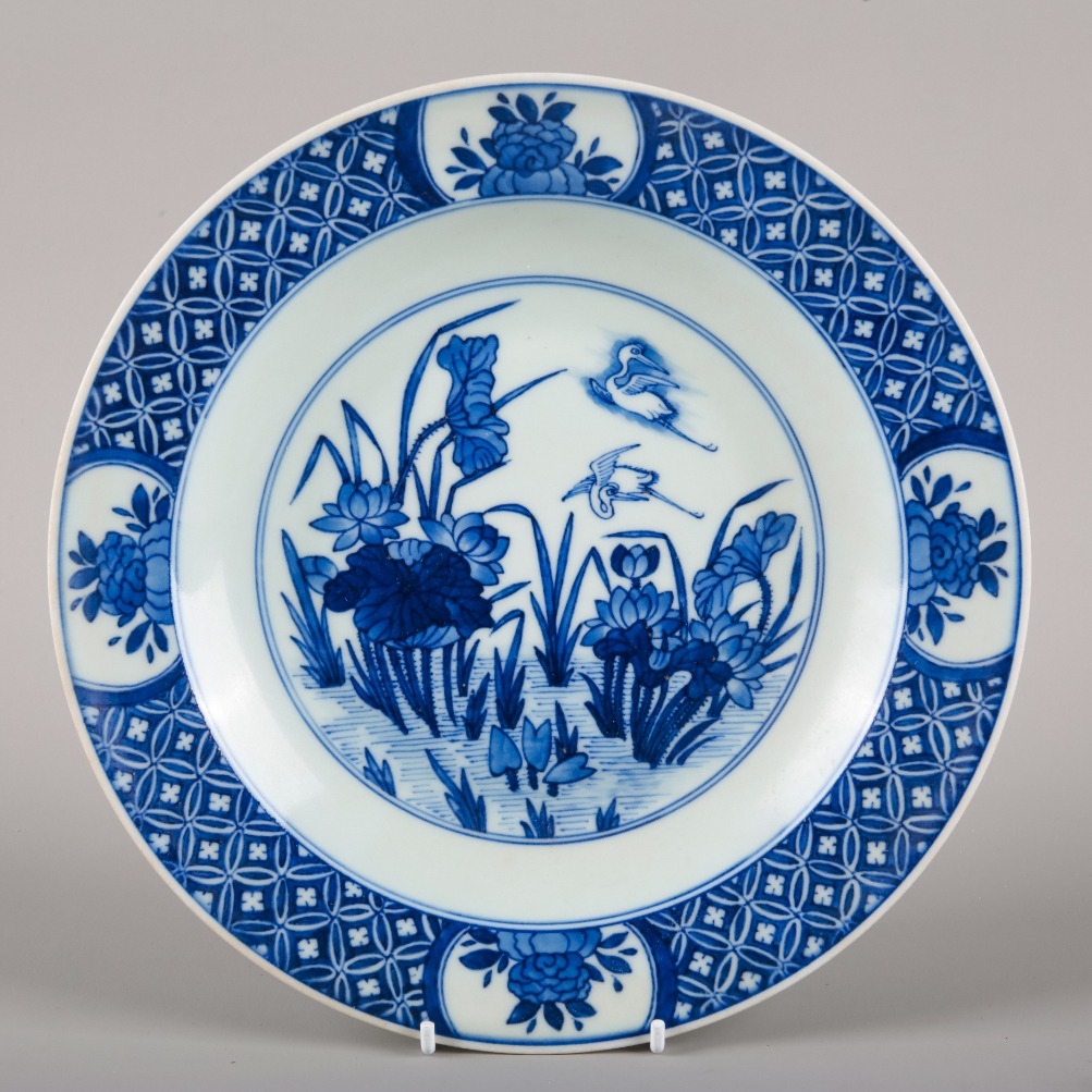 in Kangxi taste but later, bearing a leaf mark to the base, decorated with a river landscape with water plants and flying cranes, 24cm diameter; together with another similar blue and white plate, decorated with a shou symbol to the centre, 22cm diameter (2)