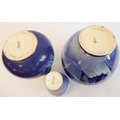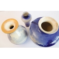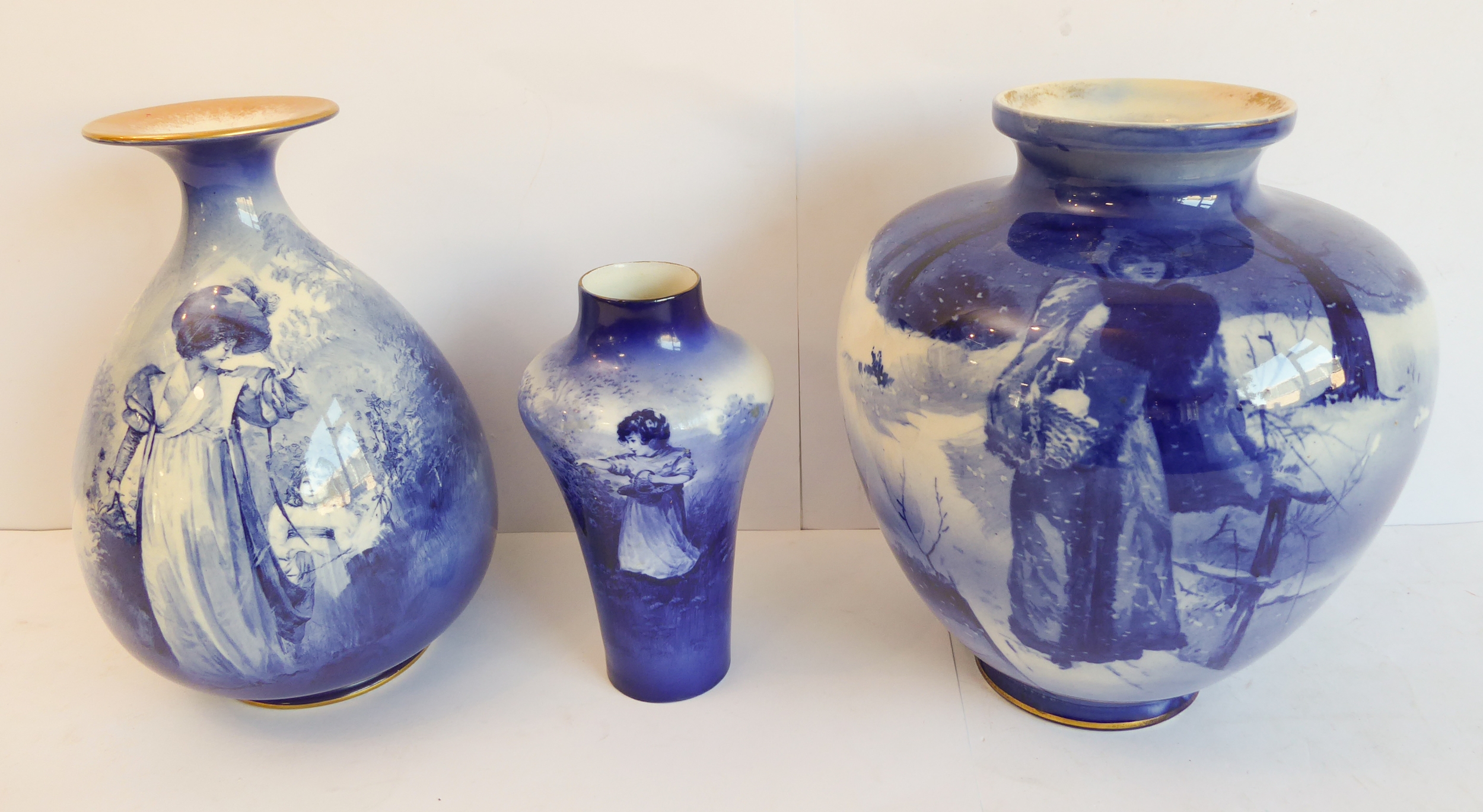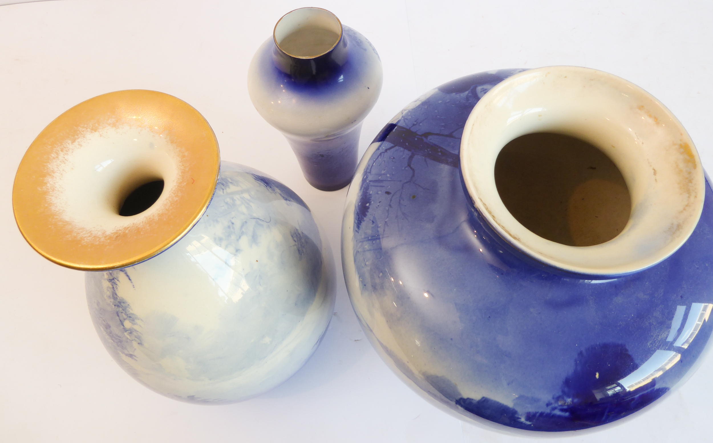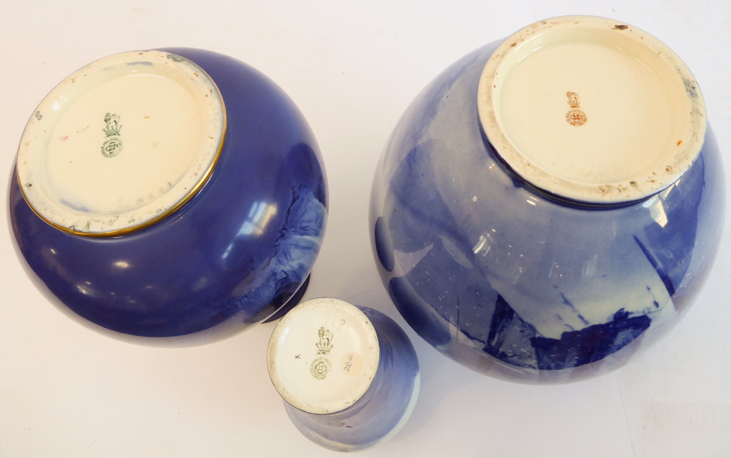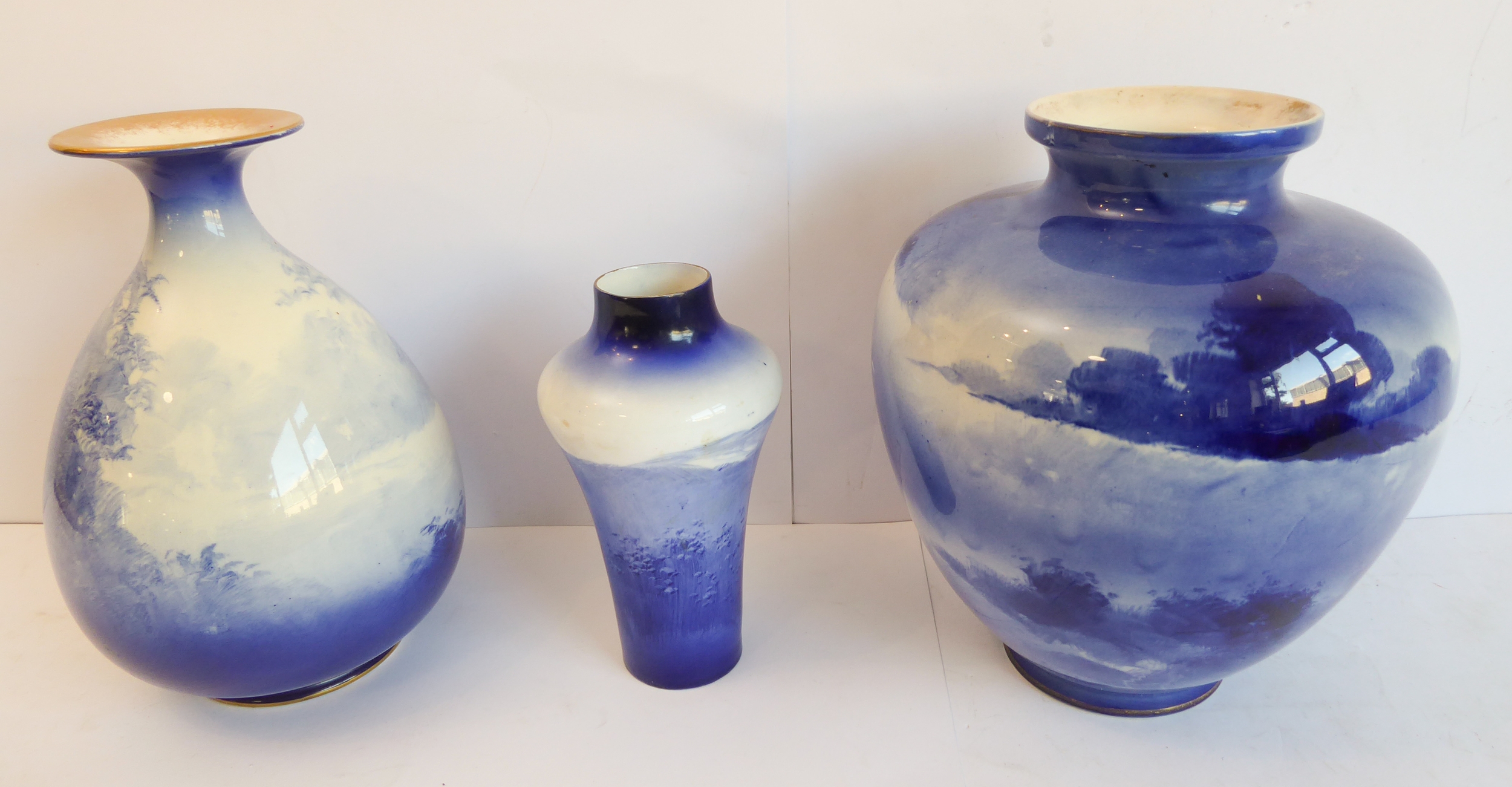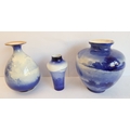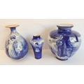 A Royal Doulton group of three late 19th and early 20th century blue and white vases, each with printed marks to their undersides: