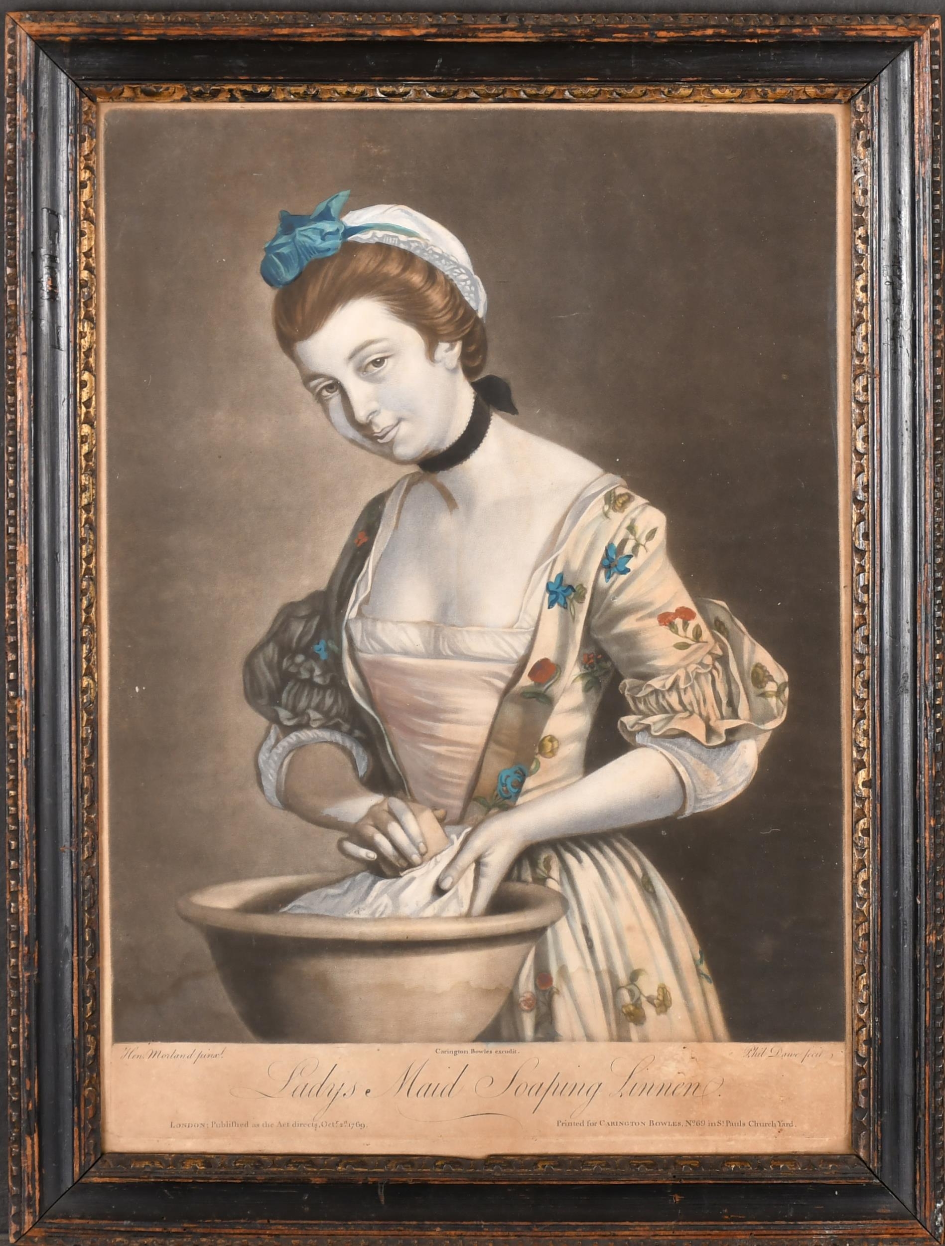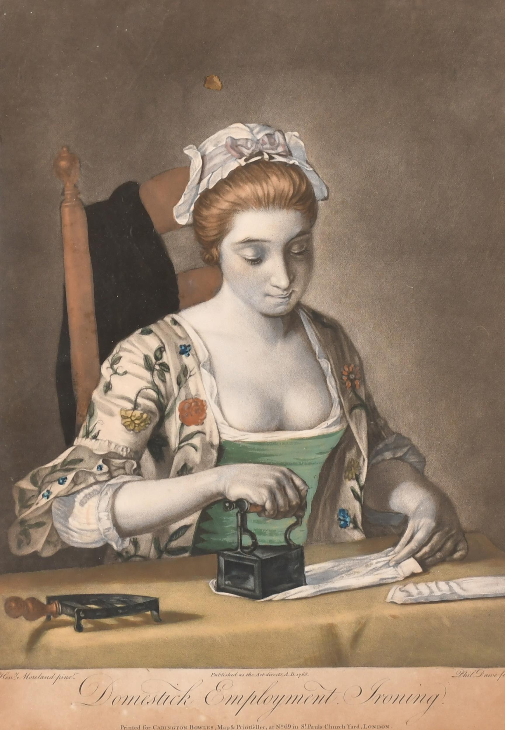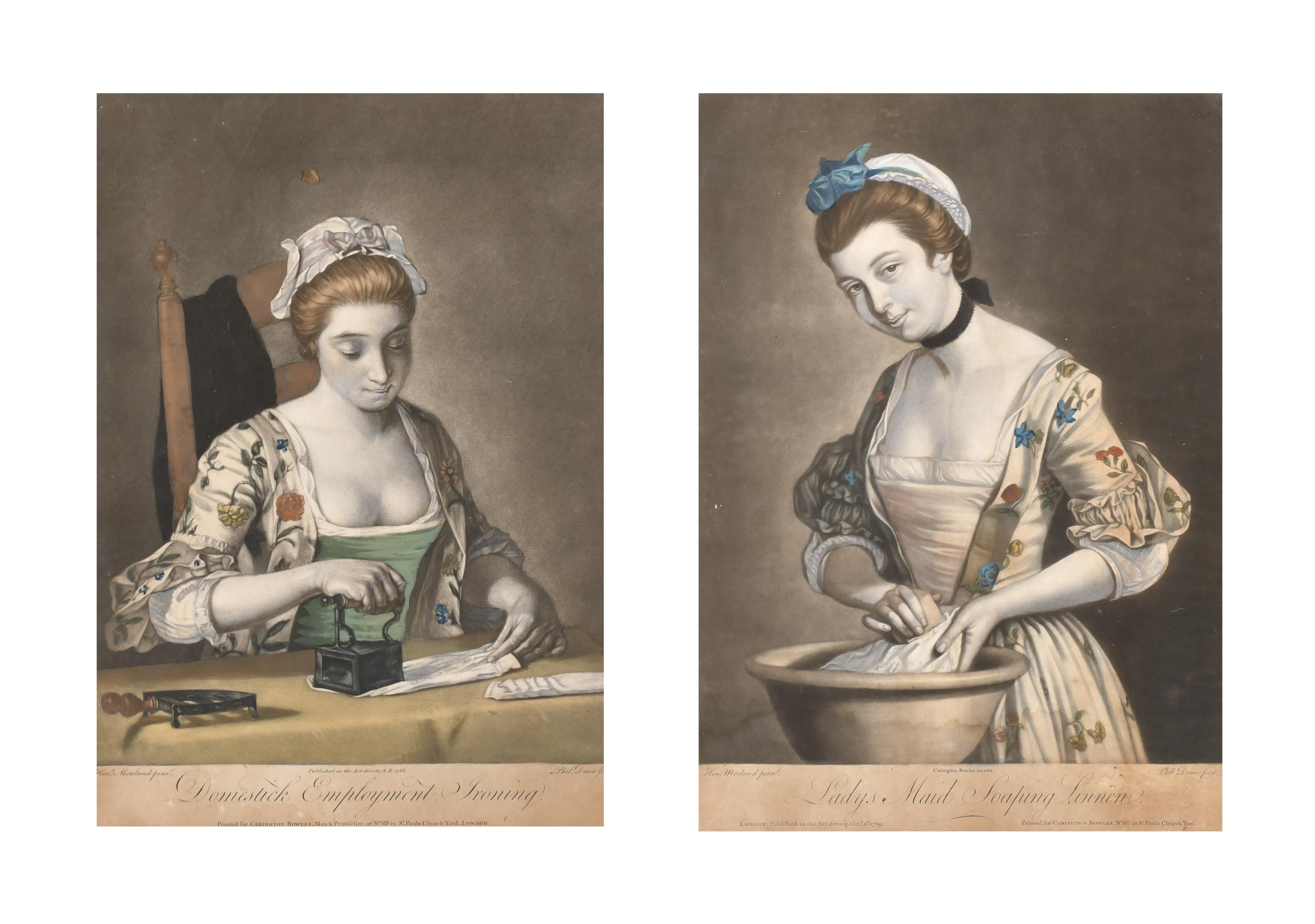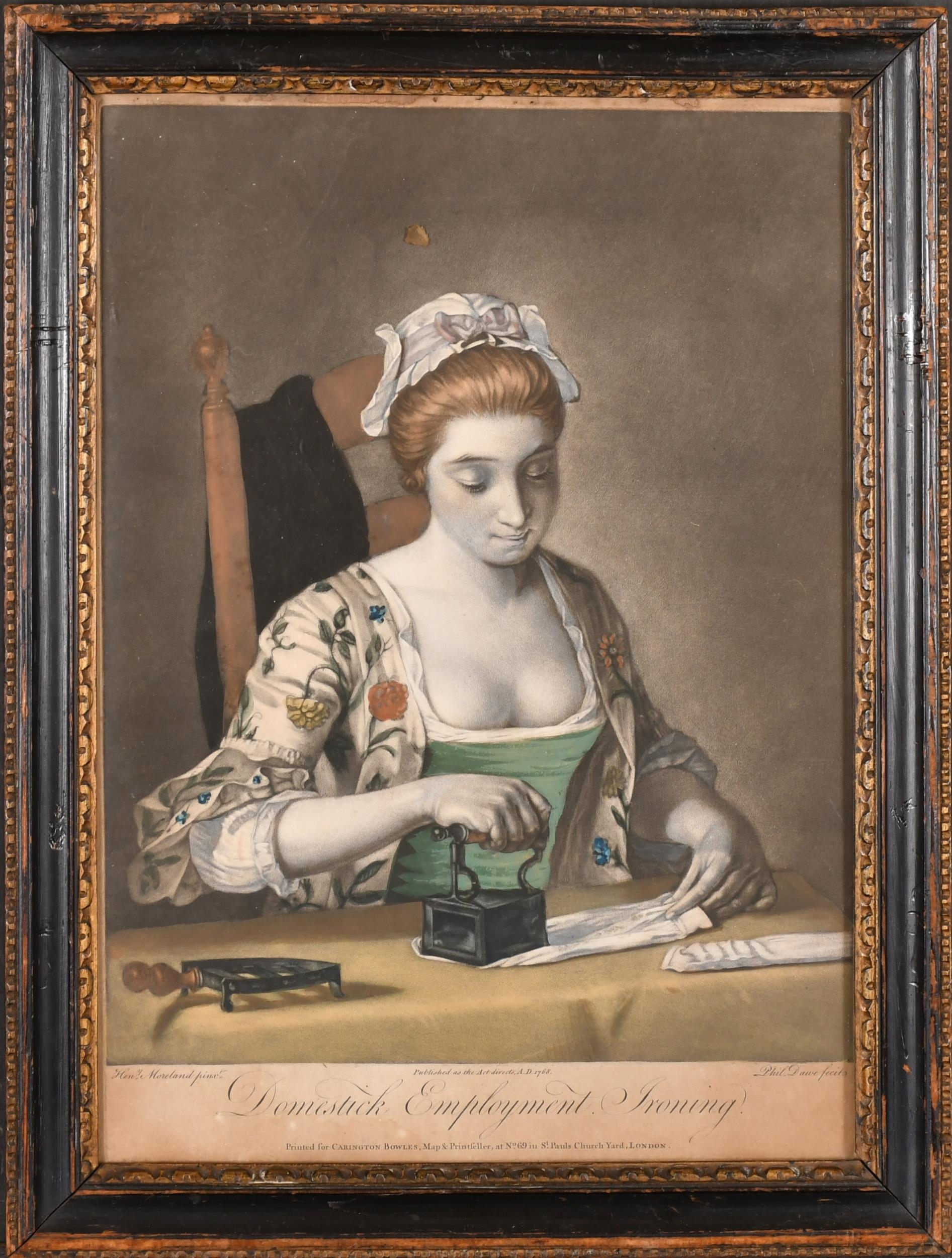 Henry Robert Morland (1716-1797) British. "Domestick Employment Ironing", Mezzotint by Philip Dawe, In a period frame, Overall 14.25" x 10.25" (36.2 x 26cm) and the companion piece "Lady's Maid Soaping Linnen", a pair (2)