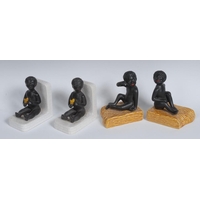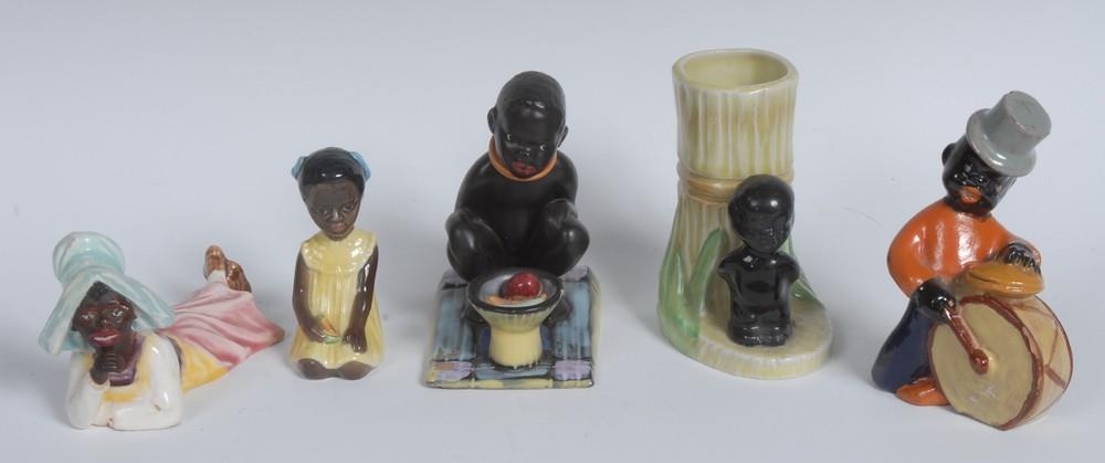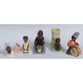 An Art Deco German porcelain figure, modelled as a young black boy, crouched beside a bowl of fruit, brightly glazed in gloss and matt, 9.5cm wide, model no. 1585, printed mark Made In Western Germany, c. 1950; a Weetman Giftware novelty spill vase, as a black infant, beside a bamboo shoot, 11.5cm high, printed mark; a French terracotta model, of a stylized boy, with drum and cymbal, 12.5cm high, indistinct impressed signature, c. 1930; others (5)