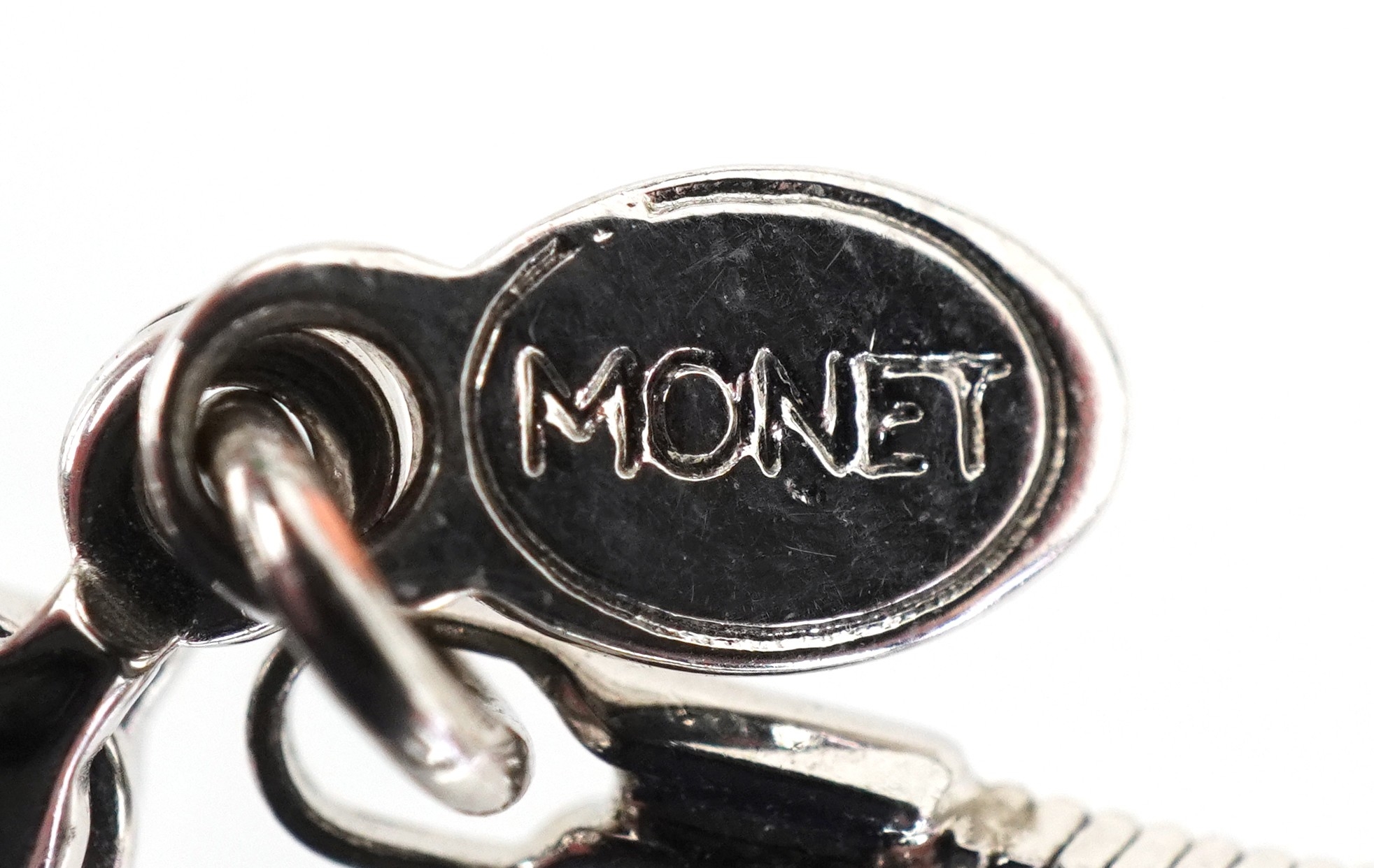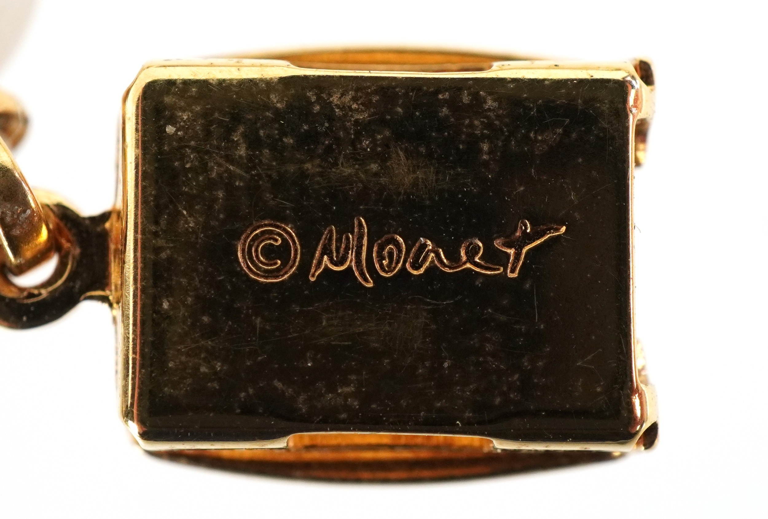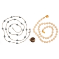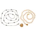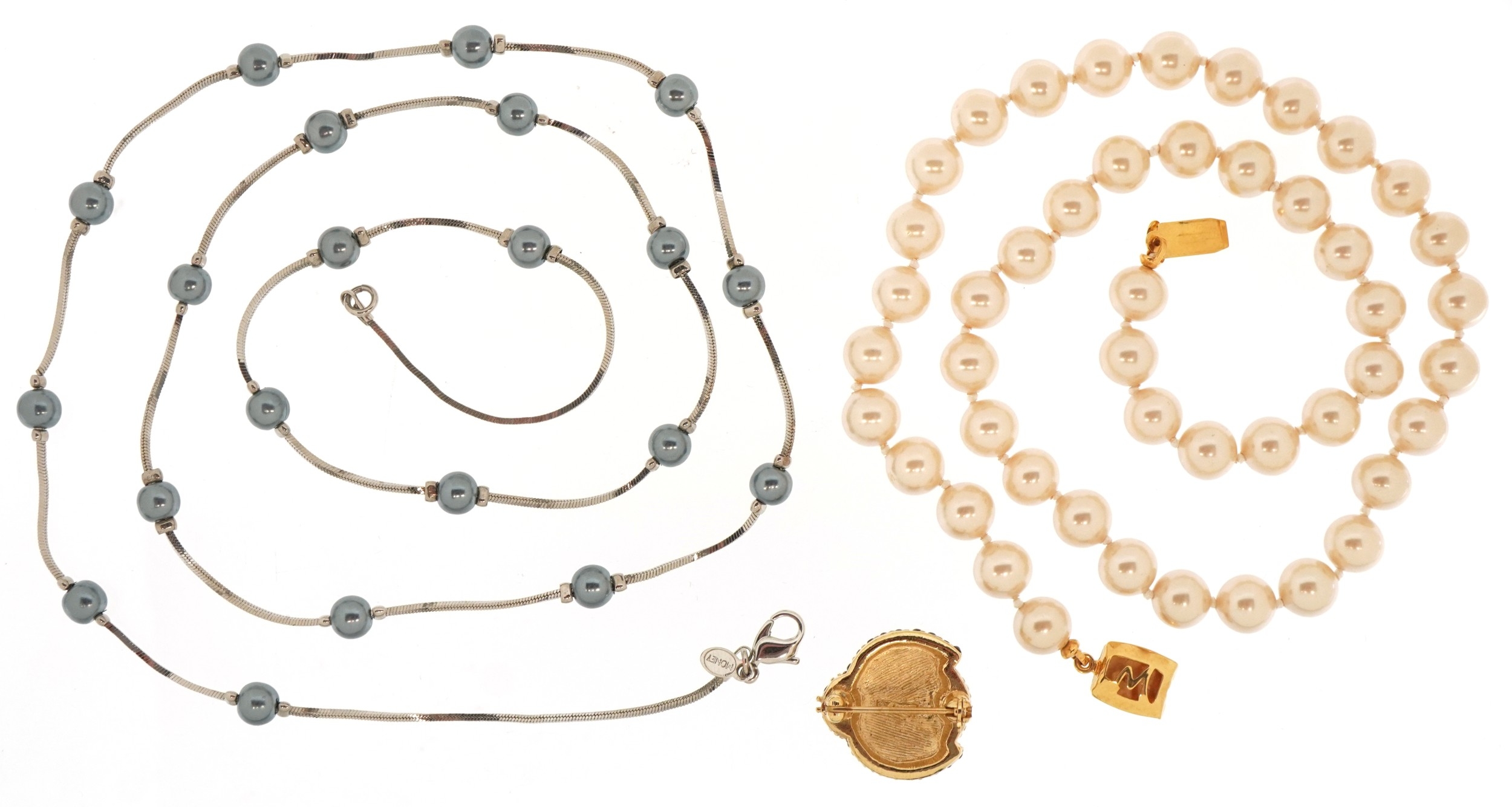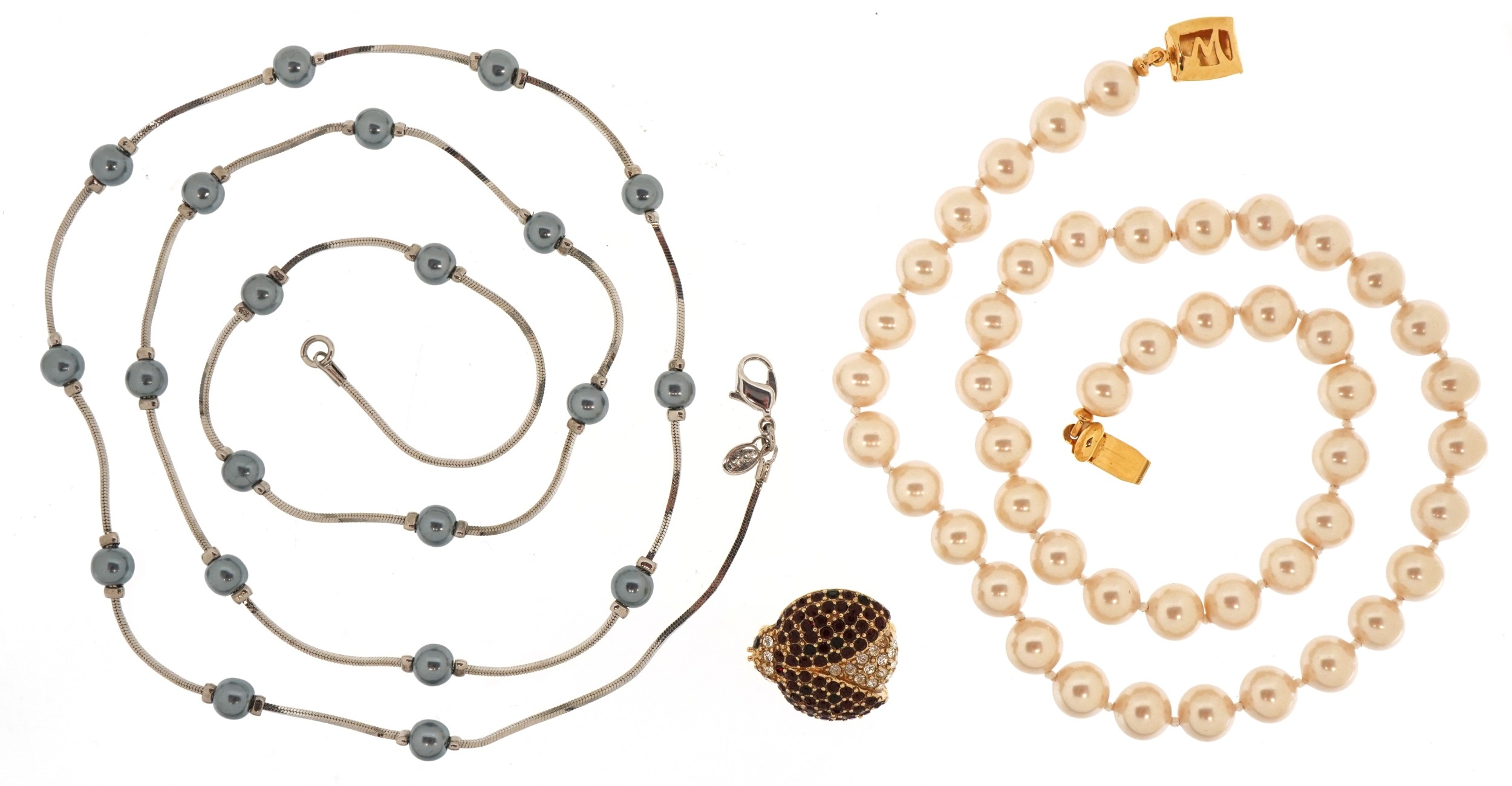 Vintage Monet designer jewellery comprising two simulated pearl necklaces and a ladybird brooch, the largest 74cm in length, total 60.3g.