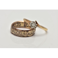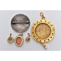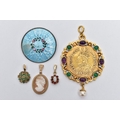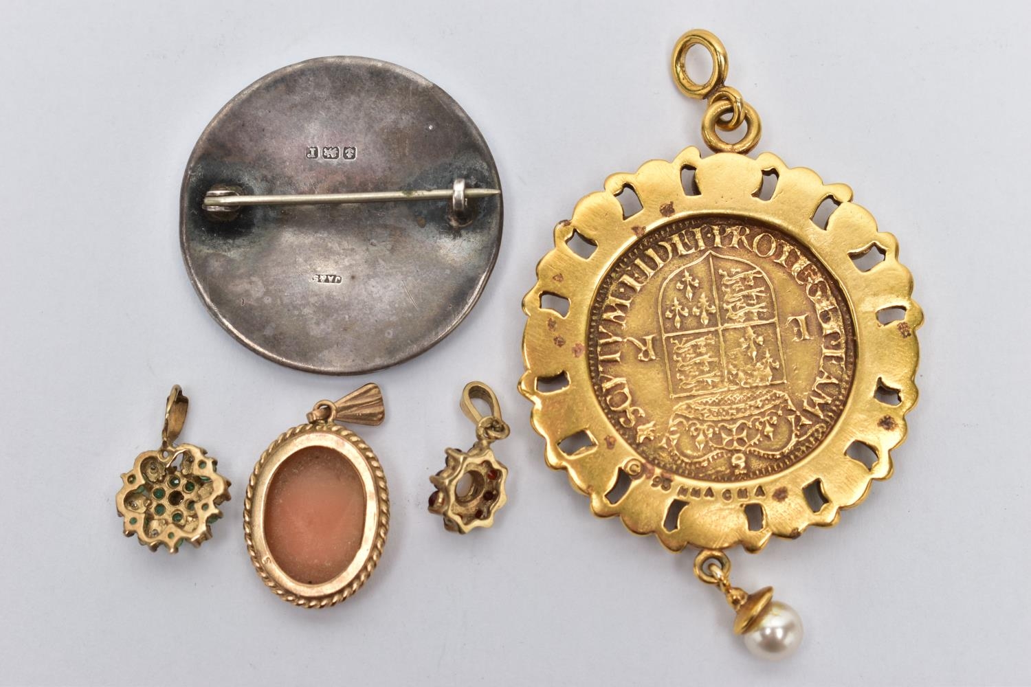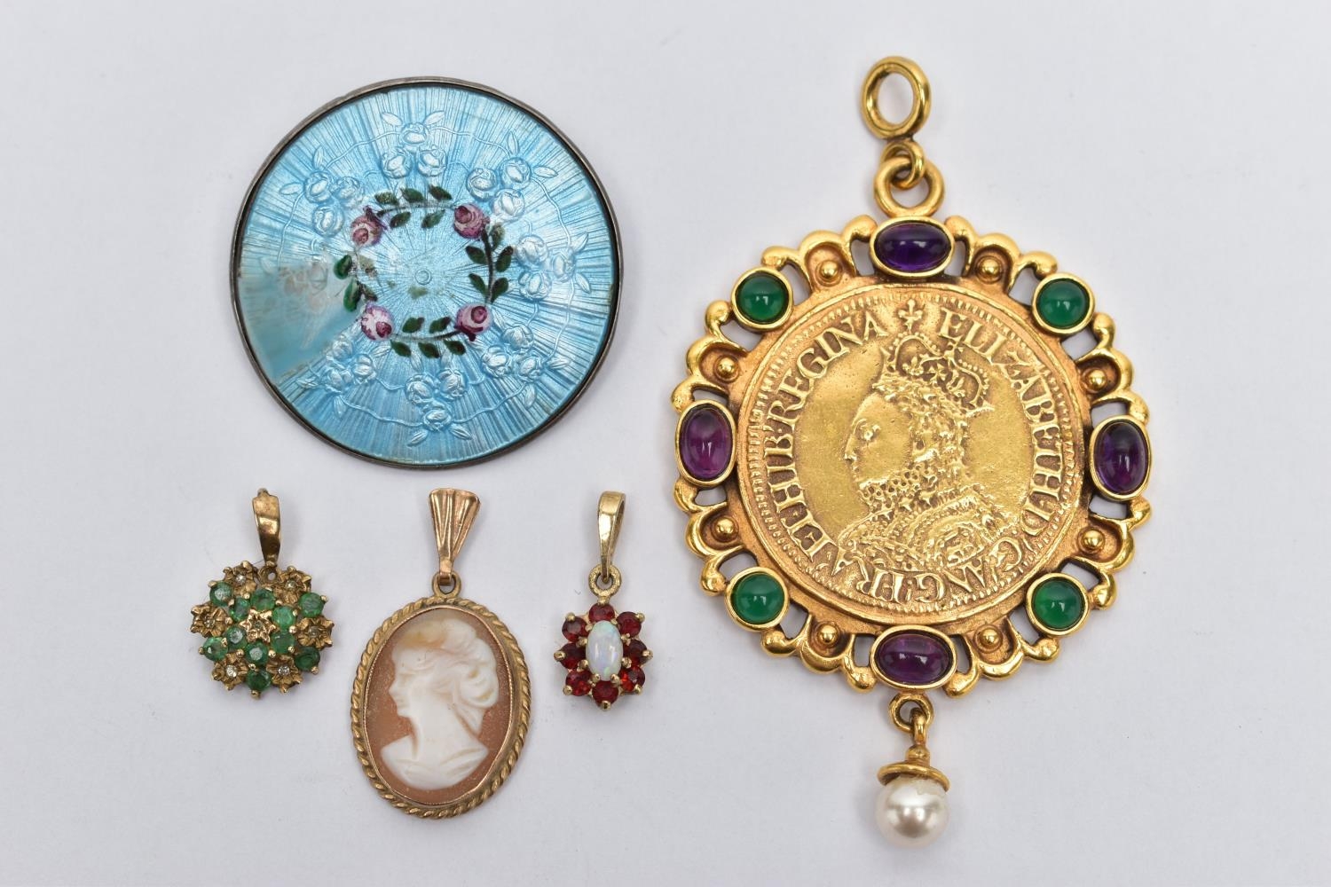A SMALL BOX OF ITEMS, a small tan coloured box measuring approximately 9.5cm x 5.5cm x 3.5cm, with contents to include a small 9ct gold cameo pendant depicting a lady in profile hallmarked 9ct Birmingham fitted with a tapered bail, an emerald and diamond cluster pendant fitted with a tapered bail, hallmarked 9ct Birmingham, a small opal and garnet cluster hallmarked 9ct Birmingham, approximate gross weight 4.1 grams, together with a yellow metal costume coin pendant set with purple and green paste cabochons and suspending a single imitation pearl, and a silver guilloche enamel brooch hallmarked Birmingham