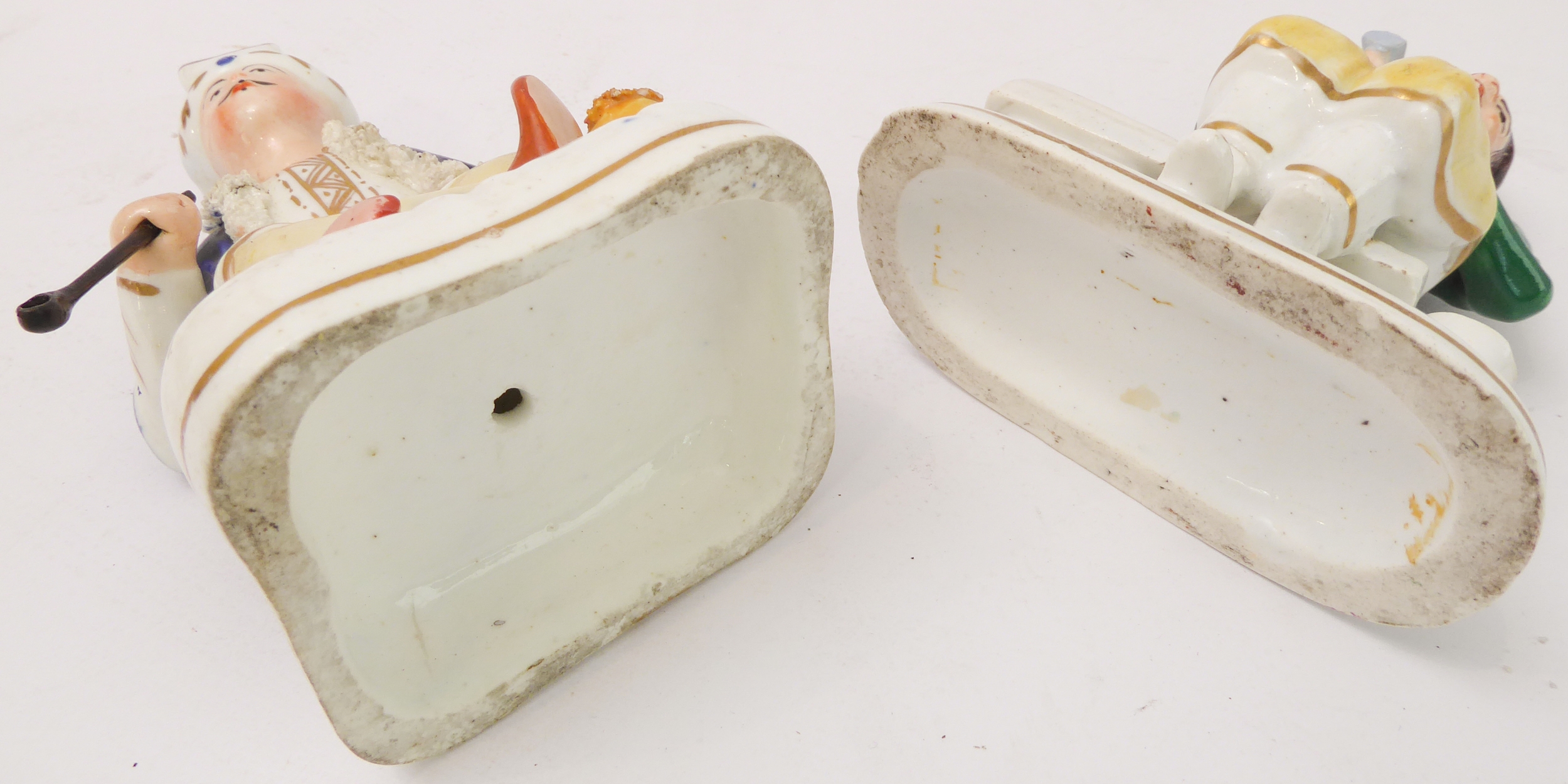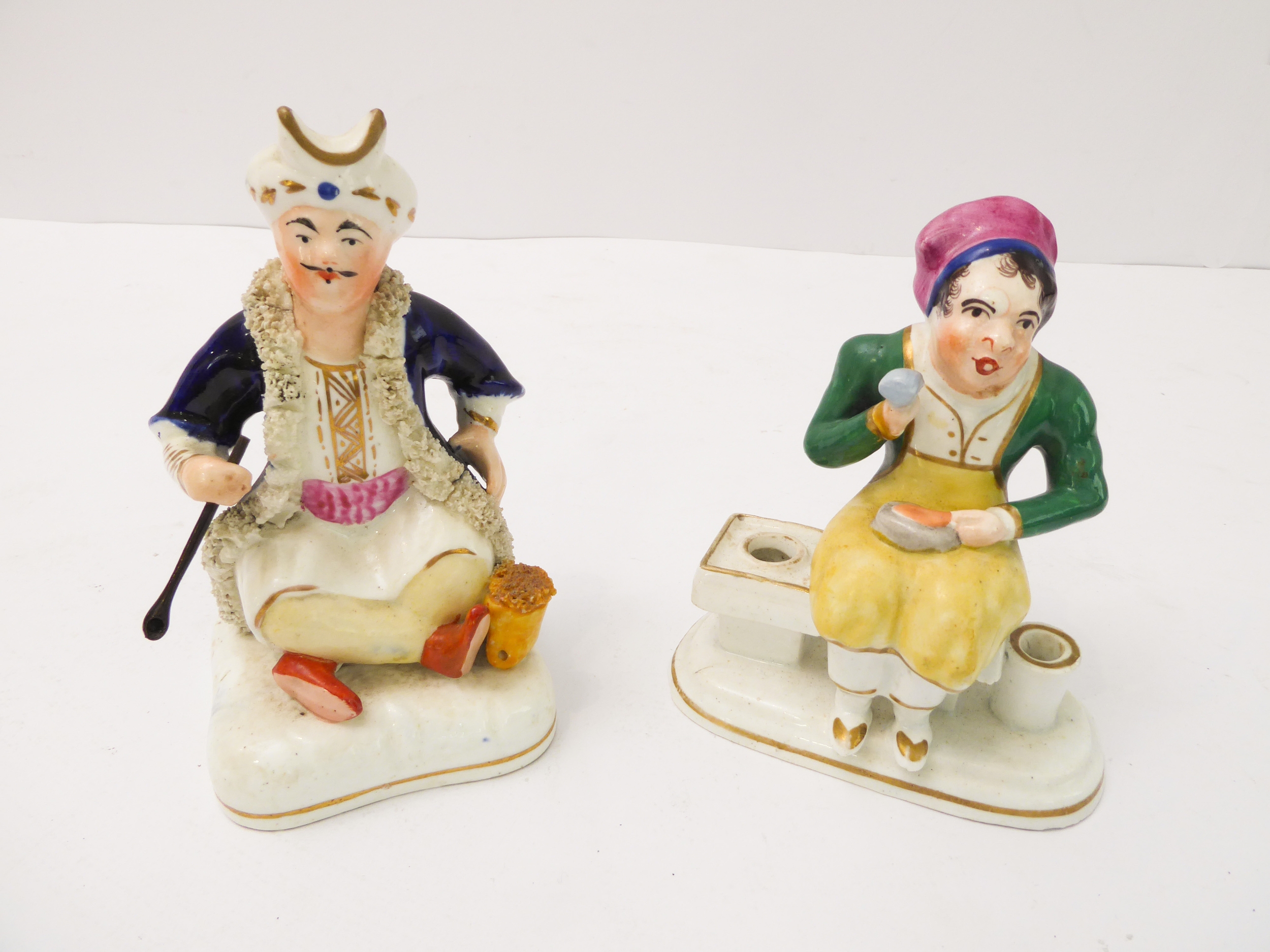 Two similar 19th century Staffordshire figures: a Moorish-style figure seated with pipe (12.5 cm high) and a jovial faced figure eating and drinking (as a ink stand) (2)