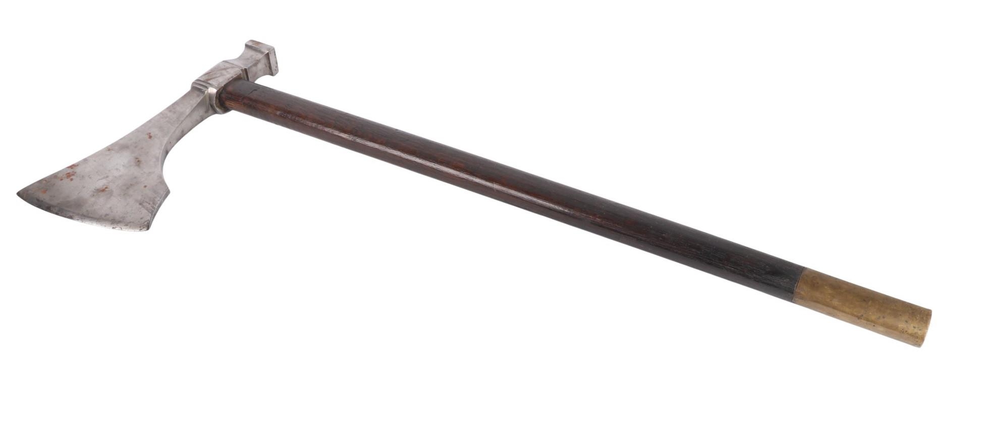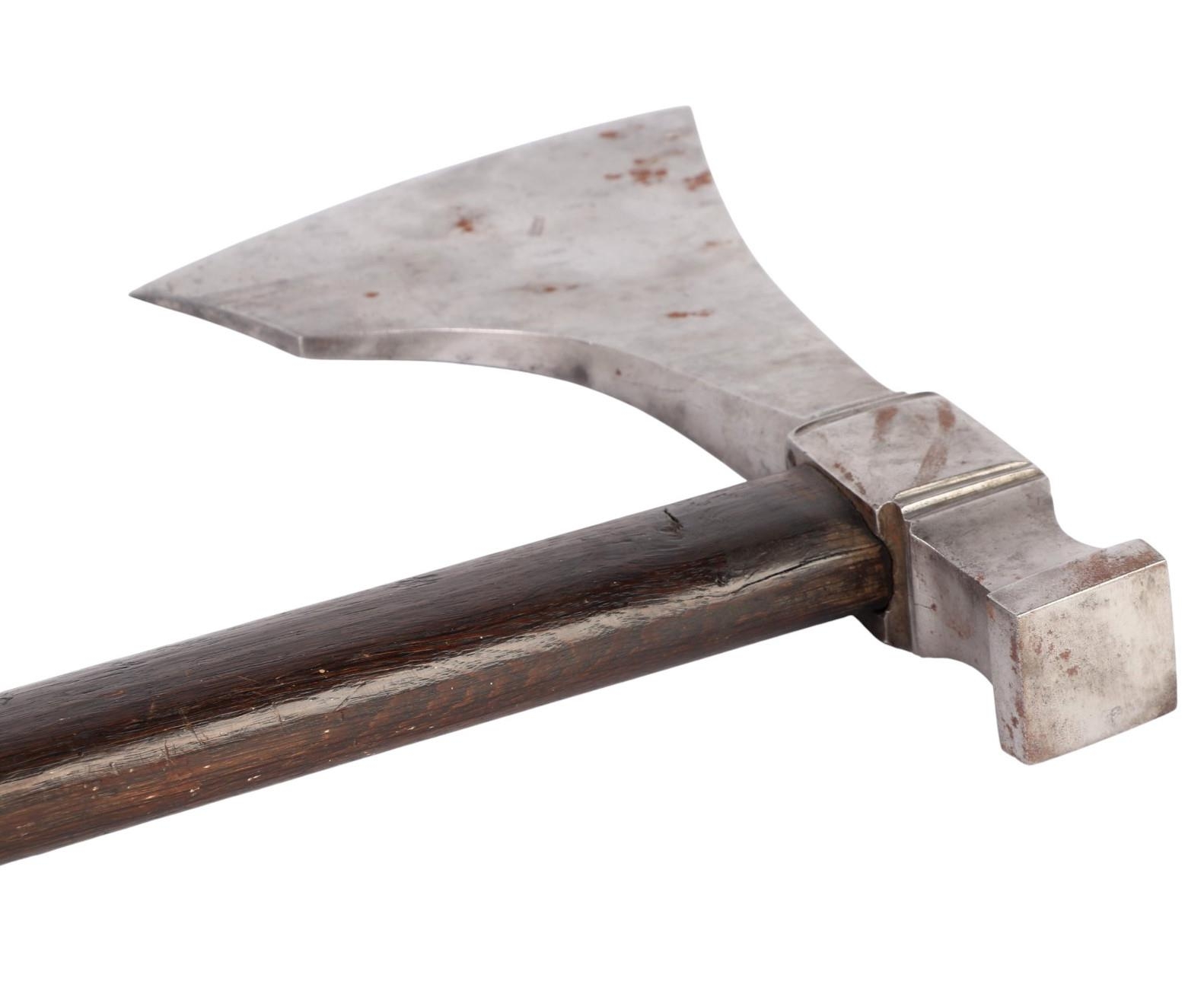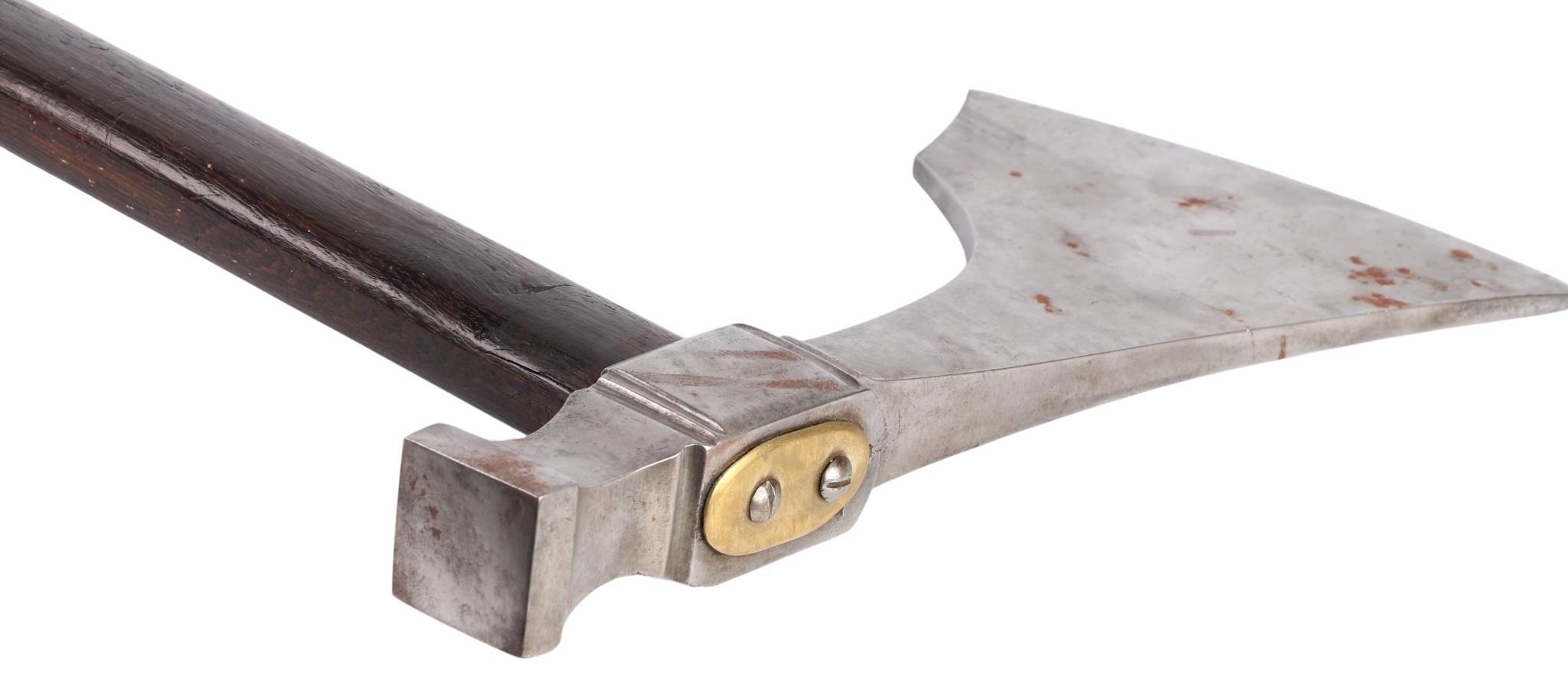 An early 19th century Napoleonic 1st Empire Sappers axe. Having a 18.5cms forged steel cutting blade to the front and a hammer at the back, locked with a brass plate and two screws to a blacked wooden handle. Overall length 86cms.