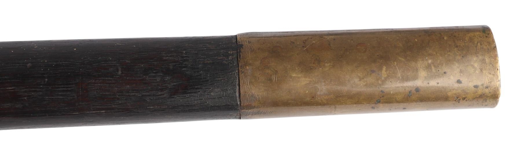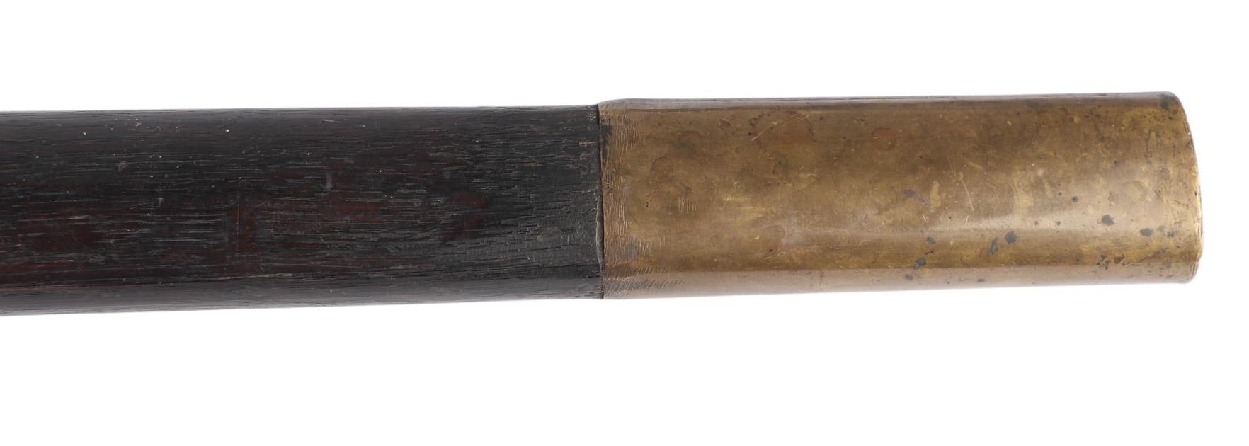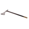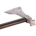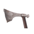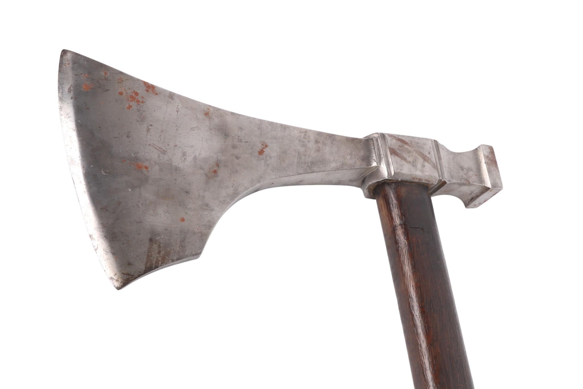 An early 19th century Napoleonic 1st Empire Sappers axe. Having a 18.5cms forged steel cutting blade to the front and a hammer at the back, locked with a brass plate and two screws to a blacked wooden handle. Overall length 86cms.