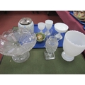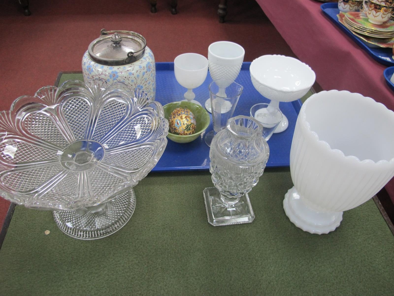 White Glass Goblets, Napco vase, Tazza, biscuit barrel (damaged), fluid measure egg, etc:- One Tray.