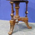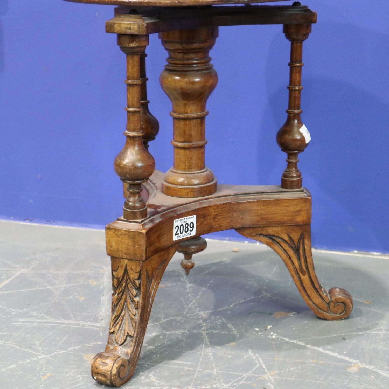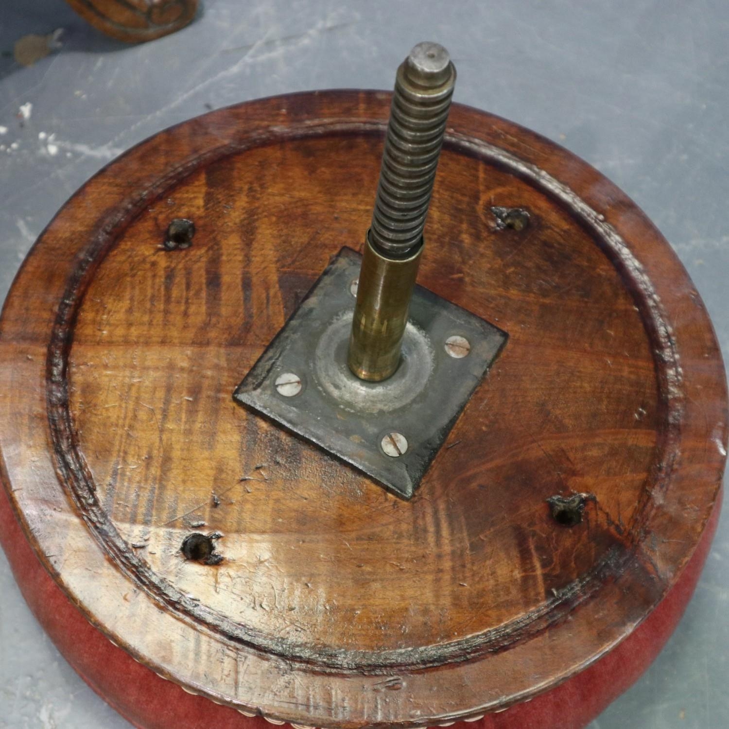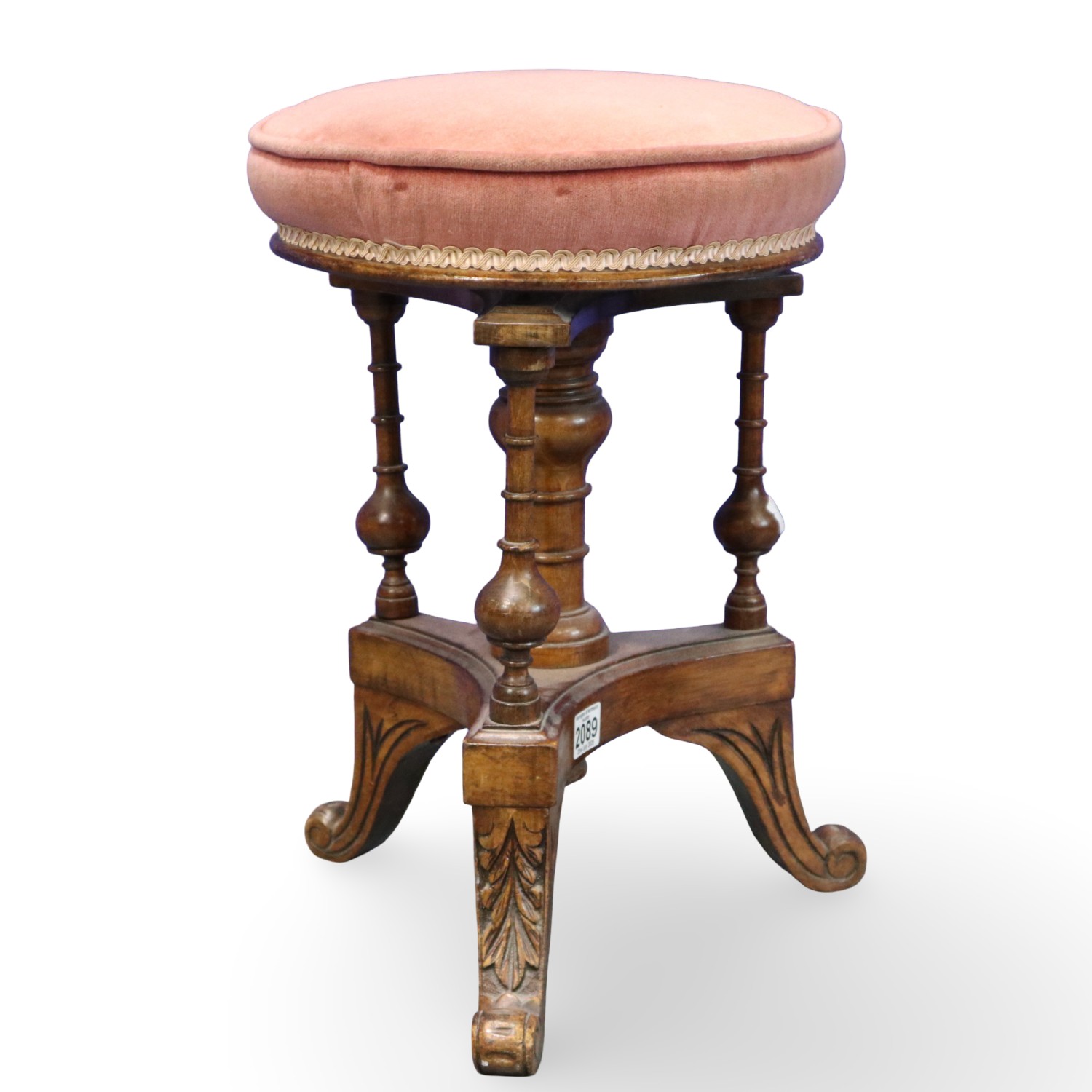 Victorian walnut revolving piano stool with later upholstered seat, rising mechanism requires attention. Tripod support good but some minor scuffs, superstructure wobbly but appears undamaged, seat does not rise. Not available for in-house P&P