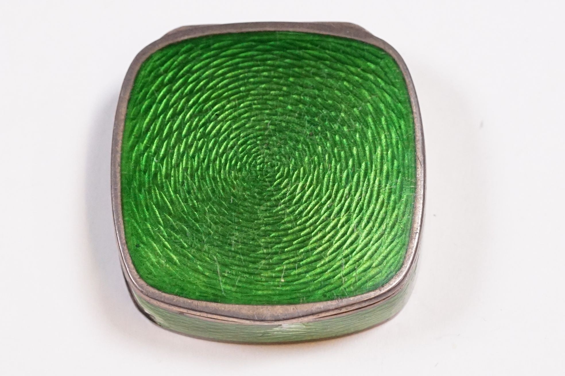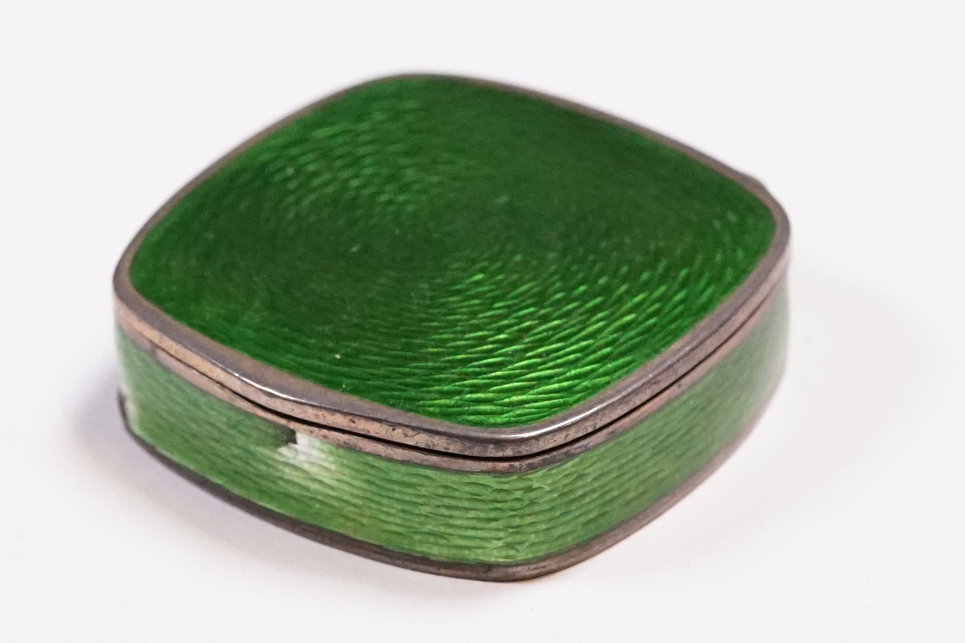 Early 20th Century David Andersen Norwegian sterling silver and green enamel engine turned trinket / pill box of cushioned form, with gilt interior, marked to bottom '925' with makers mark