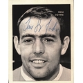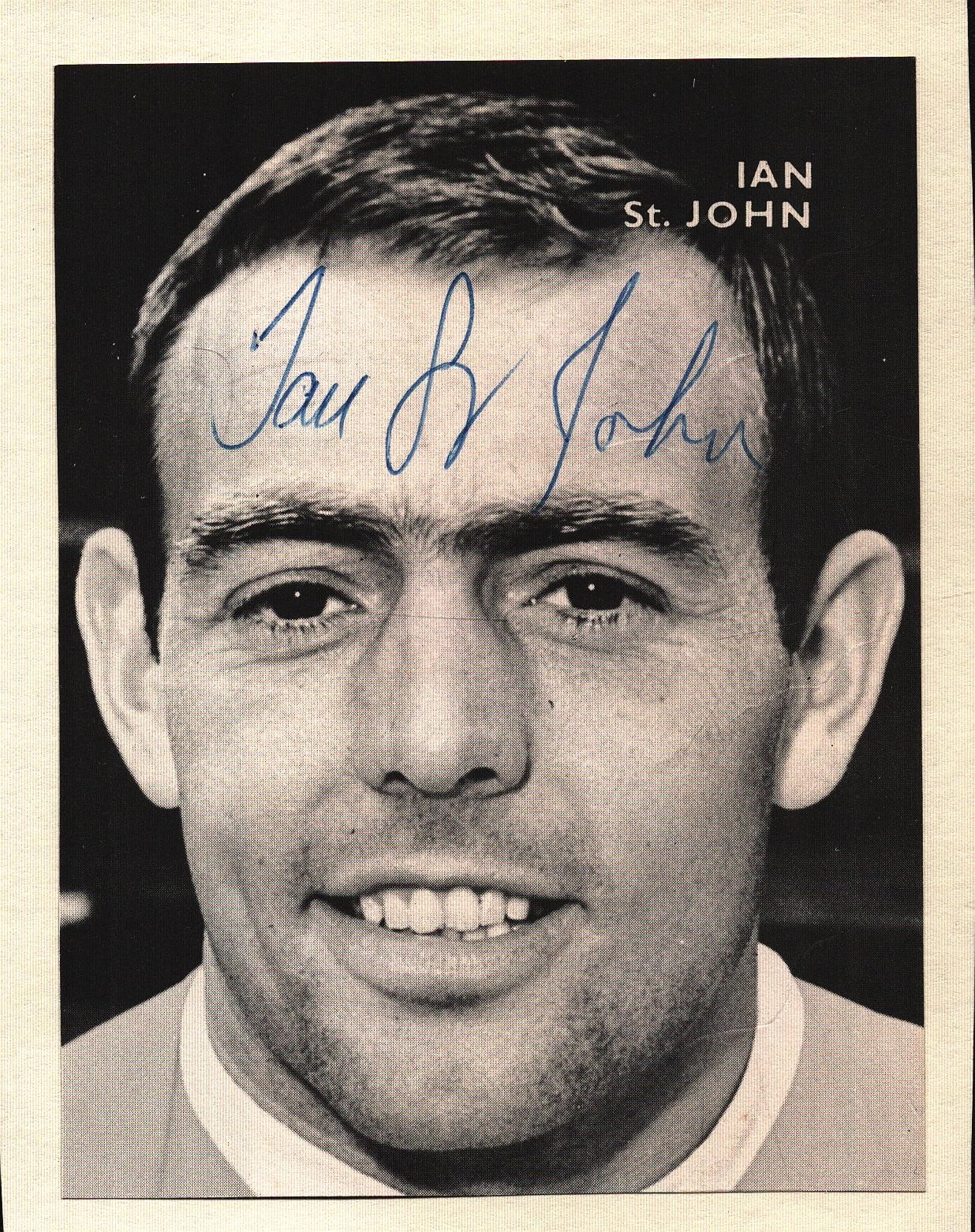 Ian St John signed magazine black & white pictured cut out affixed onto white card overall 4.25x5.5 inch Approx.