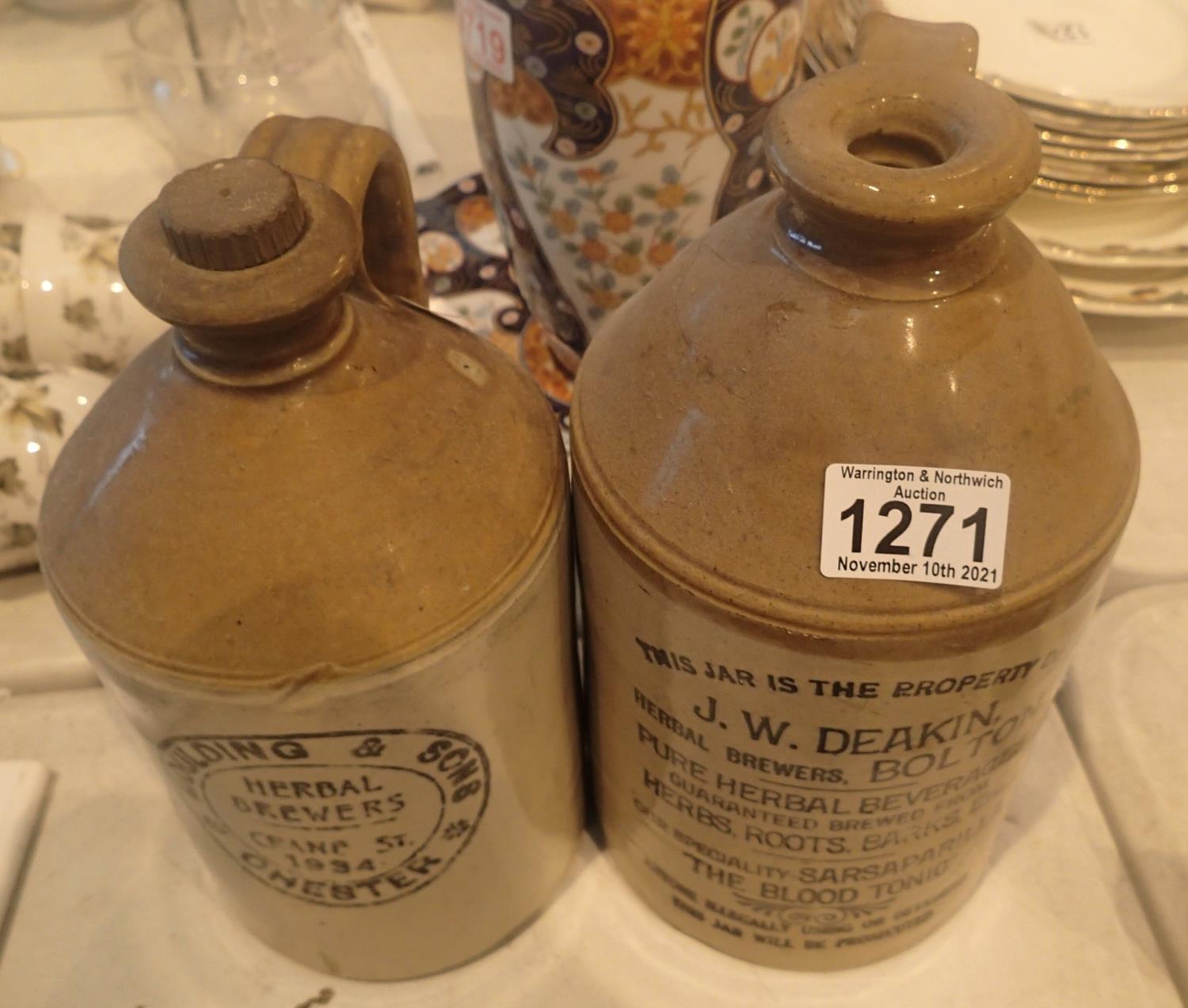 Two antique earthenware flagons. Not available for in-house P&P, contact Paul O'Hea at Mailboxes on 01925 659133