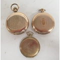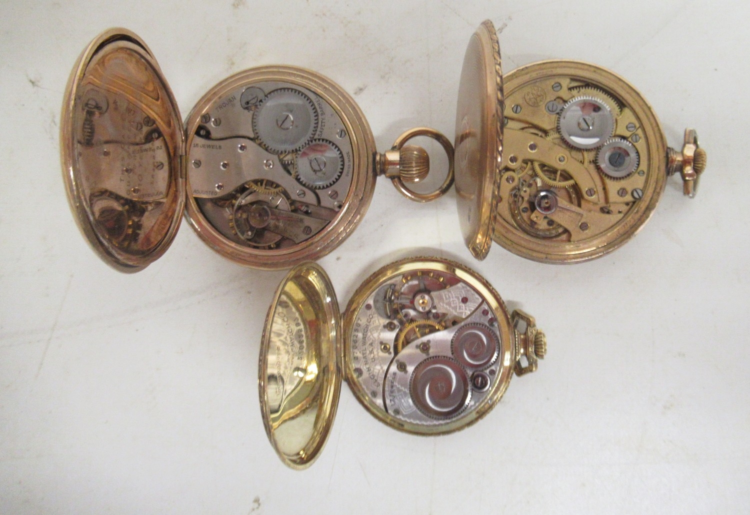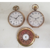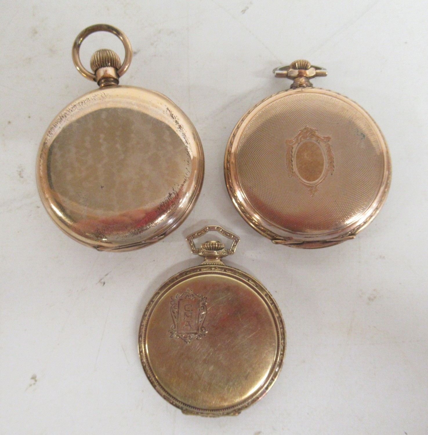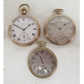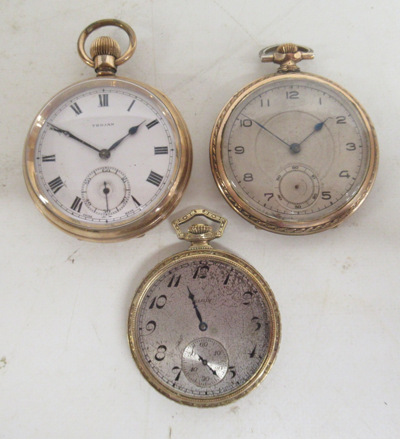 Elgin 14K rolled gold keyless pocket watch, signed silvered Arabic dial with subsidiary seconds, Wadsworth 'Commodore' case no. 6800134, Elgin 17 jewel movement, no. 27062587, D43.7mm; Trojan rolled gold keyless pocket watch, D51mm and another rolled gold keyless pocket, D50.5mm