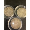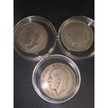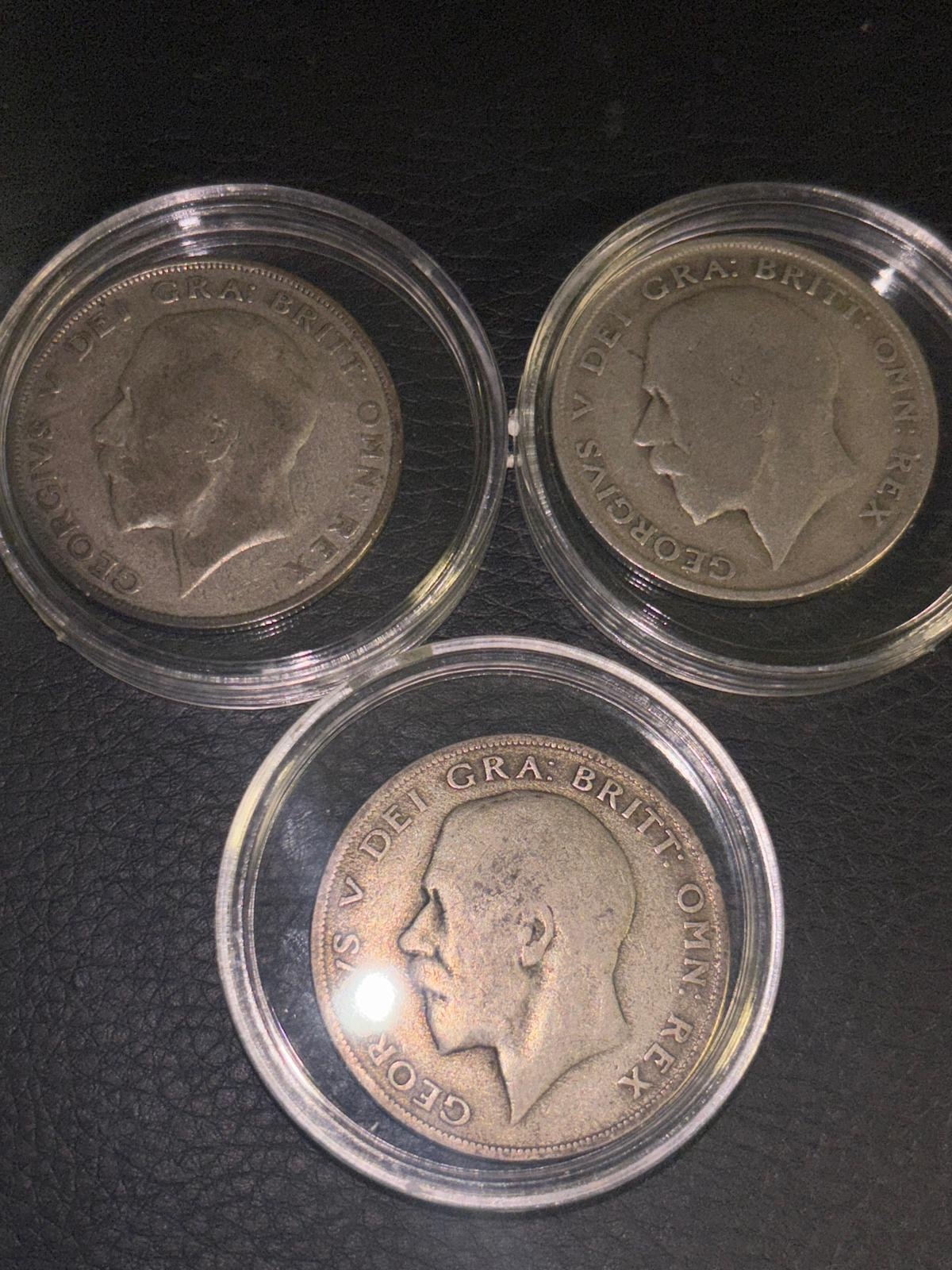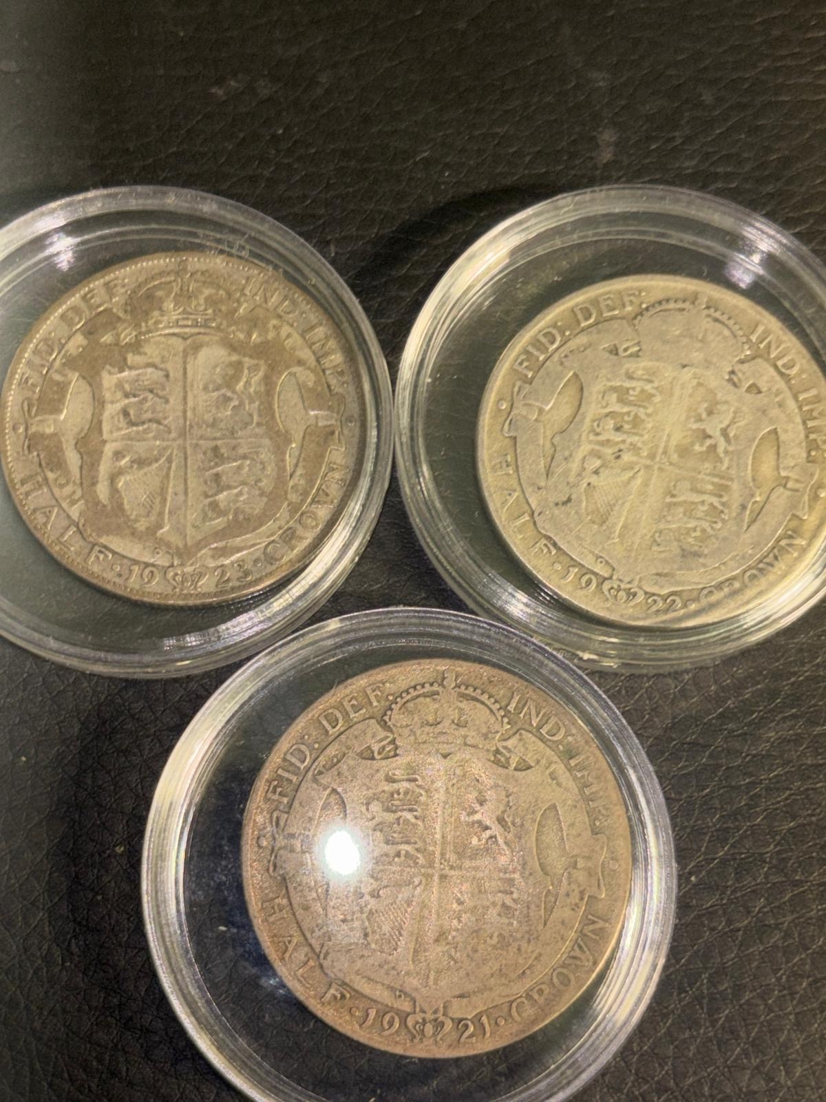 Three George V Silver Half Crowns – 1921, 1922 & 1923 – British Coin Set. A matched group of three original British half crowns from the reign of George V, dated 1921, 1922 and 1923. Struck in .500 silver, each coin features the classic crowned shield reverse and portrait of the King. All are circulated with honest wear, consistent with age, but remain clear and collectable examples. Presented in protective capsules and offered as a complete three-coin set. A nice early-date trio with strong collector appeal and solid silver content.