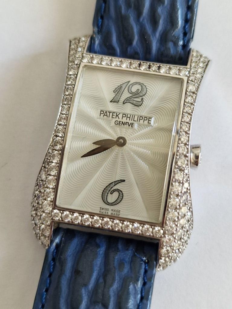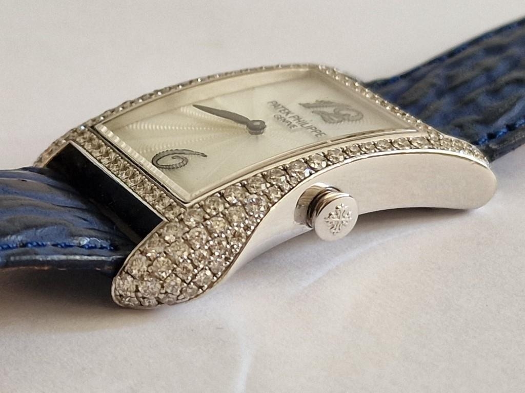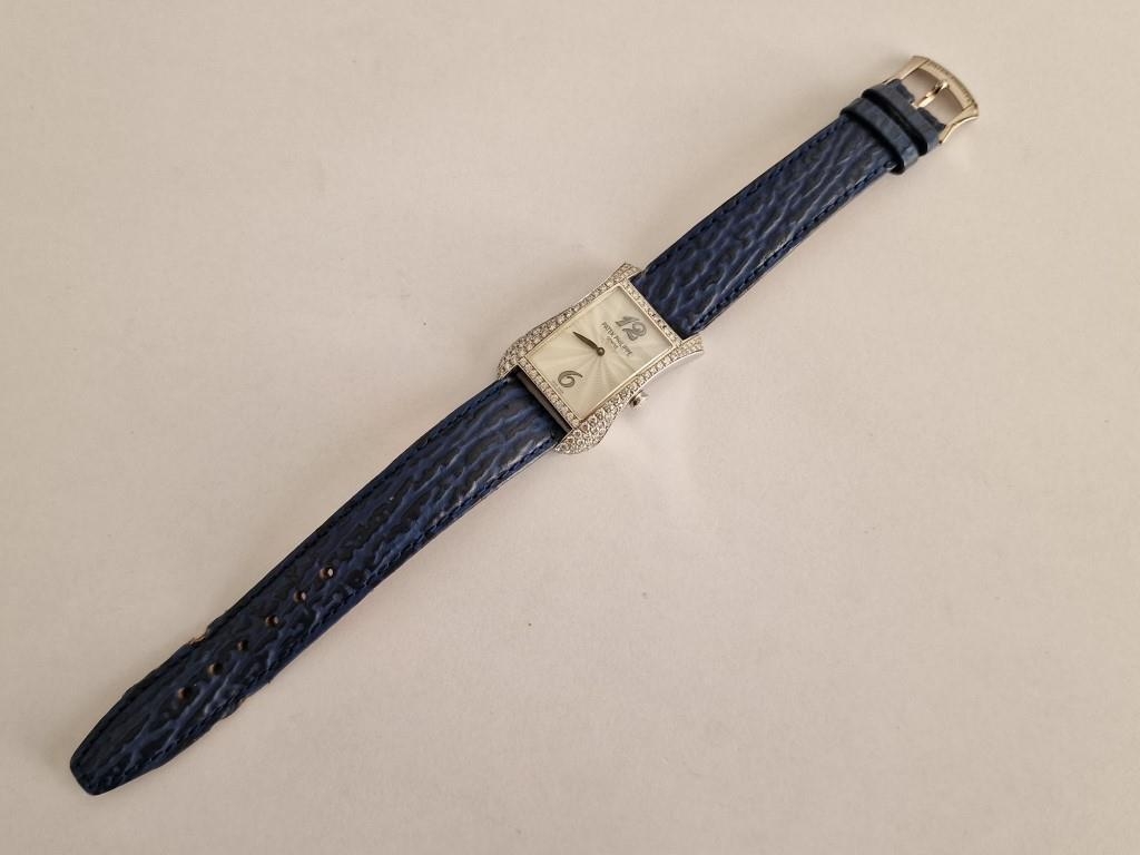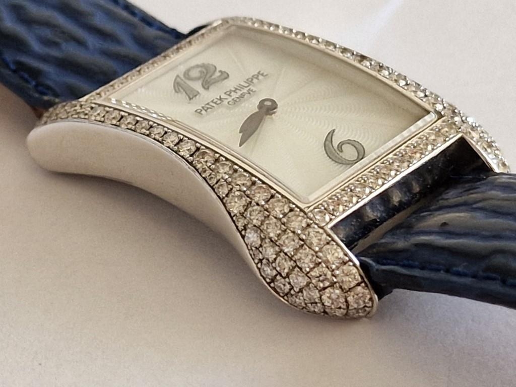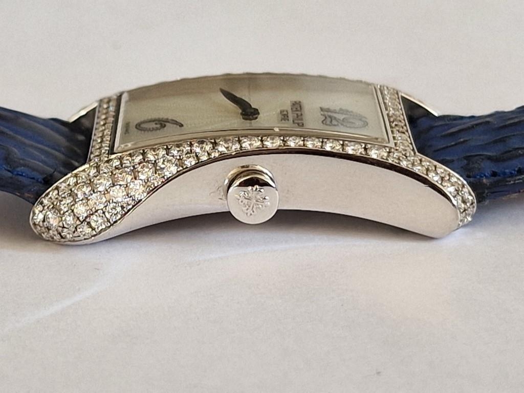 Patek Philippe Gondolo 18ct White Gold Watch #4972, with Mother of Pearl Face and Diamond Encrusted Bezel & Shoulders, Swiss Made, Six Jewels, E15 Calibre Movement, No. 36XXXXX, Quartz, * Running When Lotted *, Case Size Approx. 39 x 22.5mm, on Replacement Blue Leather Strap with Original P.P Gold Buckle