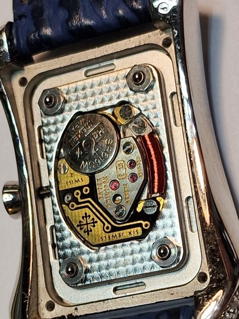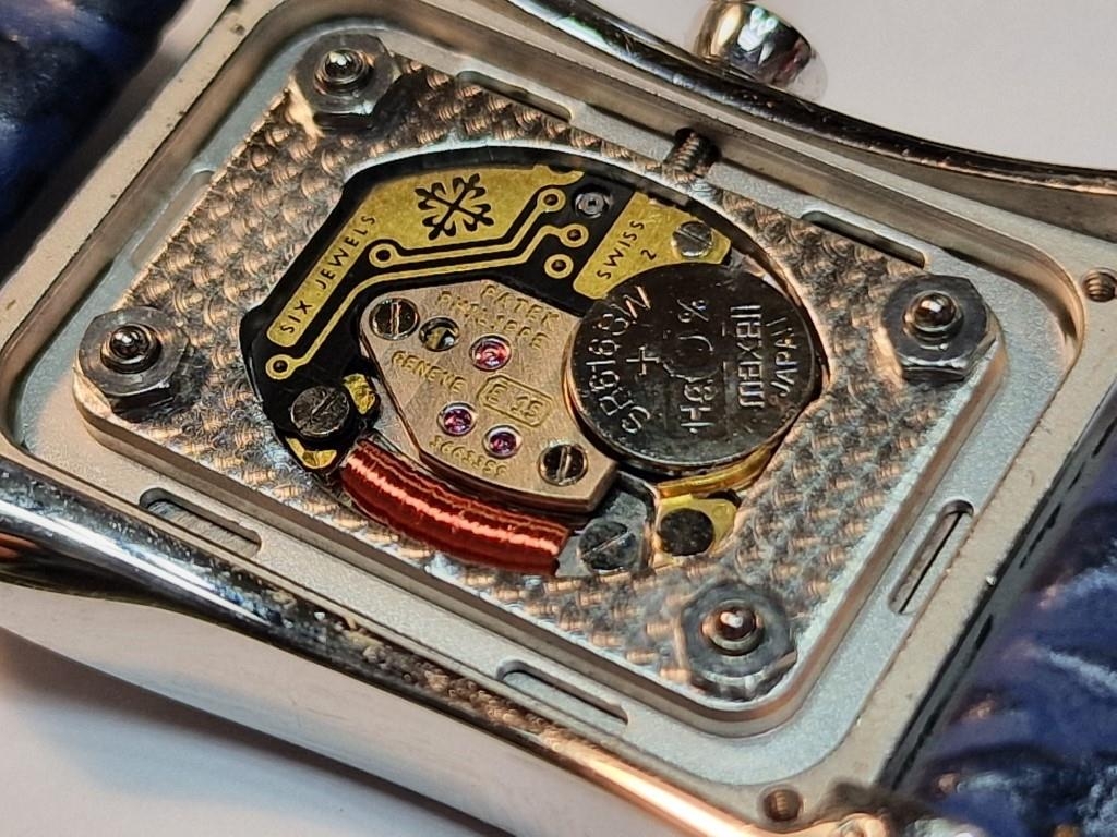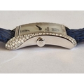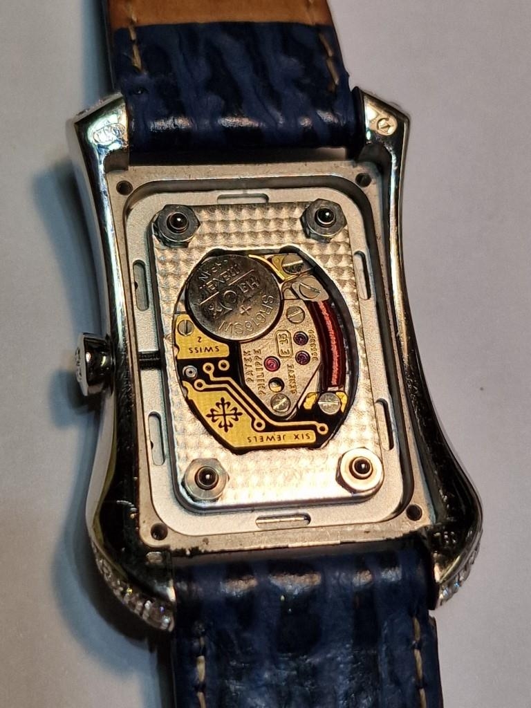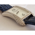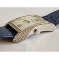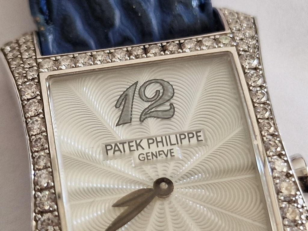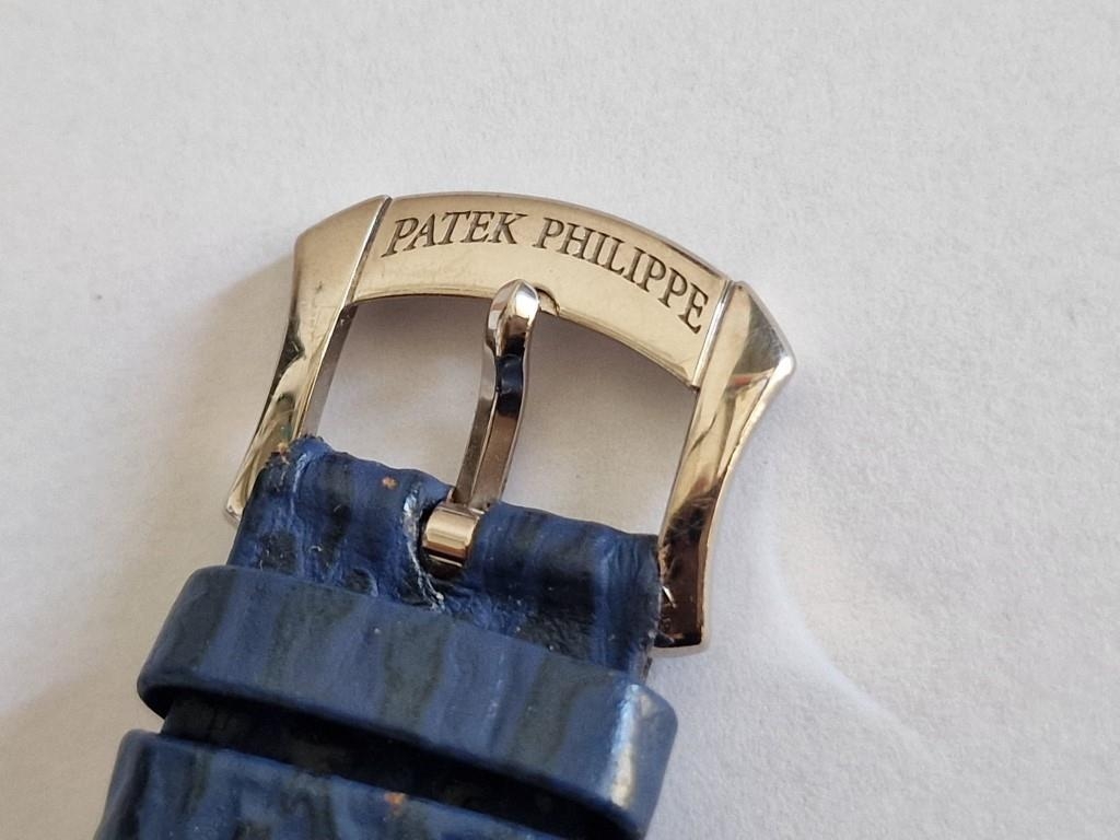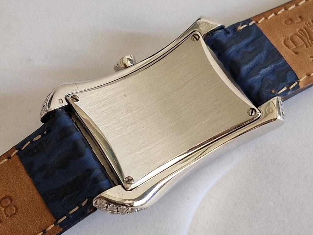 Patek Philippe Gondolo 18ct White Gold Watch #4972, with Mother of Pearl Face and Diamond Encrusted Bezel & Shoulders, Swiss Made, Six Jewels, E15 Calibre Movement, No. 36XXXXX, Quartz, * Running When Lotted *, Case Size Approx. 39 x 22.5mm, on Replacement Blue Leather Strap with Original P.P Gold Buckle