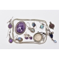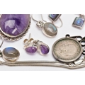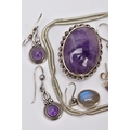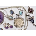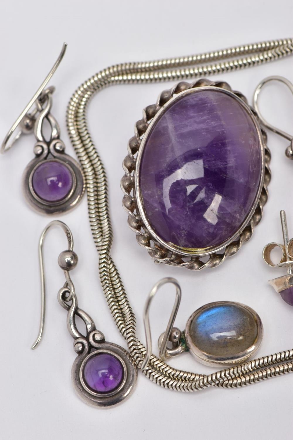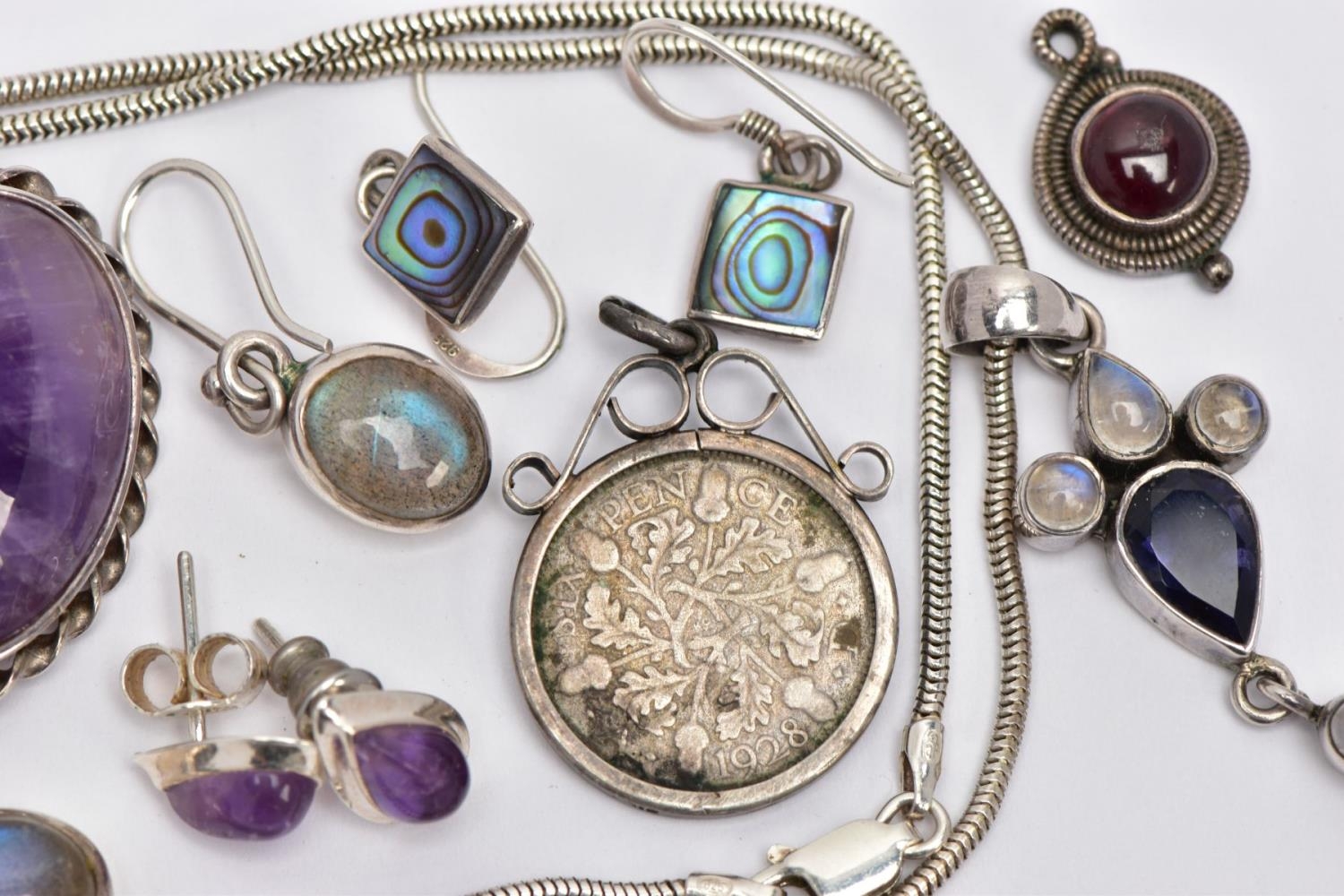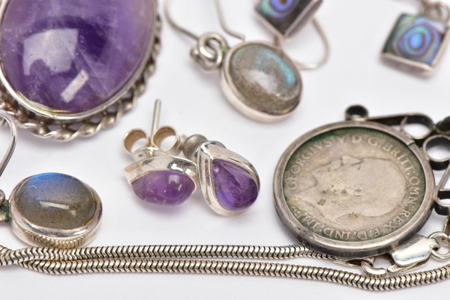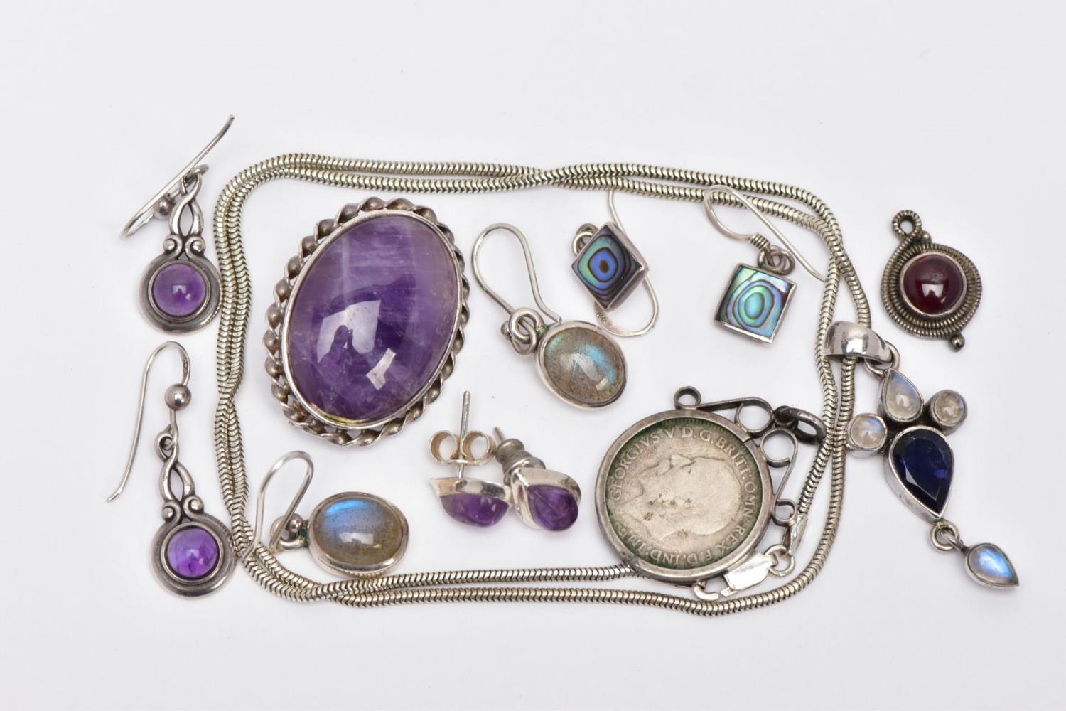 A BAG OF ASSORTED WHITE METAL JEWELLERY, to include a silver amethyst cabochon brooch hallmarked Birmingham, a moonstone pendant necklace, stamped '925' suspended from a white metal snake chain fitted with a lobster claw clasp stamped '925', a pair of white metal amethyst drop earrings with fishhook fittings stamped '925', a pair of amethyst stud earrings, a pair of white labradorite drop earrings with fishhook fittings stamped '925', a pair of white metal abalone shell drop earrings, stamped '925', a garnet cabochon pendant stamped '925' and a mounted George V six pence mount stamped 'sil', approximate gross weight 32.7 grams